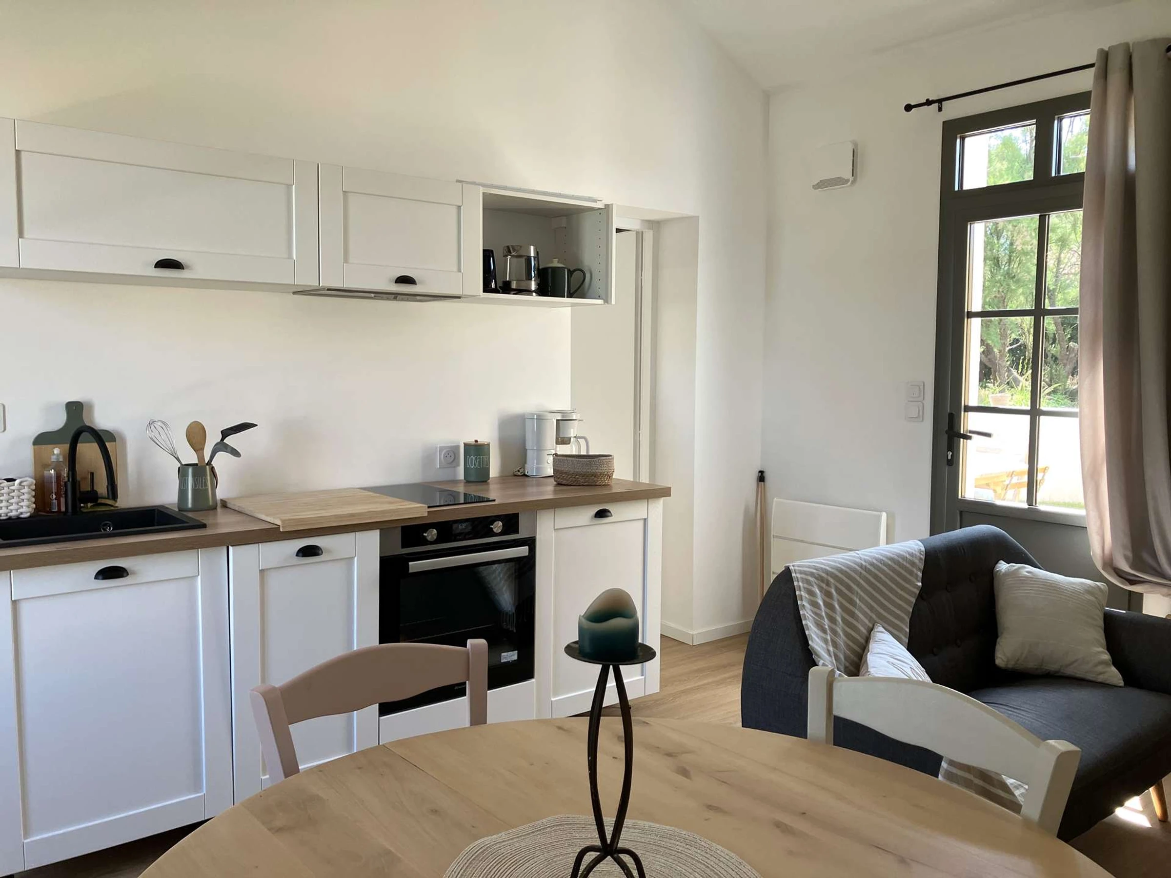 Das helle Wohnzimmer besteht aus einer kleinen Einbauküche mit Essbereich und einem gemütlichen Ruhebereich. Die beiden Schlafzimmer sind unabhängig und verfügen jeweils über ein Doppelbett.