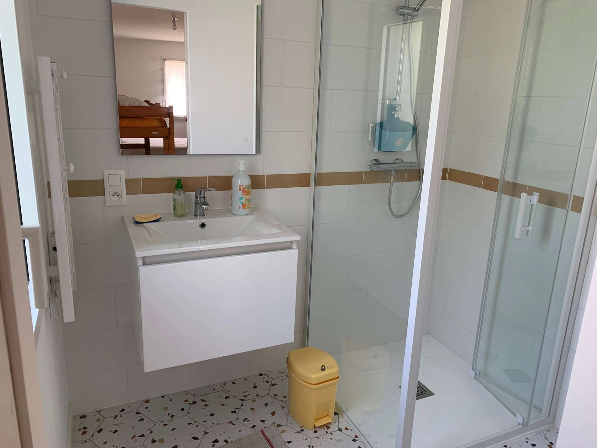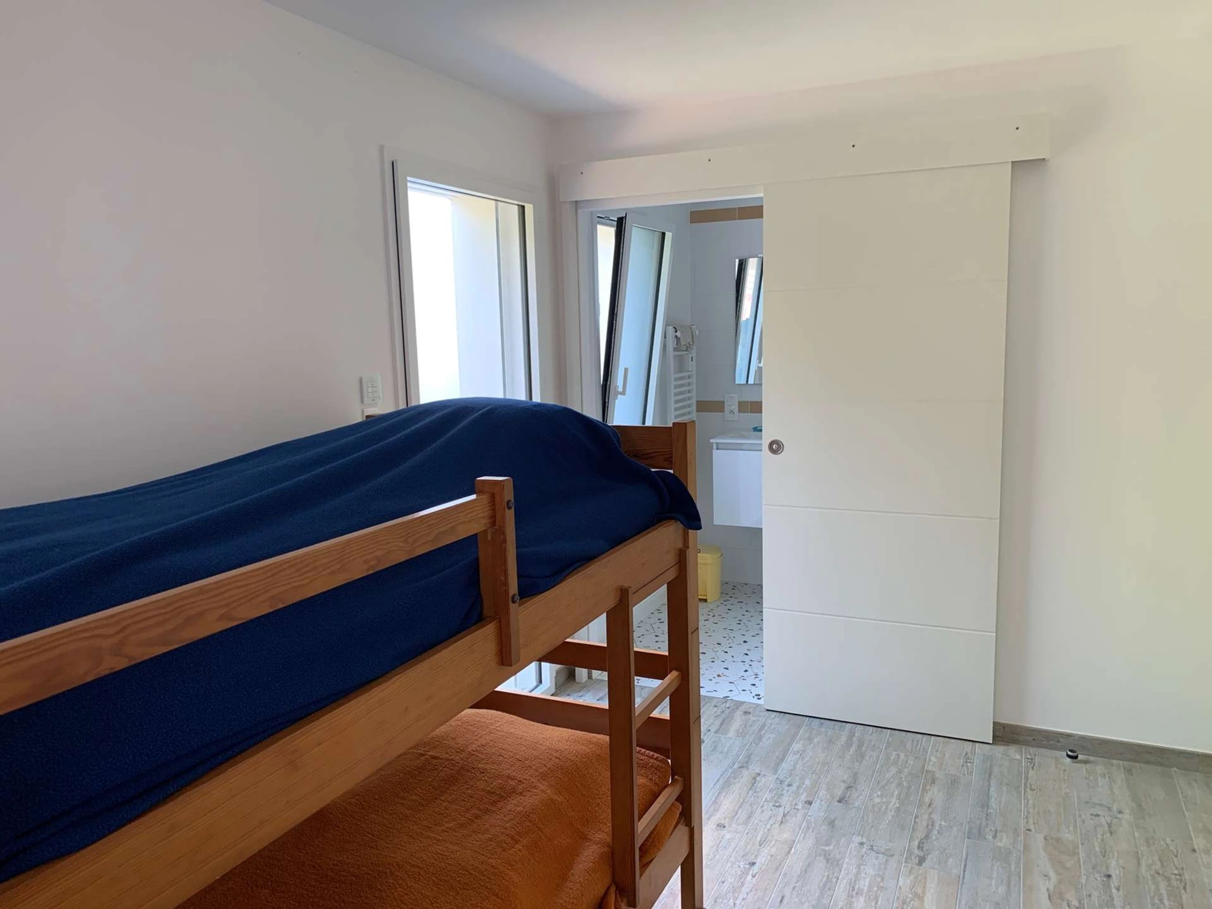 Ein Eingangsbereich mit voll ausgestatteter Küche (Gasherd und Backofen, Mikrowelle, Kühlschrank, Gefrierschrank, Kleingeräte), ein großes Wohnzimmer mit Essbereich und Sitzecke mit Sofa, Couchtisch und Fernseher, ein Badezimmer mit Dusche, Waschbecken und WC, ein Schlafzimmer mit Doppelbett und Stauraum, ein Schlafzimmer mit Doppelbett und 80 cm breitem Etagenbett, ein angrenzendes Badezimmer mit ebenerdiger Dusche, Waschbecken und Handtuchwärmer, ein separates WC, ein schattiger Außenbereich mit Gartenmöbeln, ein Ruhebereich mit Liegestühlen und ein Parkplatz auf dem Grundstück.