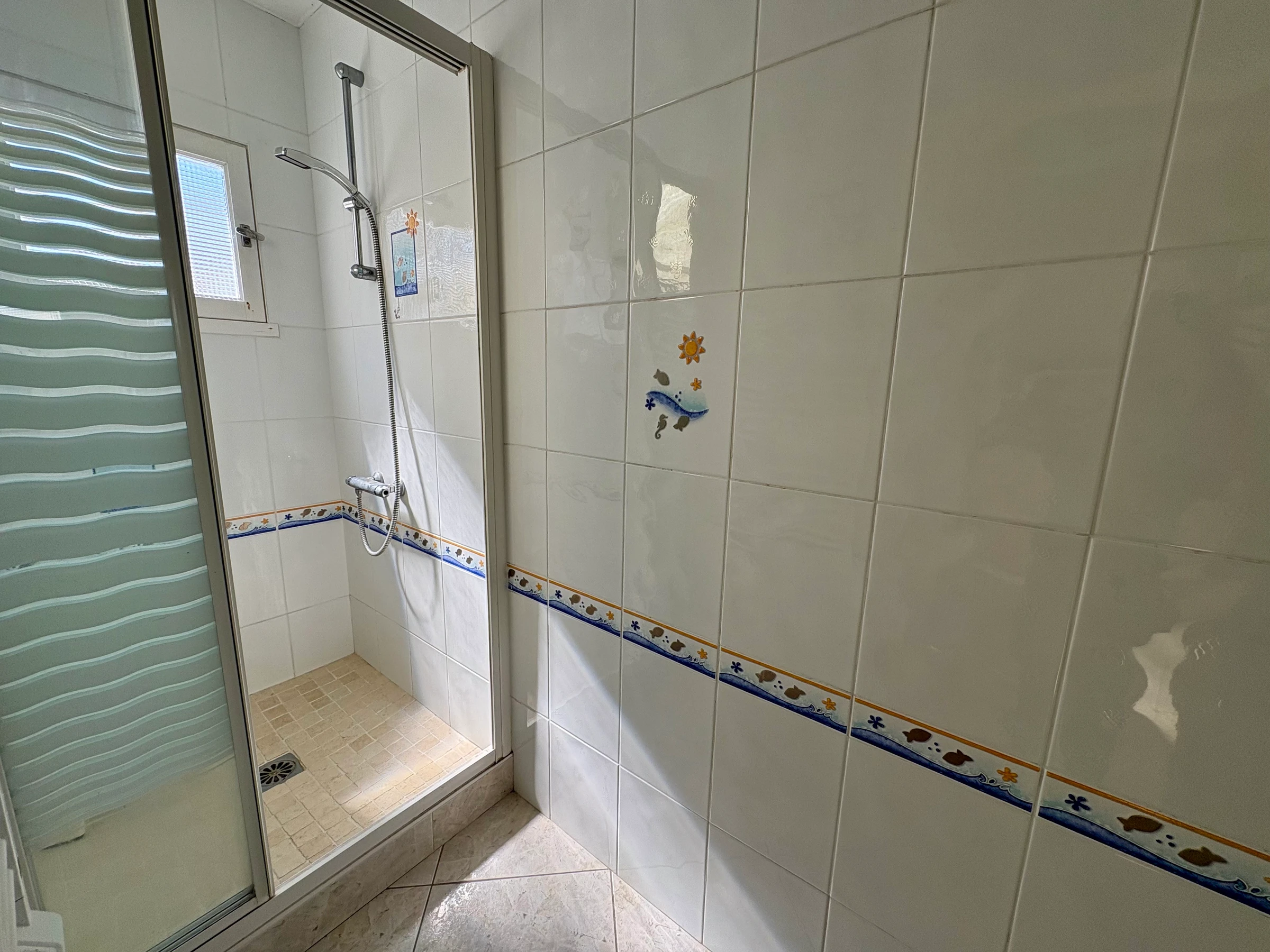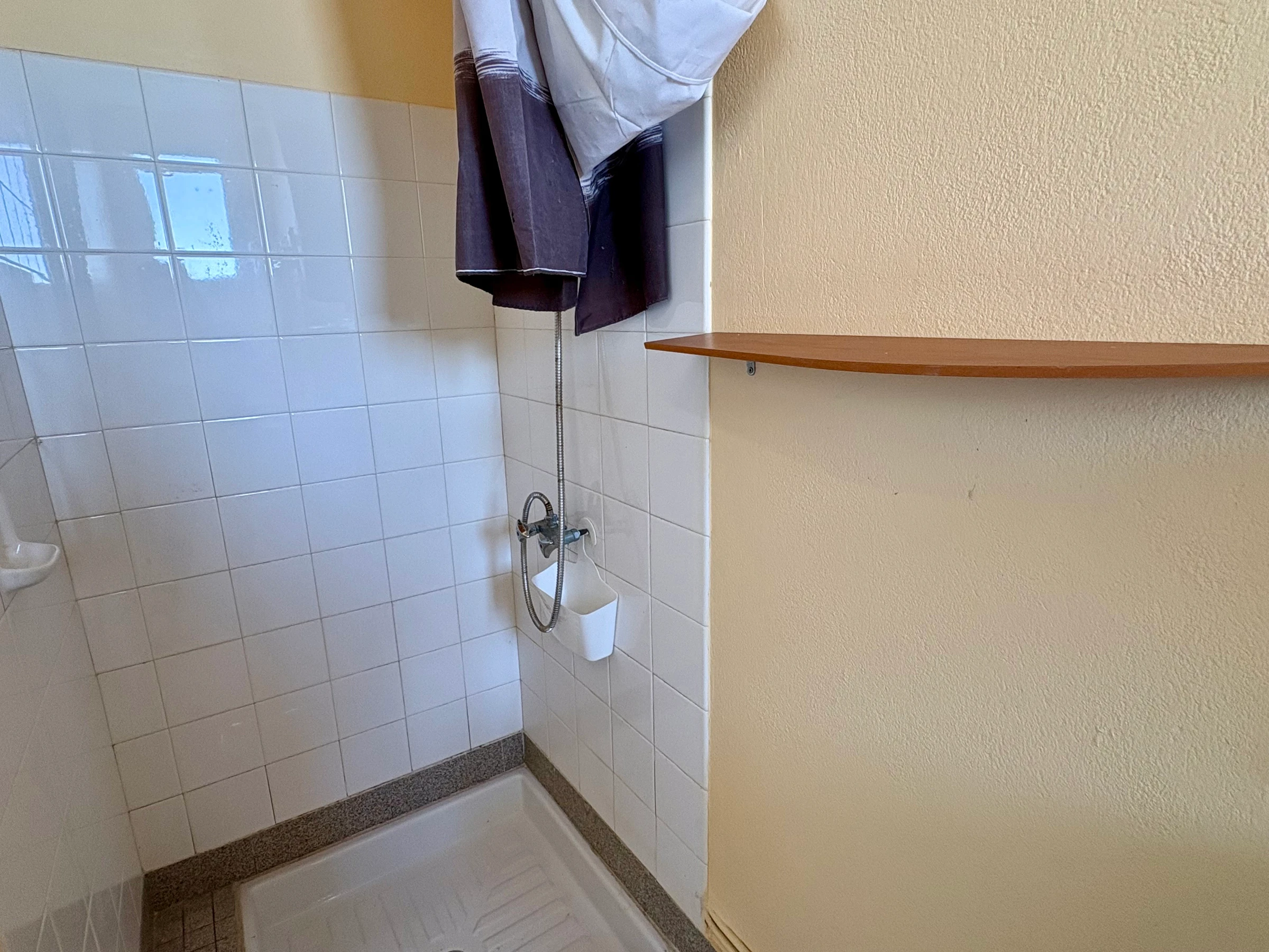 - Badezimmer mit Dusche, WC und Waschbecken.