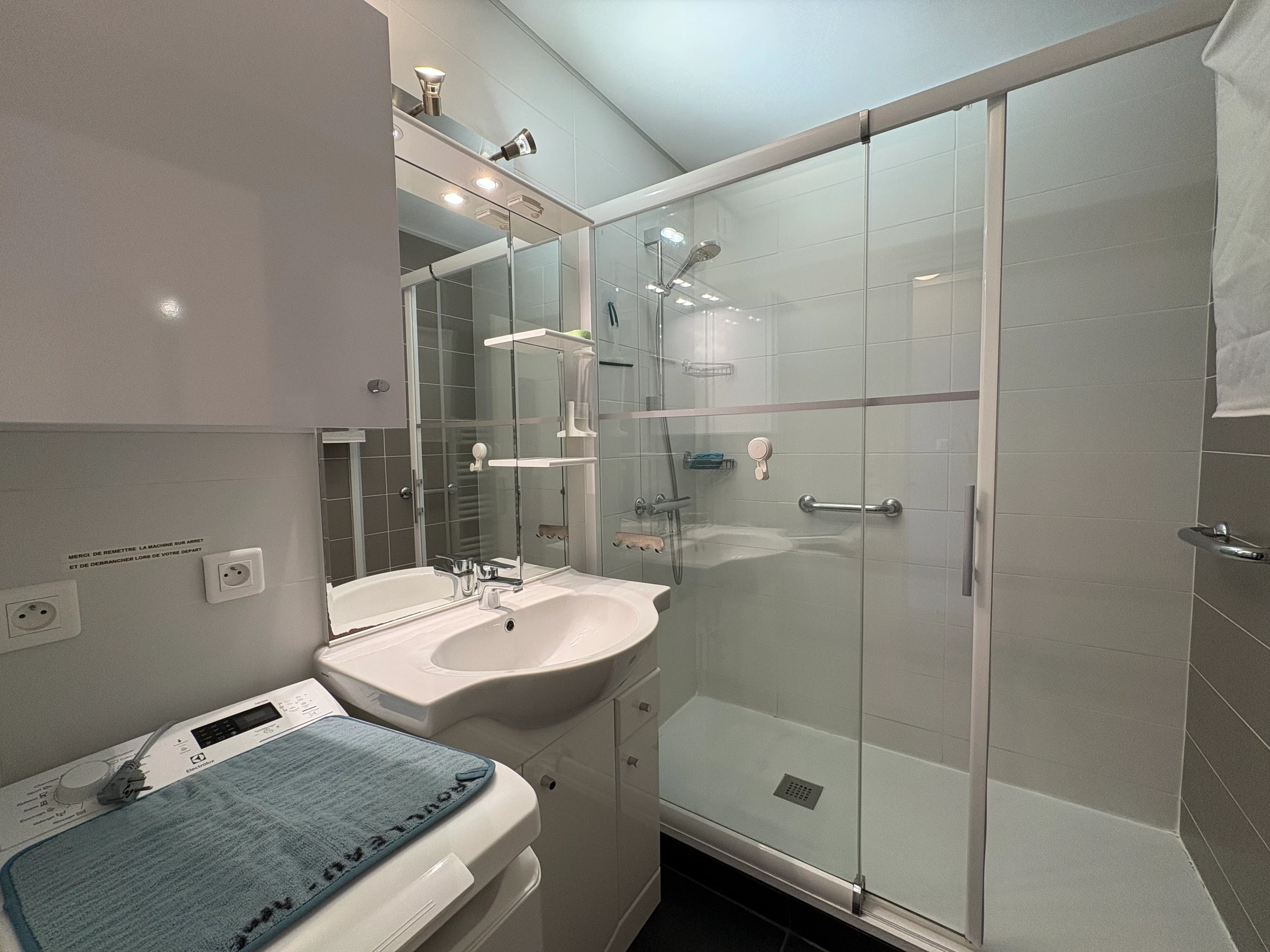 - Badezimmer mit geräumiger Dusche und einem Waschbecken und 1 Waschmaschine