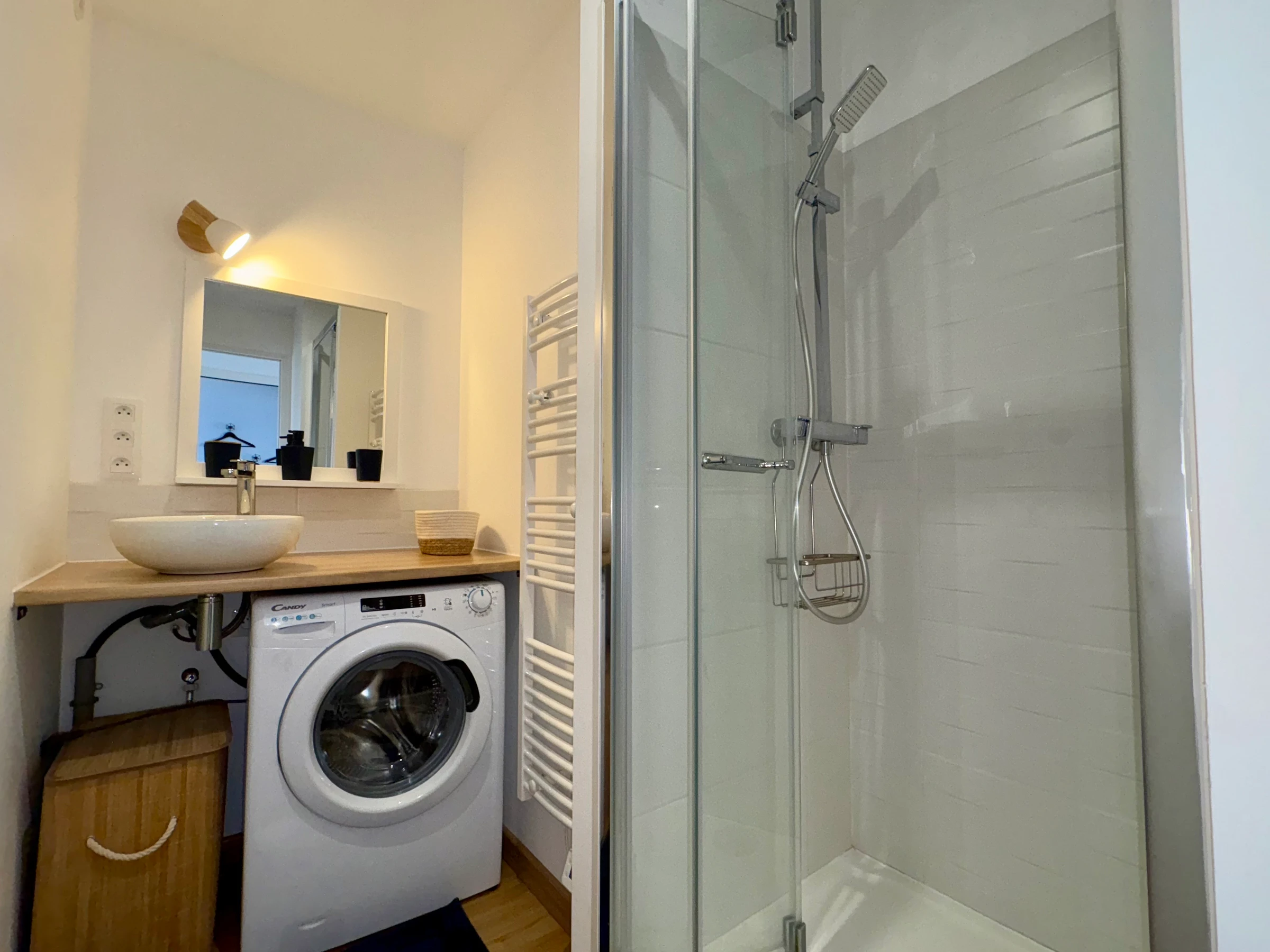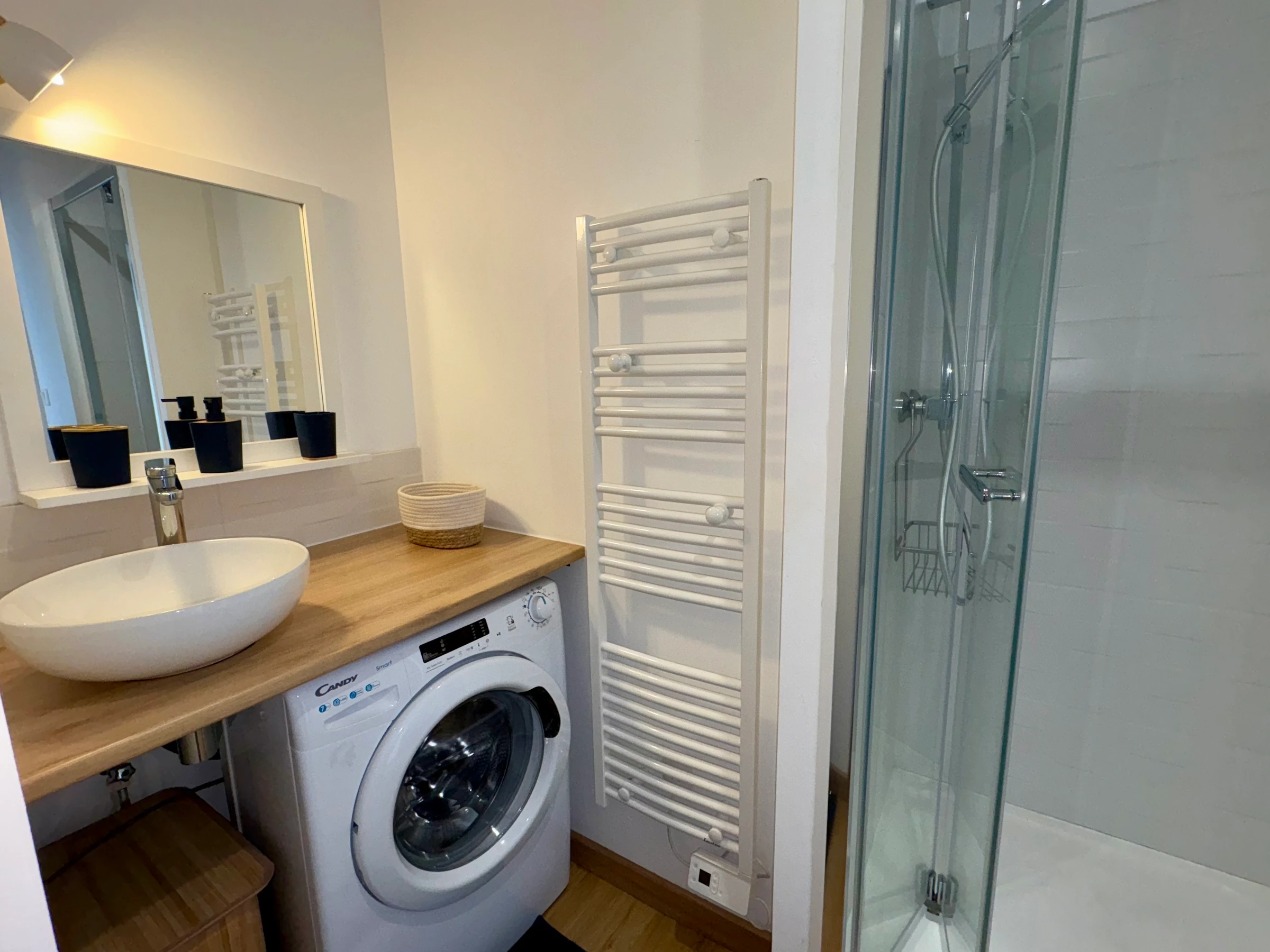 Badezimmer: Duschkabine + Waschbecken + elektrischer Handtuchwärmer - Waschmaschine