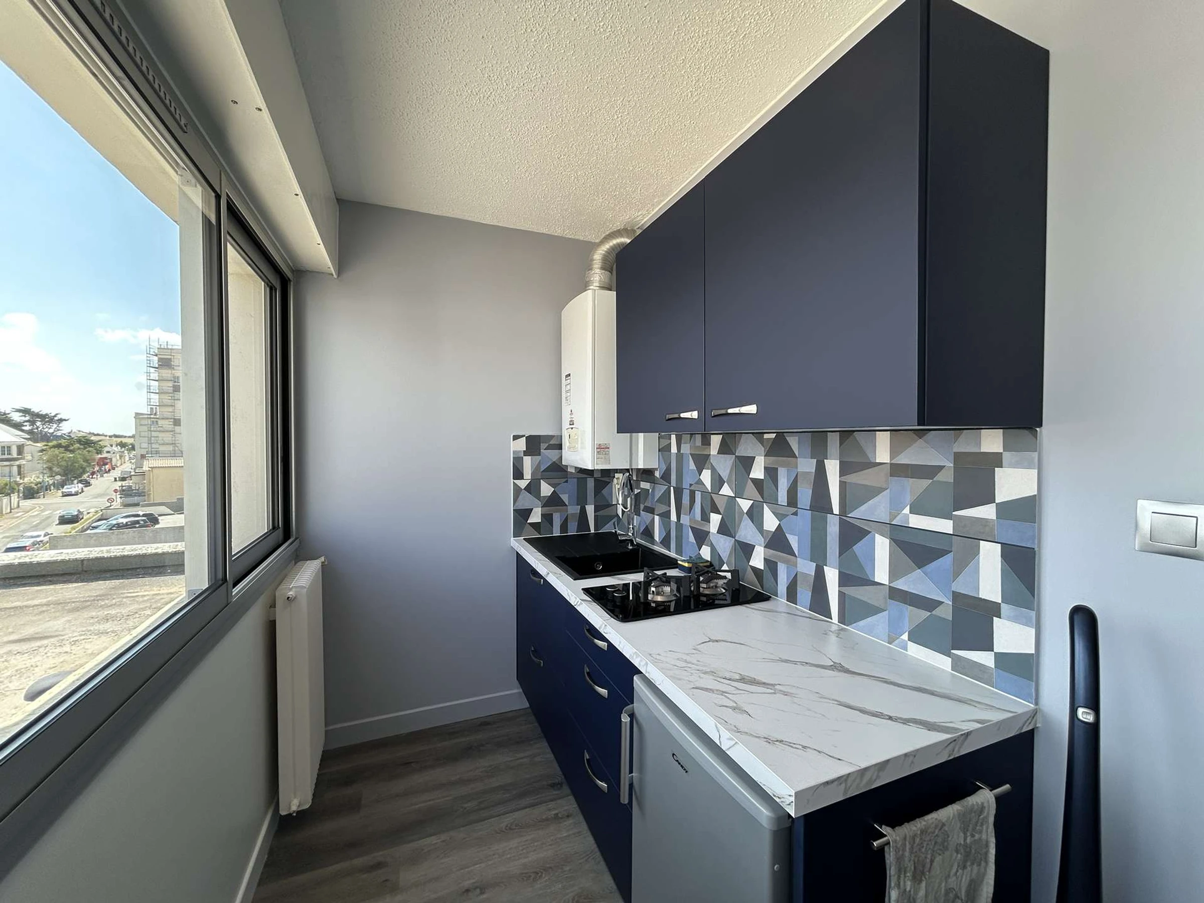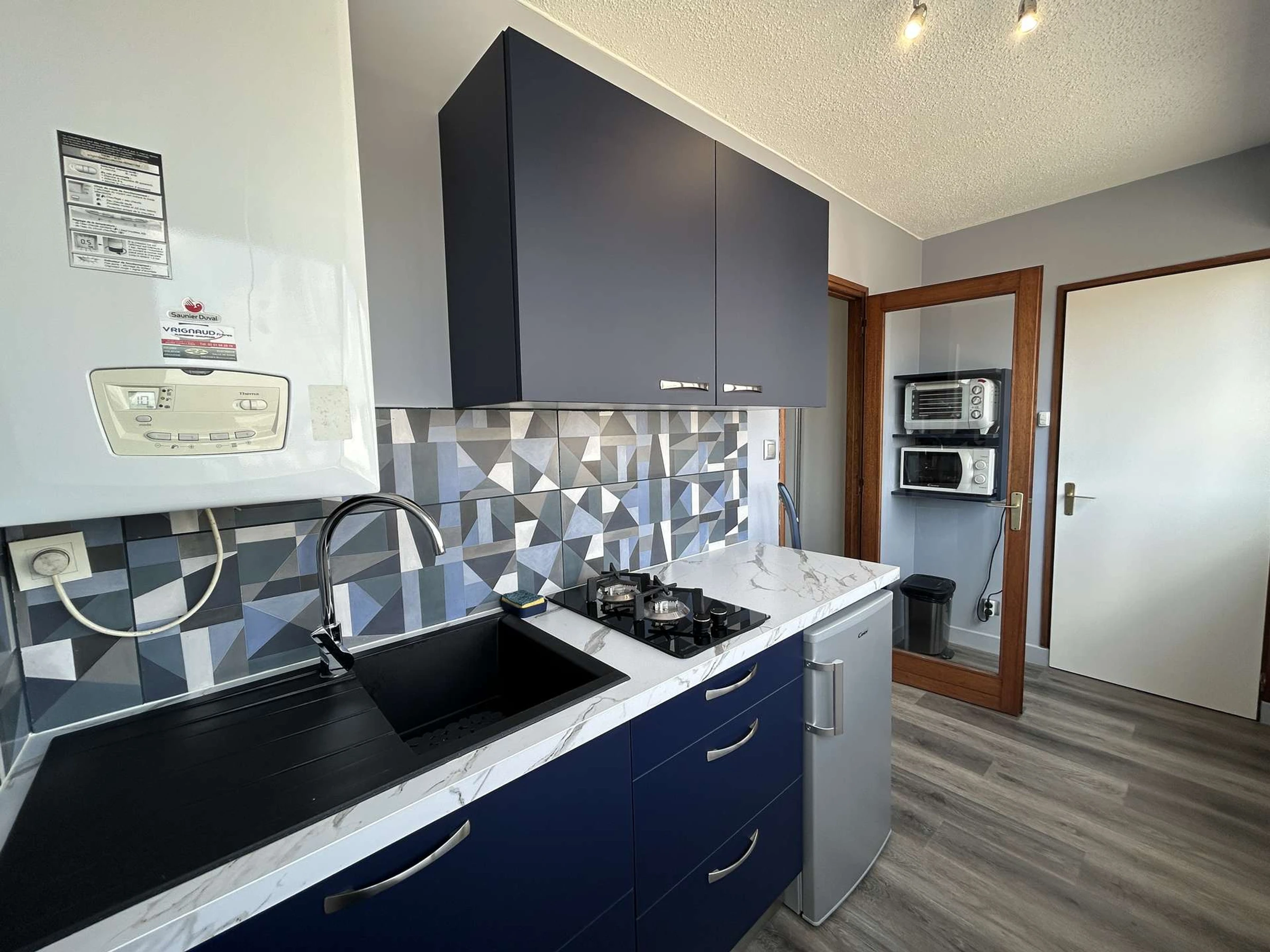 Diese Ferienunterkunft im 2. Stock bietet allen nötigen Komfort: ein helles Wohnzimmer mit einem 2-Sitzer-Schlafsofa, einem 1-Sitzer-Kaminsessel und einem Fernseher sowie eine separate, brandneue und voll ausgestattete Küche (Mikrowelle, Mini-Backofen, 2 Gasbrenner, Kühlschrank mit Gefrierfach) und einem Schrank. Ein modernes Badezimmer mit WC rundet diesen Raum ab.