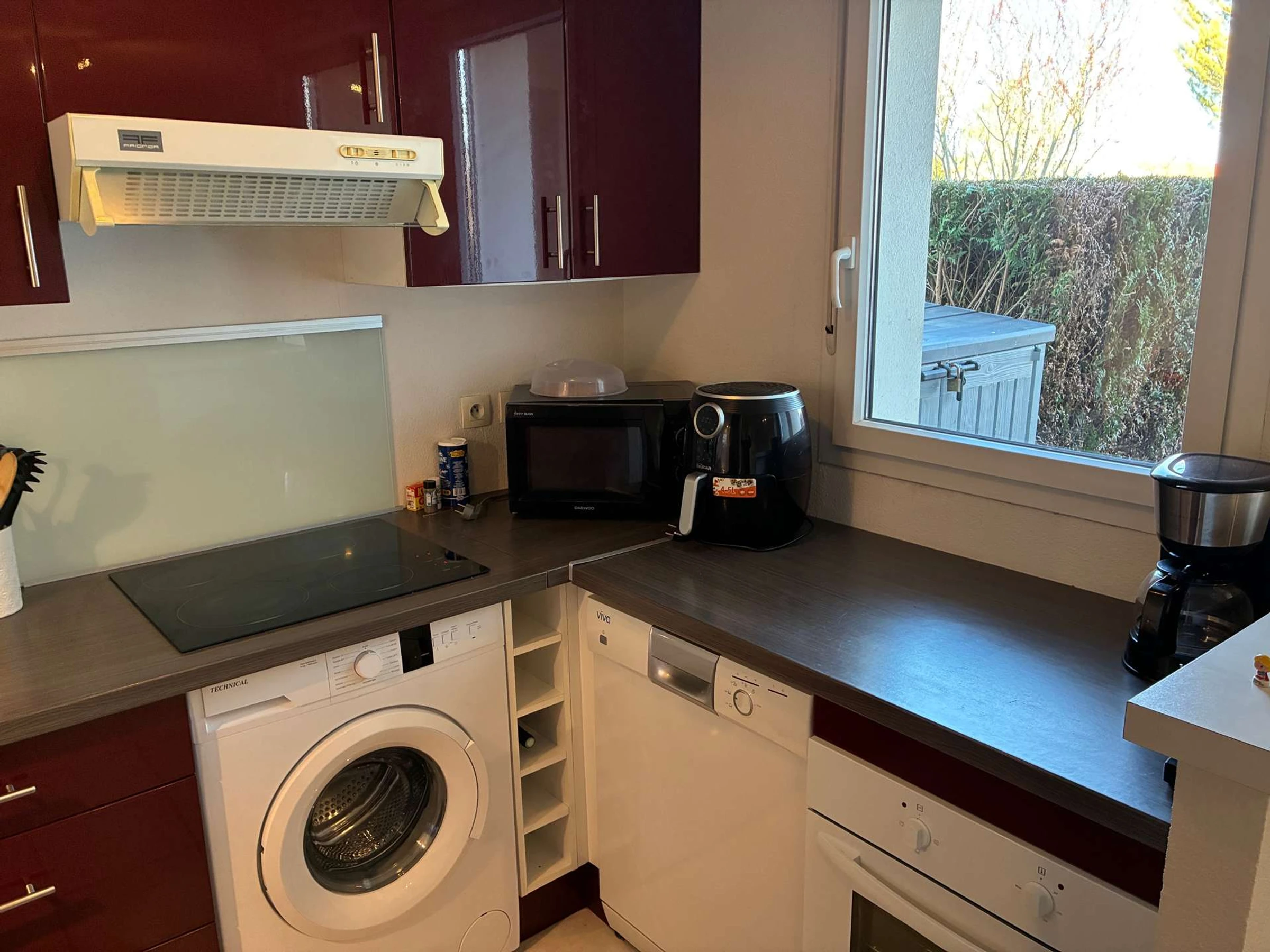 Offene Einbauküche (Kühl-/Gefrierkombination, Induktionskochfeld, Backofen, Mikrowelle, Geschirrspüler, Waschmaschine).