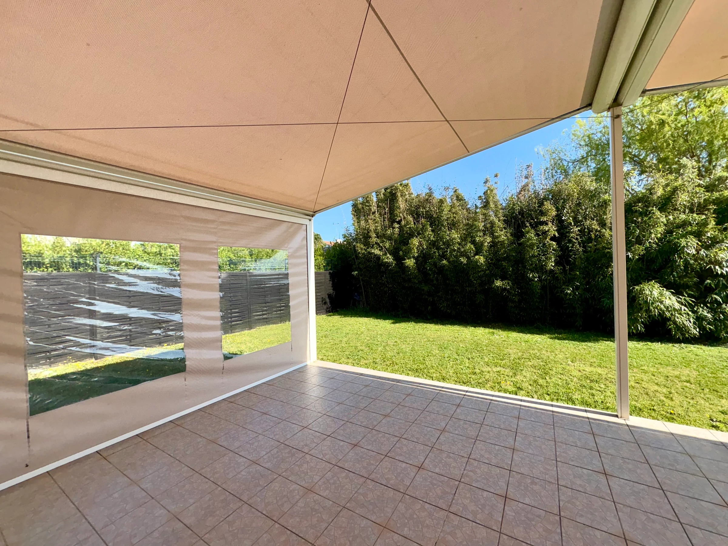 **GROSSE TERRASSE MIT ELEKTRISCHER MARKISE AUF DACH UND SEITEN, GARTENTISCH UND SONNENLIEGEN**