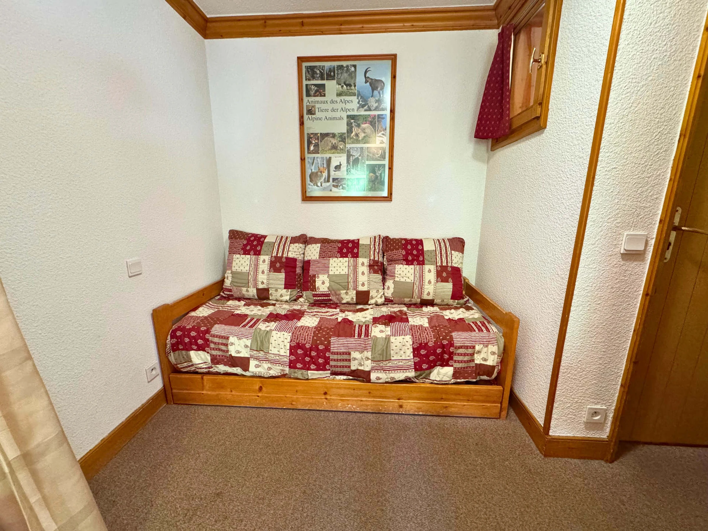 Wohnzimmer: Sofa, Fernseher, DVD-Player, Bluetooth-Lautsprecher, Nische mit Vorhang im Wohnzimmer: 1 Einzelschlafsofa (80 cm) + 1 Ausziehbett (80 cm)