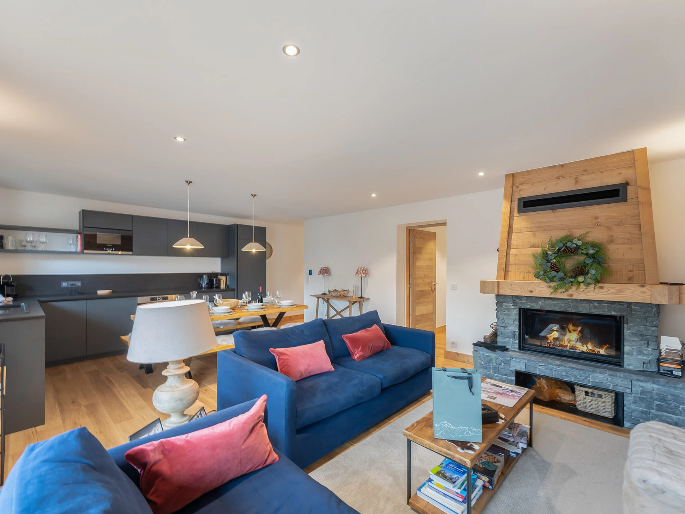 Offene Küche im Wohnzimmer: 4 Induktionskochfelder, Mikrowelle, Backofen, Dunstabzugshaube, Kühlschrank, Geschirrspüler, Nespresso-Kaffeemaschine, Wasserkocher, Toaster, Zitruspresse, Mixer.