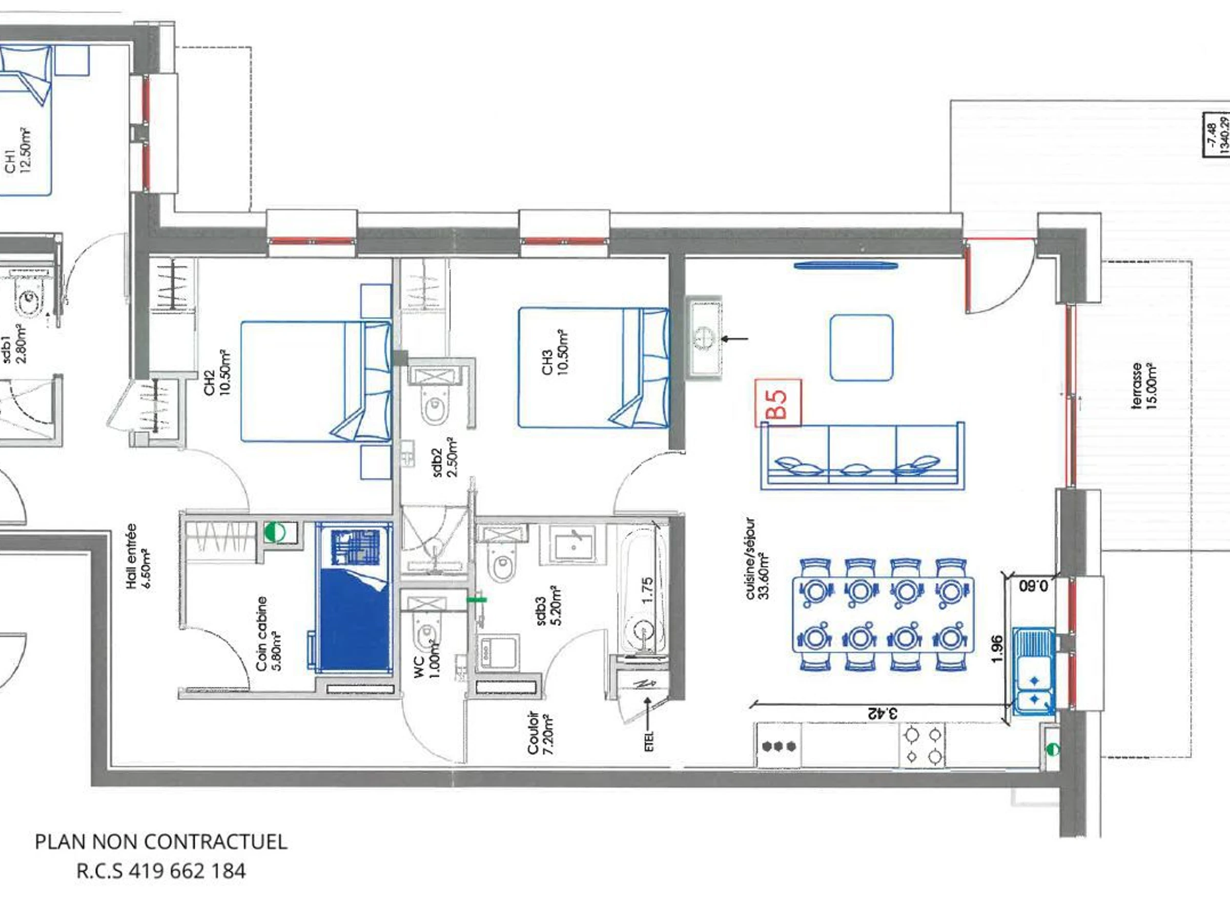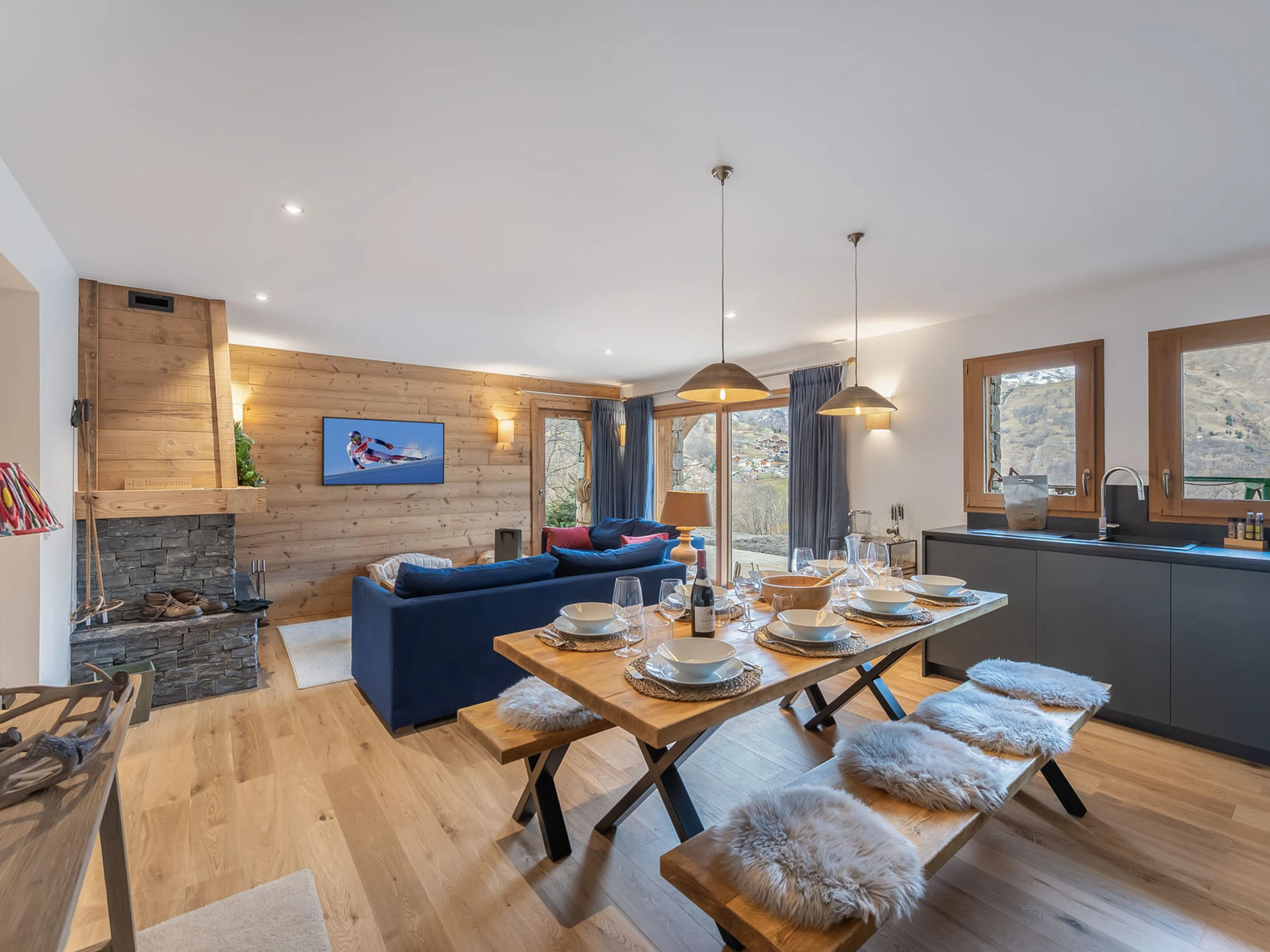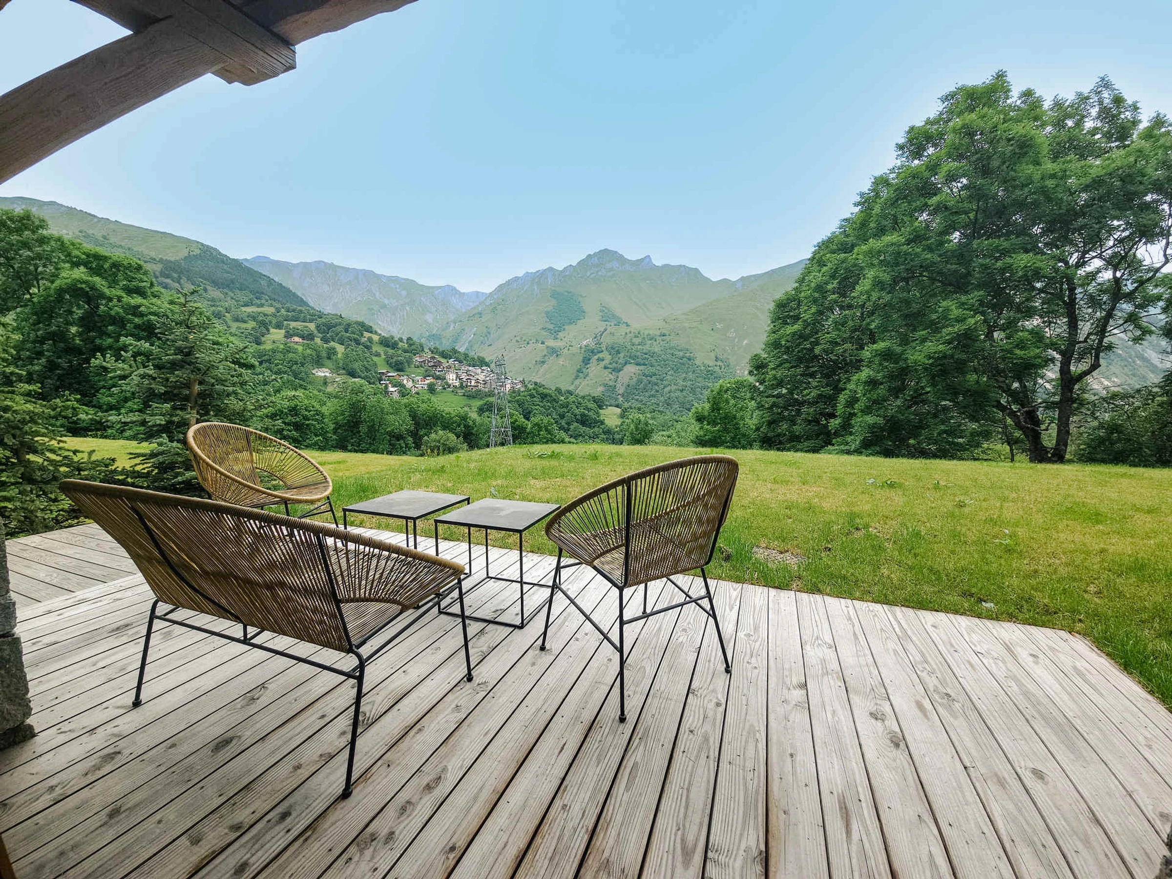 Apartment LE BOUQUETIN – LES CHALETS DU CHEVAL NOIR Nr. B5, 4-Zimmer-Hütte mit 3 Schlafzimmern für 8 Personen, 100 m², Westterrasse im Erdgeschoss mit Garten und Panoramablick auf das Tal.