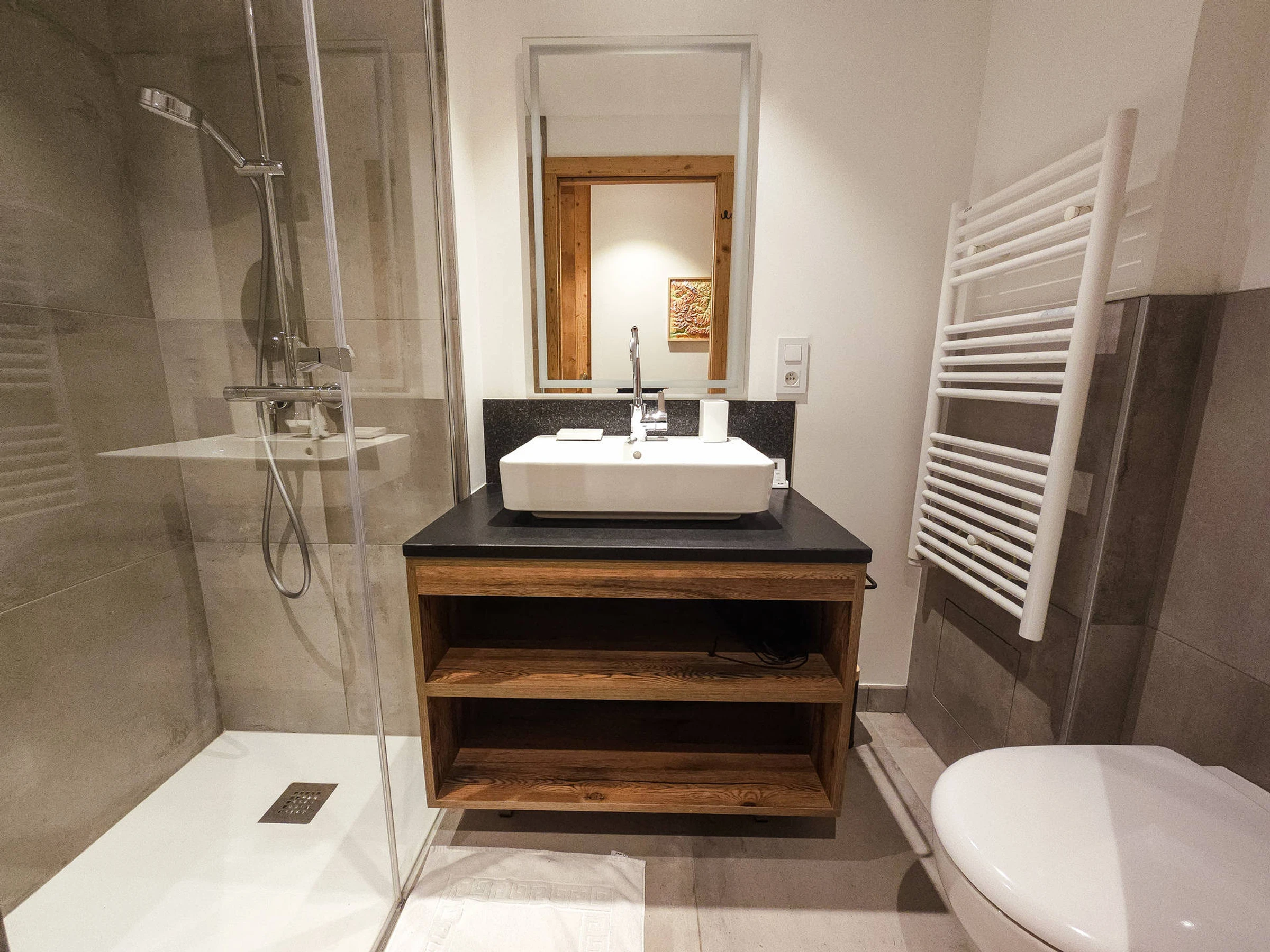 Schlafzimmer 1: 1 Doppelbett (180 x 200), Kleiderschrank, eigenes Badezimmer (Waschbecken, Dusche, Handtuchwärmer, Föhn, WC)