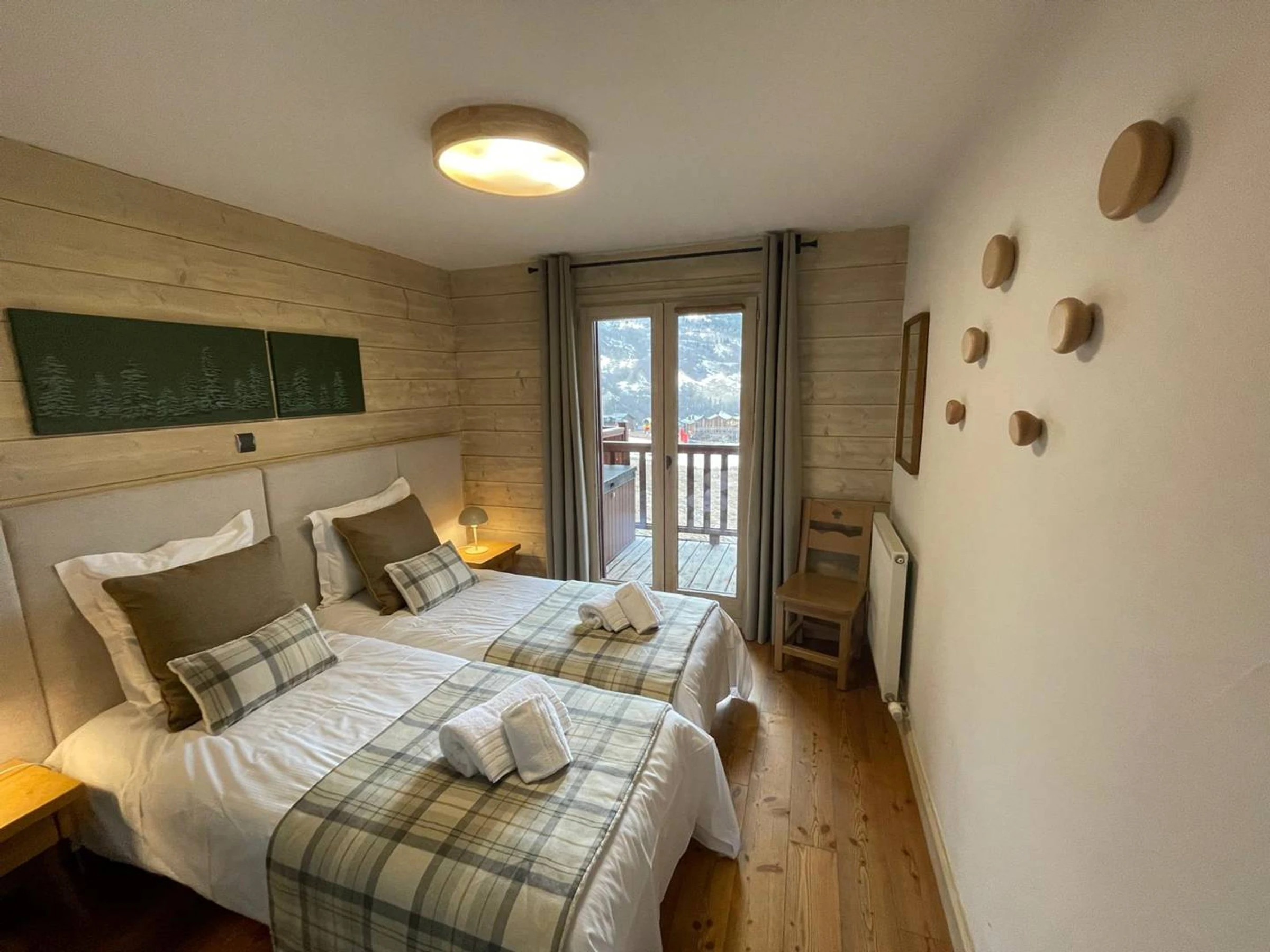- Schlafzimmer 2: Zwei Einzelbetten (80 x 190 cm). Zugang zum Balkon. Blick auf die Skipiste