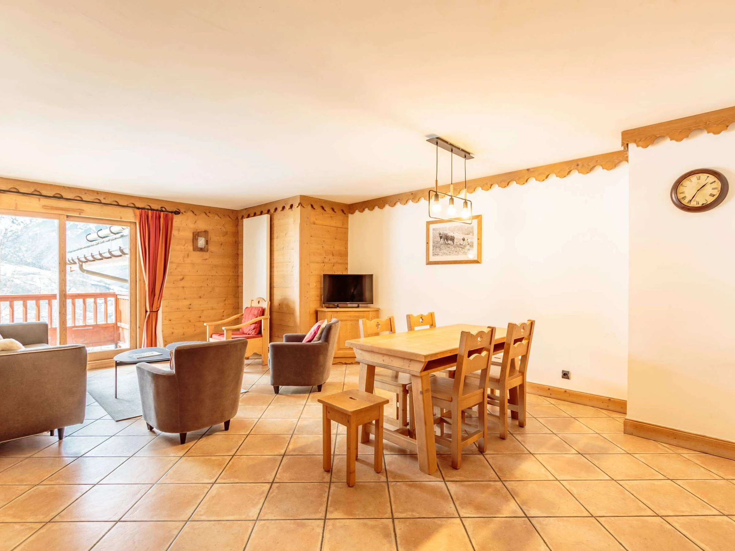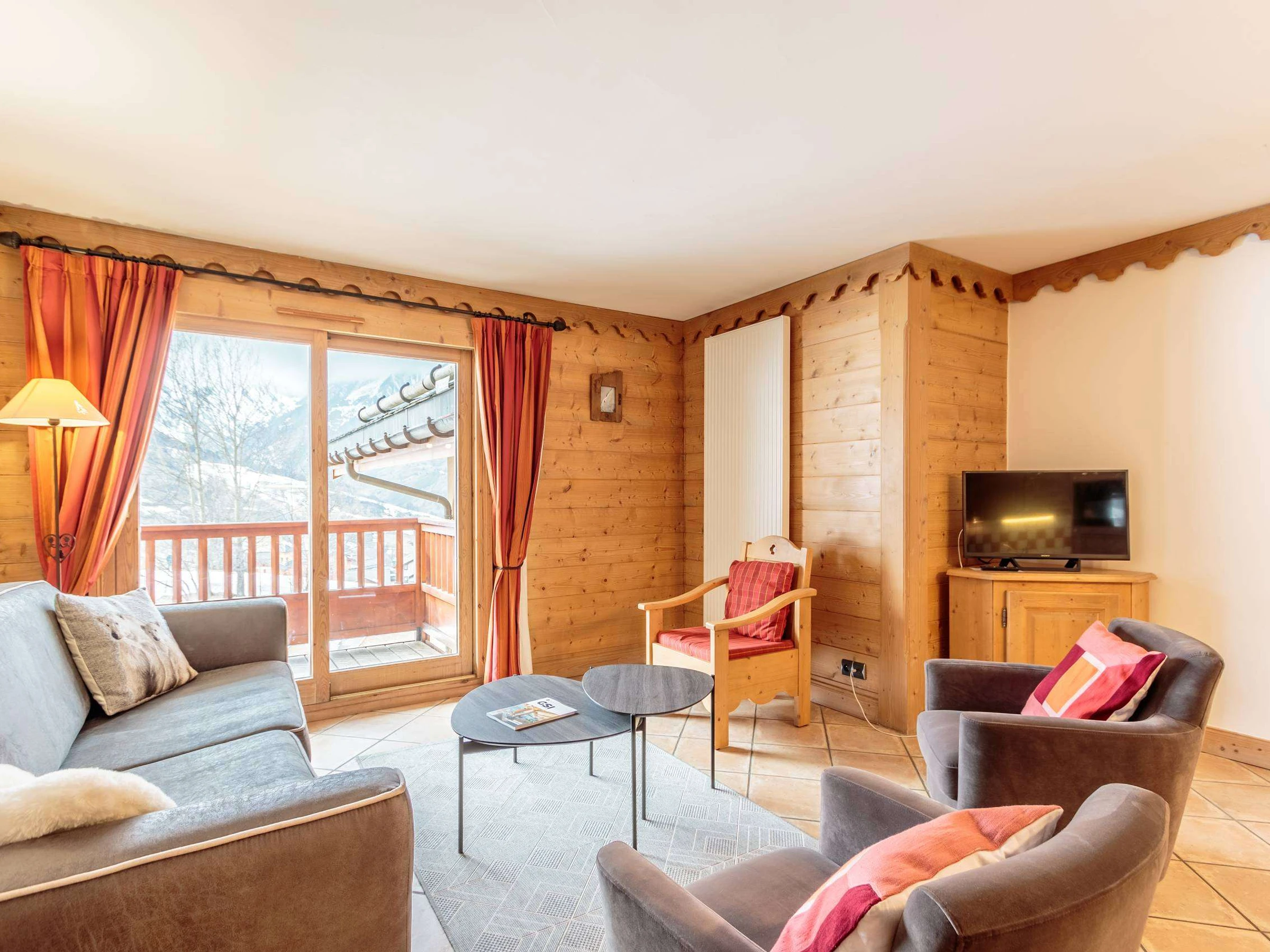 - Wohnzimmer mit großem Fernseher und durchgehendem Balkon, Ausrichtung SÜD-WEST, Blick auf die Pisten und das Dorf, im 3. STOCK mit Aufzug
