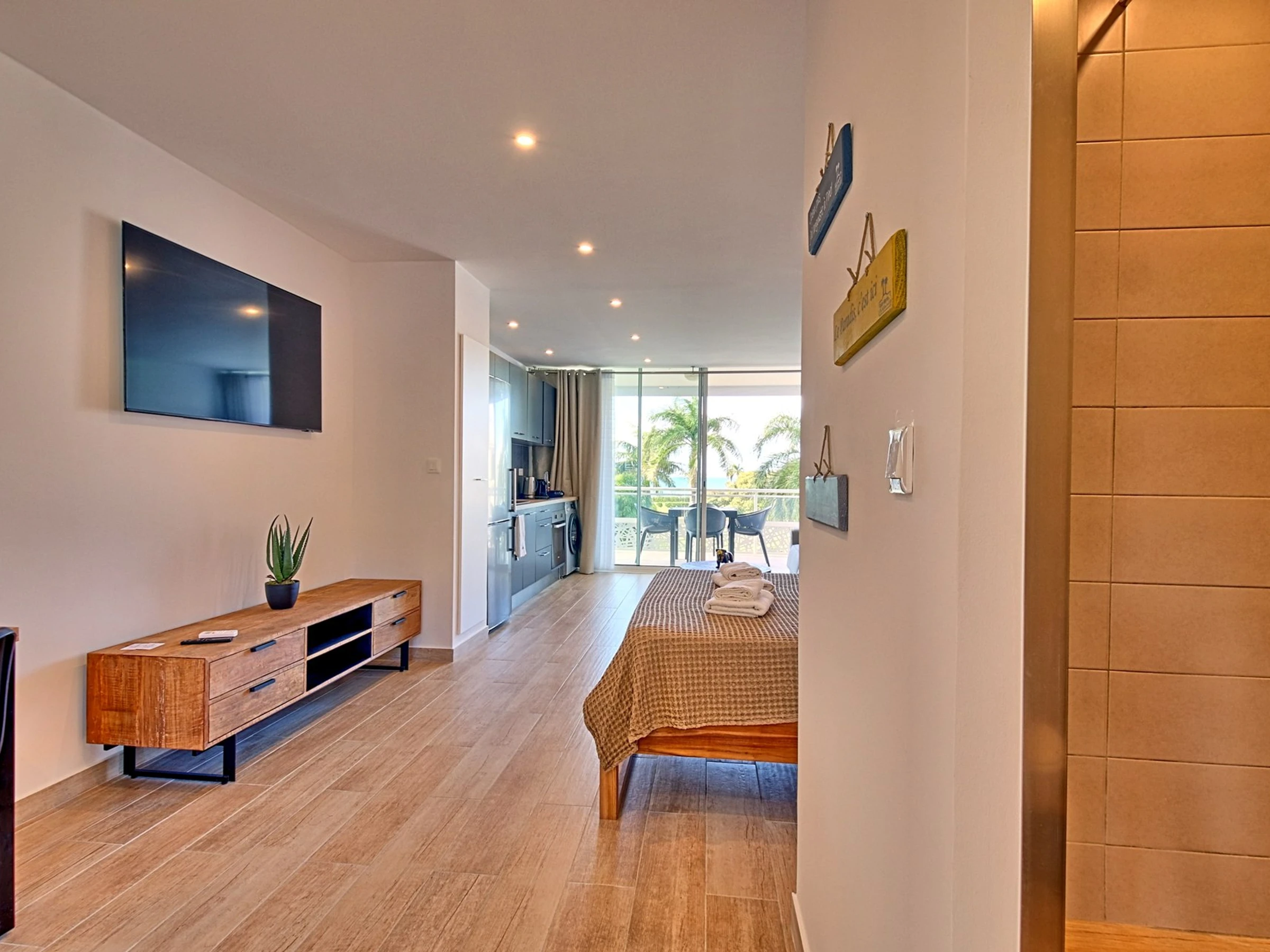 Der Schlafbereich ist mit einem Kingsize-Bett (200 x 200 cm) und einem Ankleidezimmer ausgestattet. Klimaanlage und Waschmaschine sorgen für zusätzlichen Komfort. Die voll ausgestattete Küche bietet alles, was Sie zur Zubereitung Ihrer Mahlzeiten benötigen.