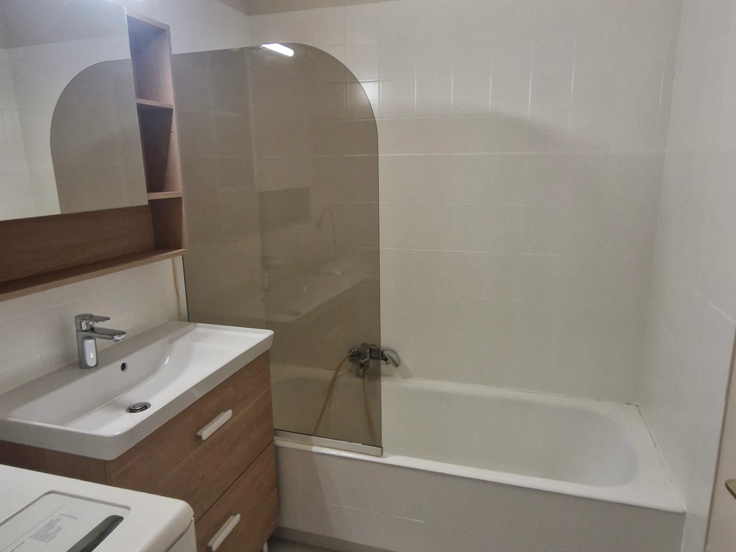 - Badezimmer mit Waschbecken, Badewanne mit Duschabtrennung – Waschmaschine.