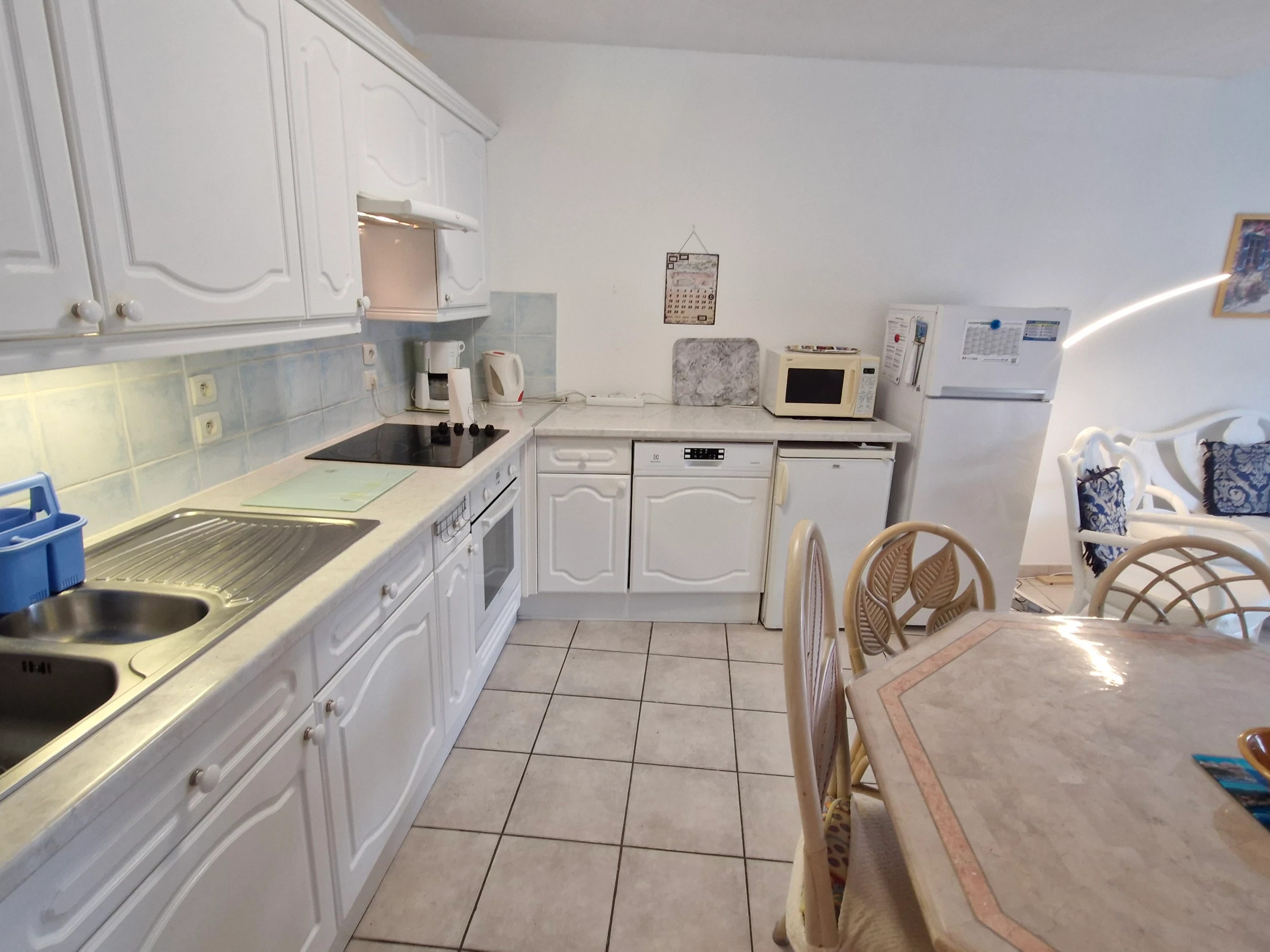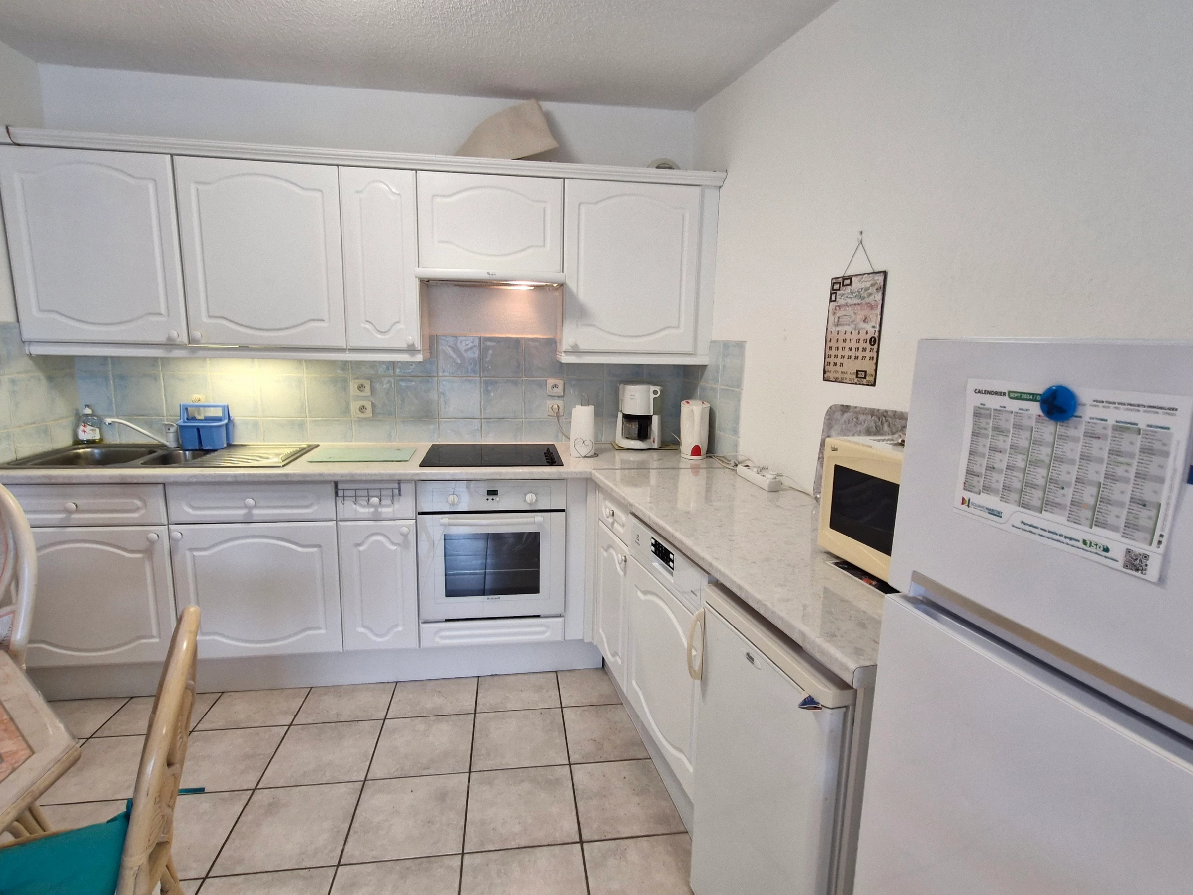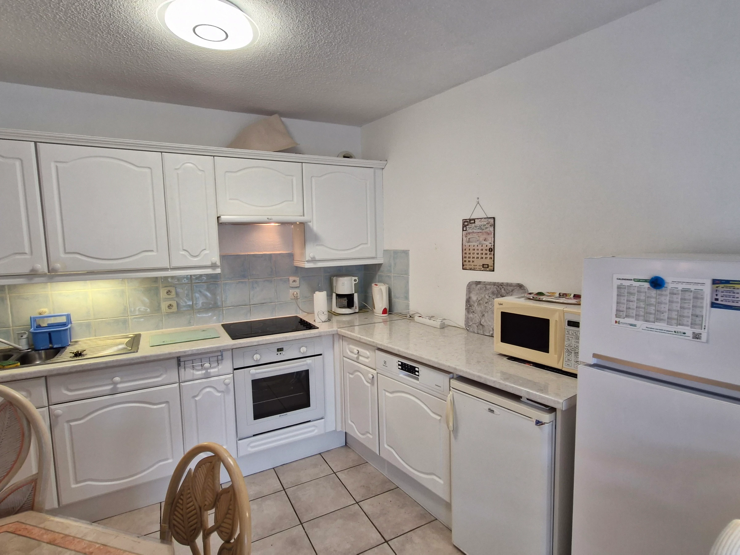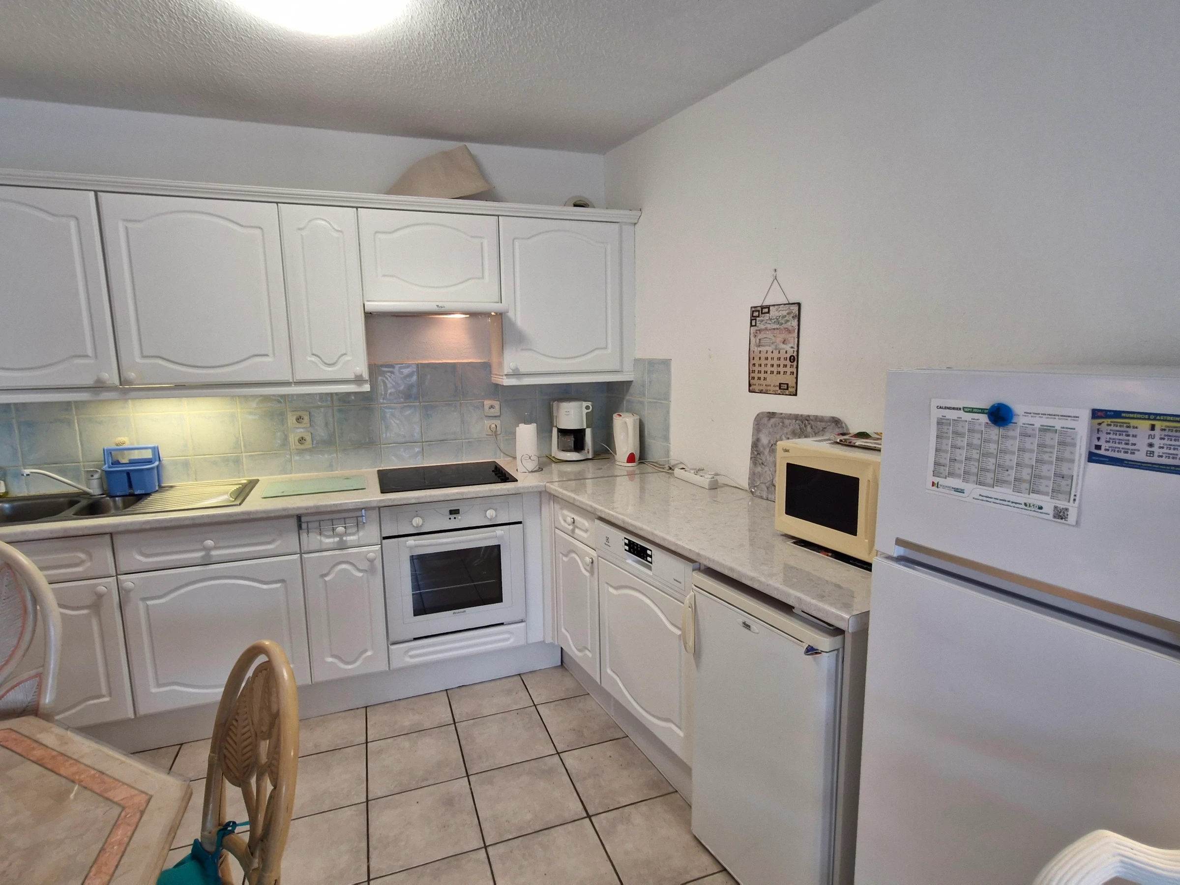- Offene Einbauküche (Spüle, 4-Flammen-Cerankochfeld, Kühl-/Gefrierkombination, Mikrowelle, Backofen, Dunstabzugshaube, Geschirrspüler, kleiner Kühlschrank, kleiner Gefrierschrank, Filterkaffeemaschine, Ober- und Unterschränke)