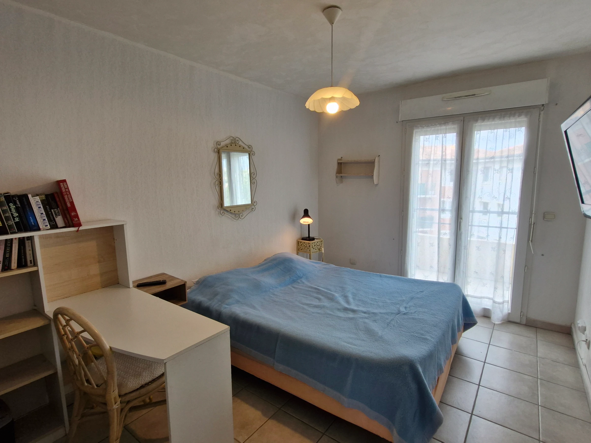 - Klimatisiertes Schlafzimmer mit Doppelbett (140 cm) und Kleiderschränken – Fernseher, Zugang zum Balkon