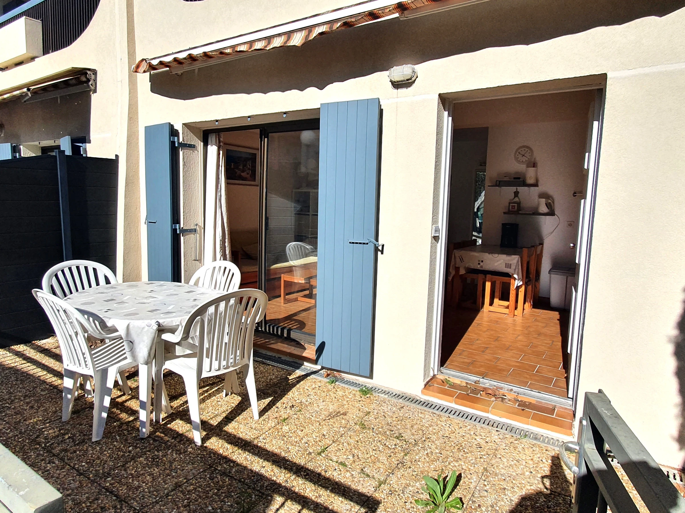 Gartenmöbel auf der Terrasse – Privater Außenstellplatz Nr. 47 in einer geschlossenen Wohnanlage mit automatischer Schranke