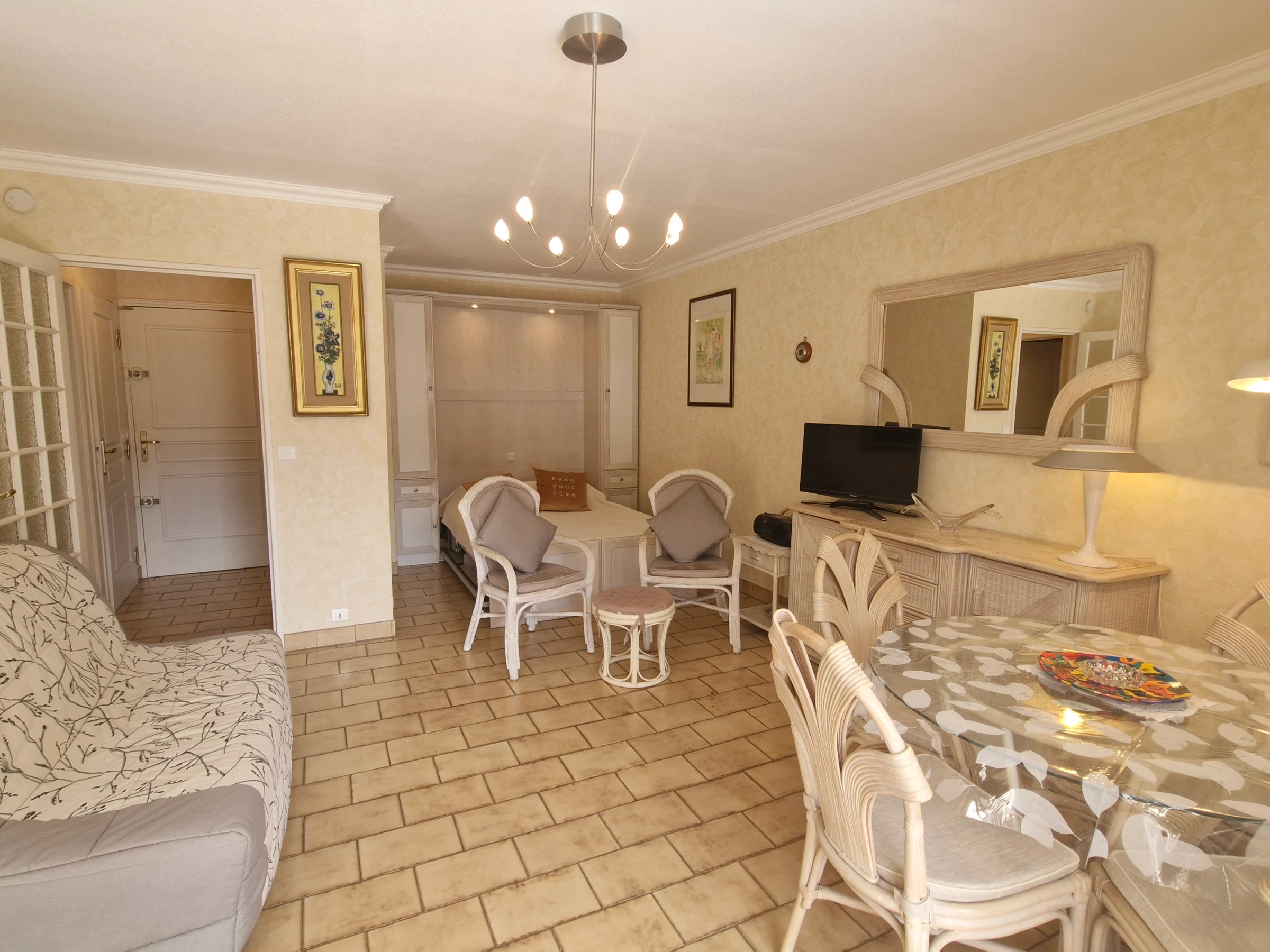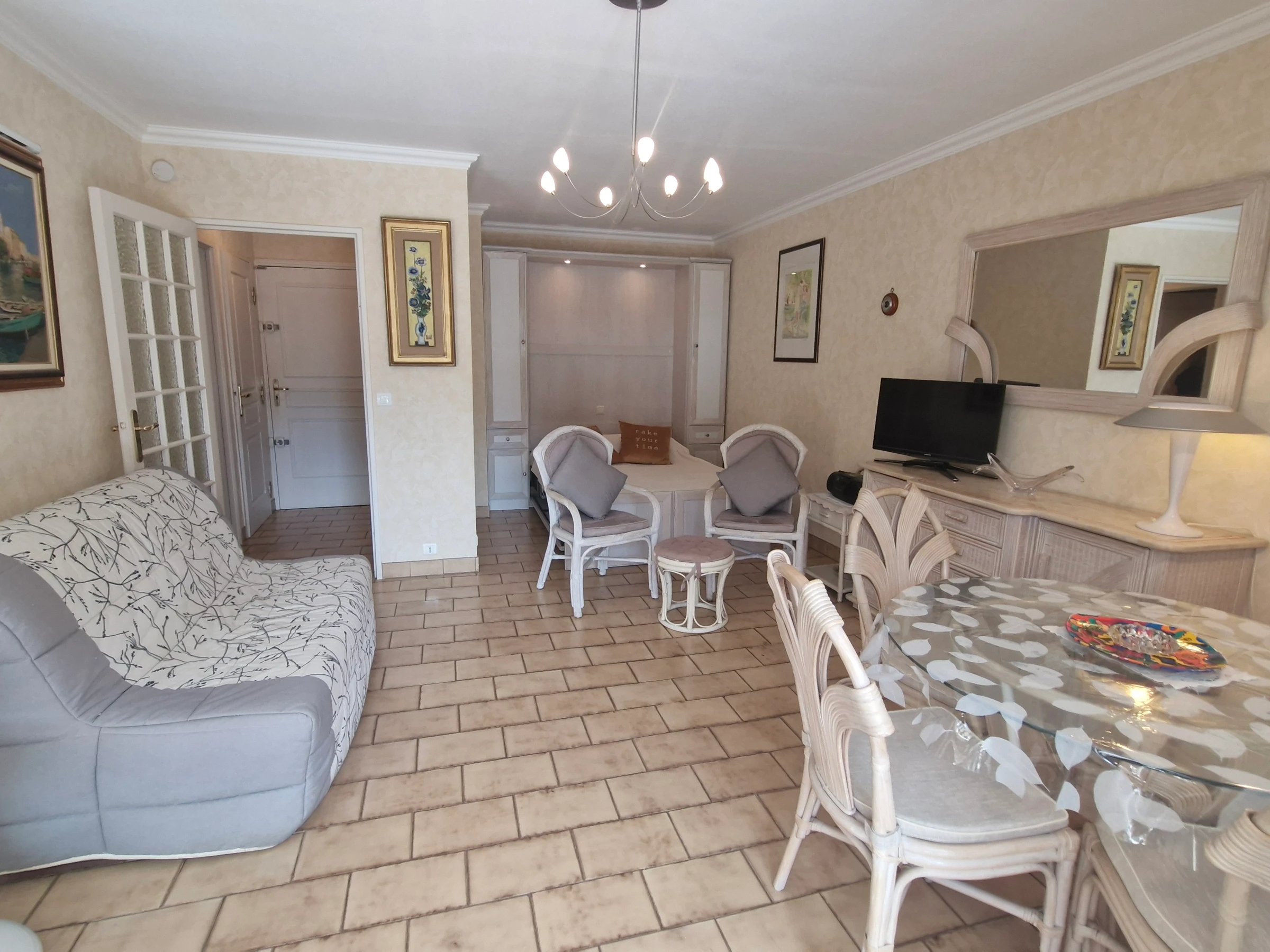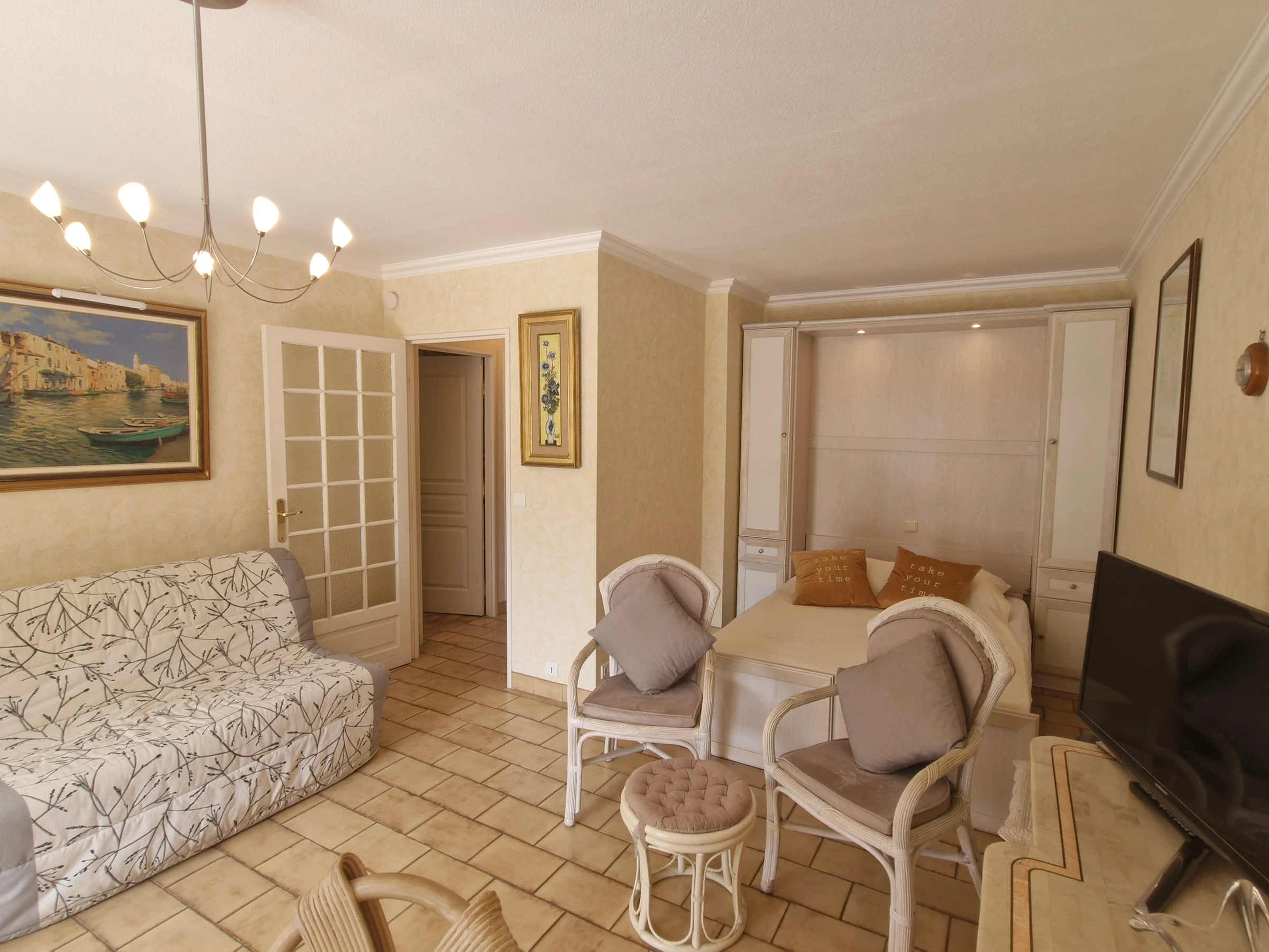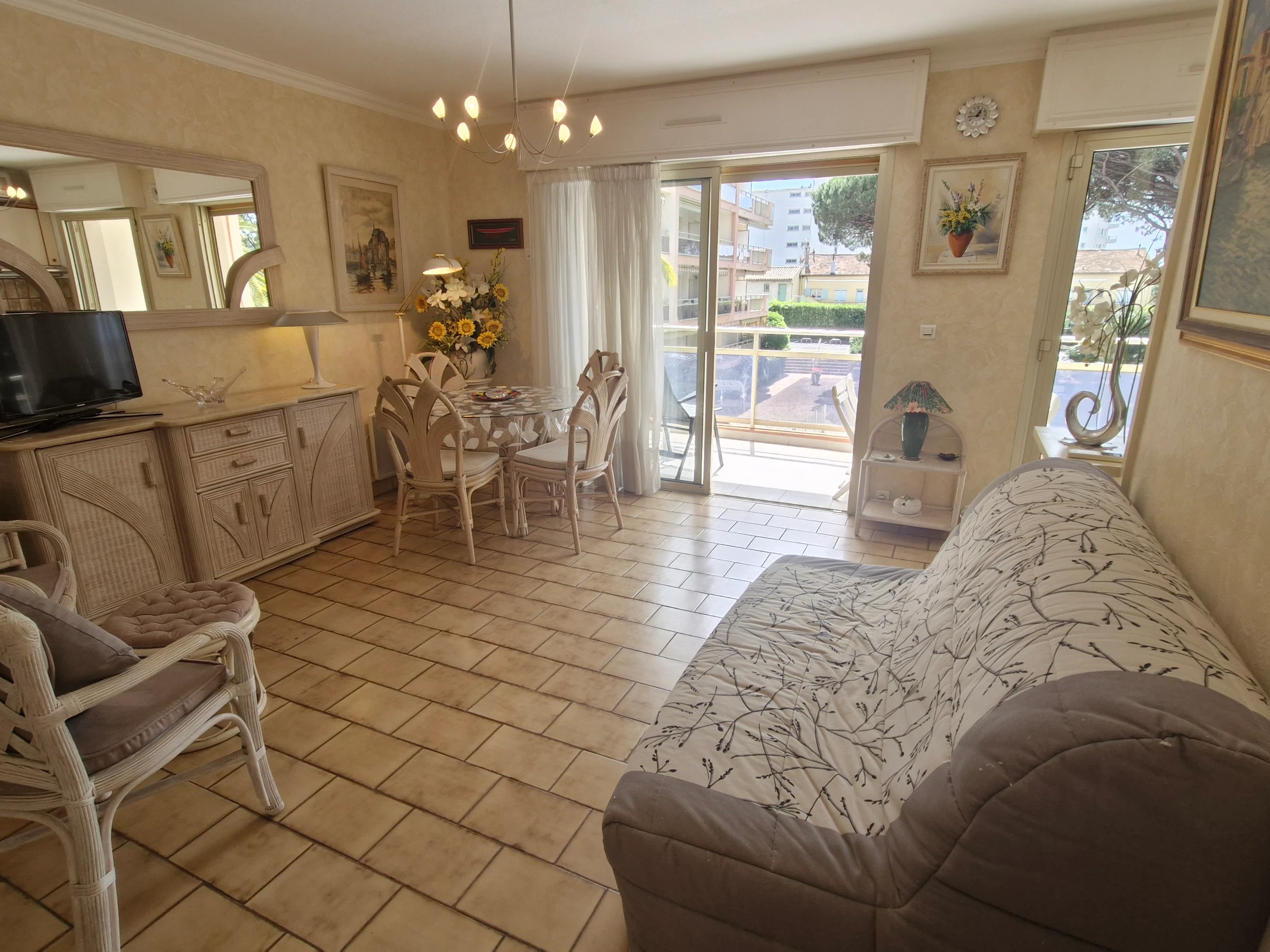 - Wohnzimmer mit Doppelschlafsofa (140 cm) und Zugang zur Terrasse – Fernseher.