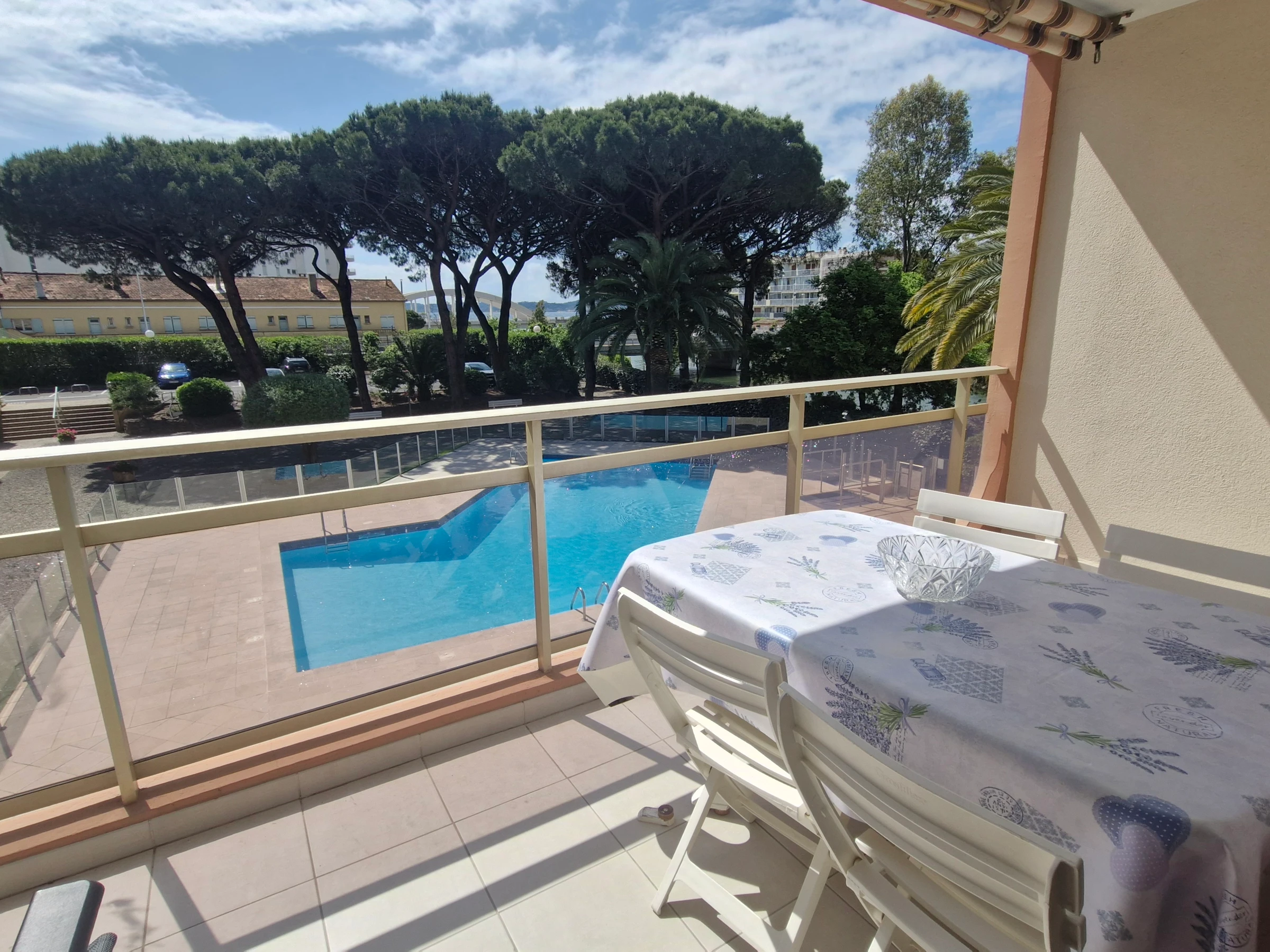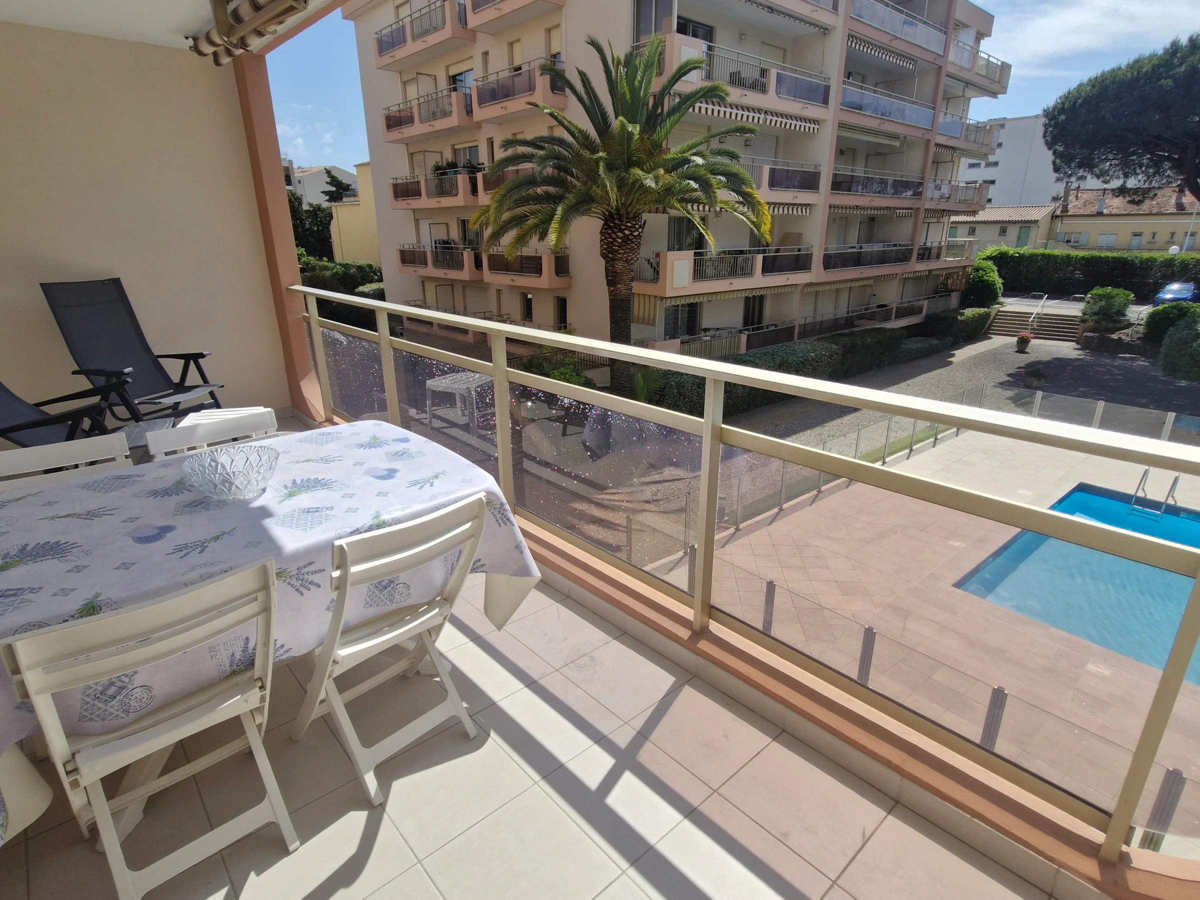 Sonnenschirm und Gartenmöbel auf der Loggia – Privater Außenparkplatz Nr. 11 in einer geschlossenen Wohnanlage mit automatischer Schranke – Die Anlage mit Swimmingpool ist vom 1. Mai bis 30. Oktober von 8:00 bis 20:00 Uhr geöffnet.