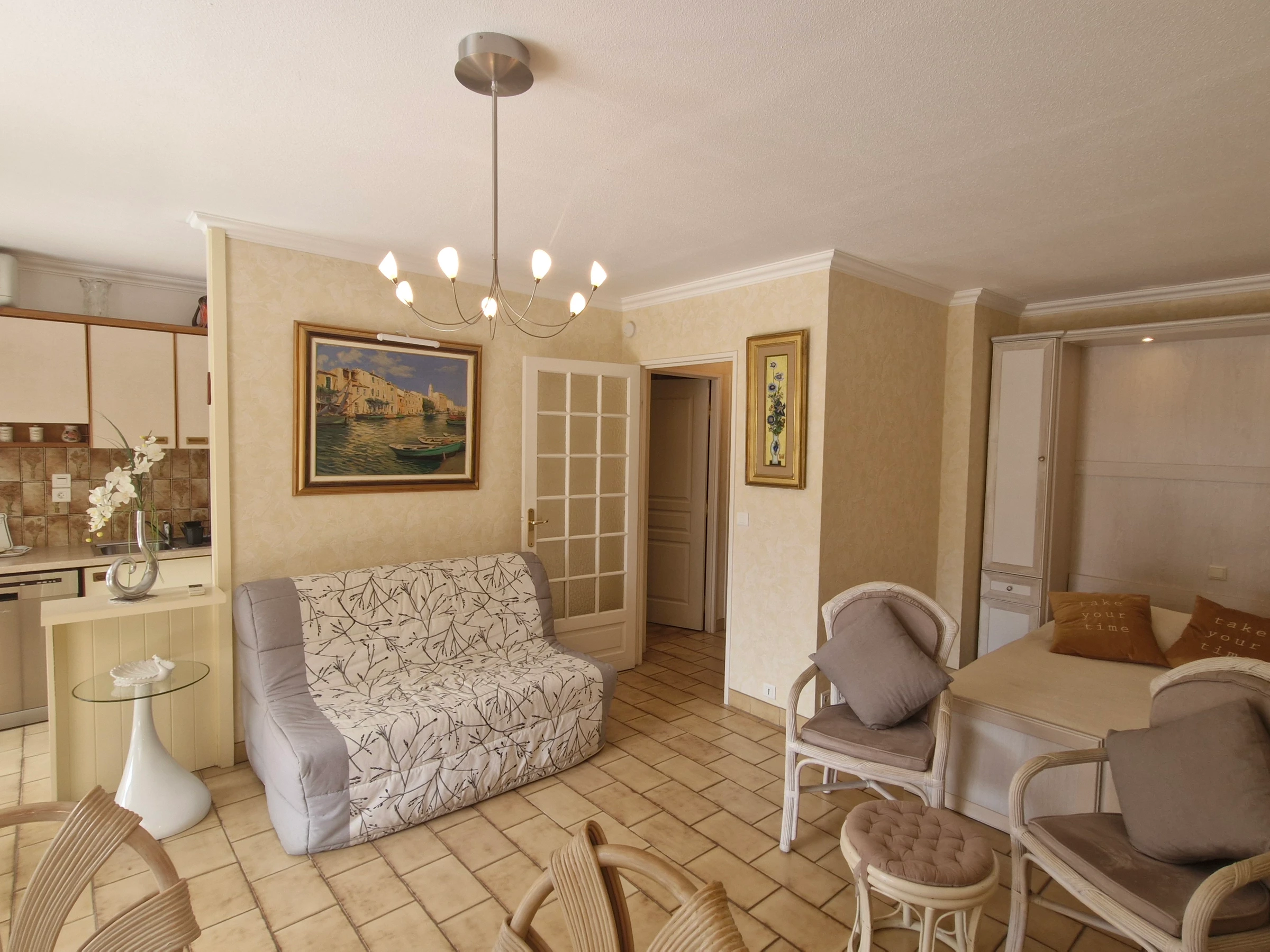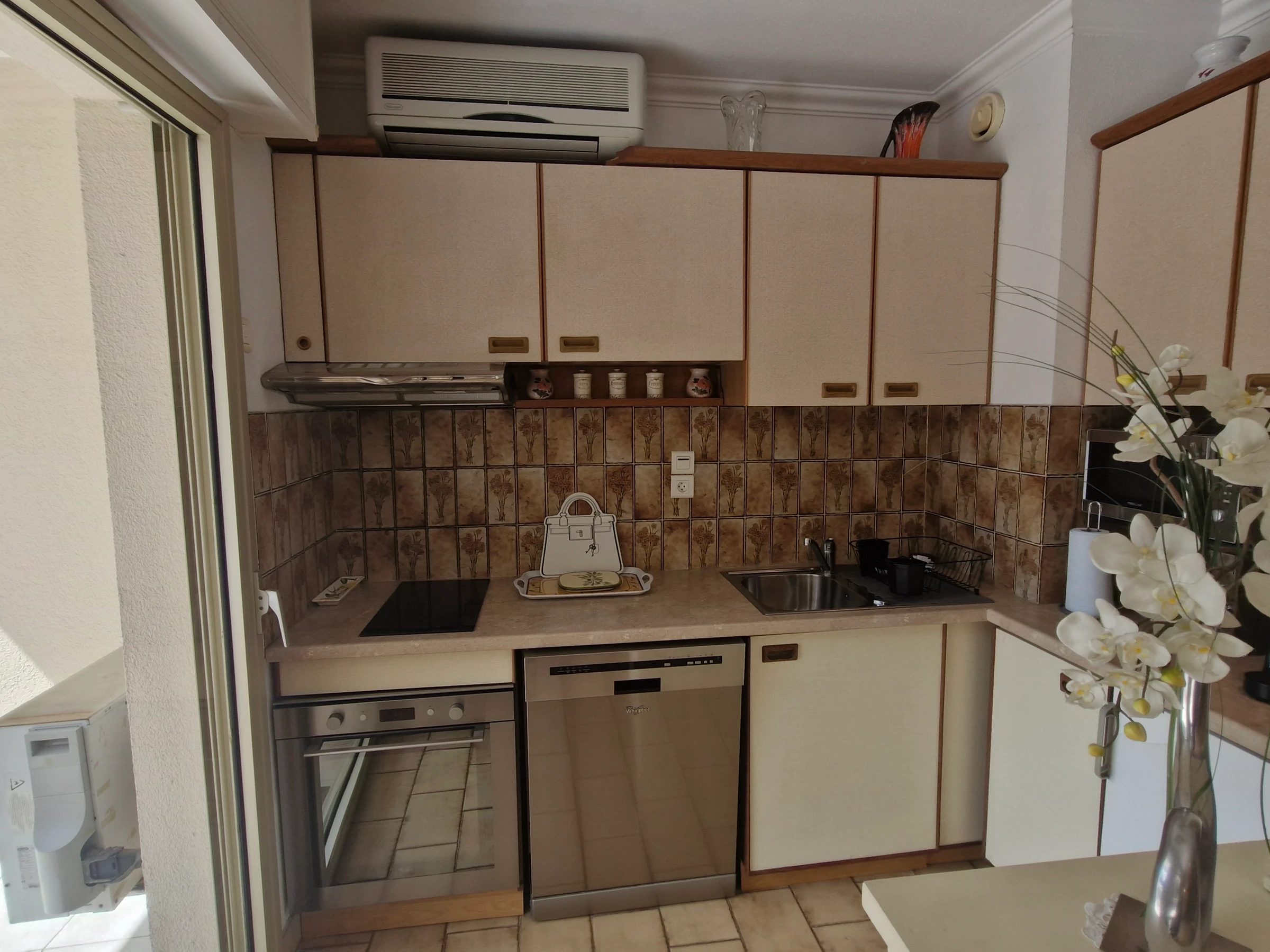 - Halboffene Küche mit Zugang zum Balkon und guter Ausstattung (2-Platten-Cerankochfeld, Nespresso-Maschine, Filterkaffeemaschine, kleiner Kühlschrank mit Gefrierfach, Backofen, Mikrowelle, Geschirrspüler) – Klimaanlage.