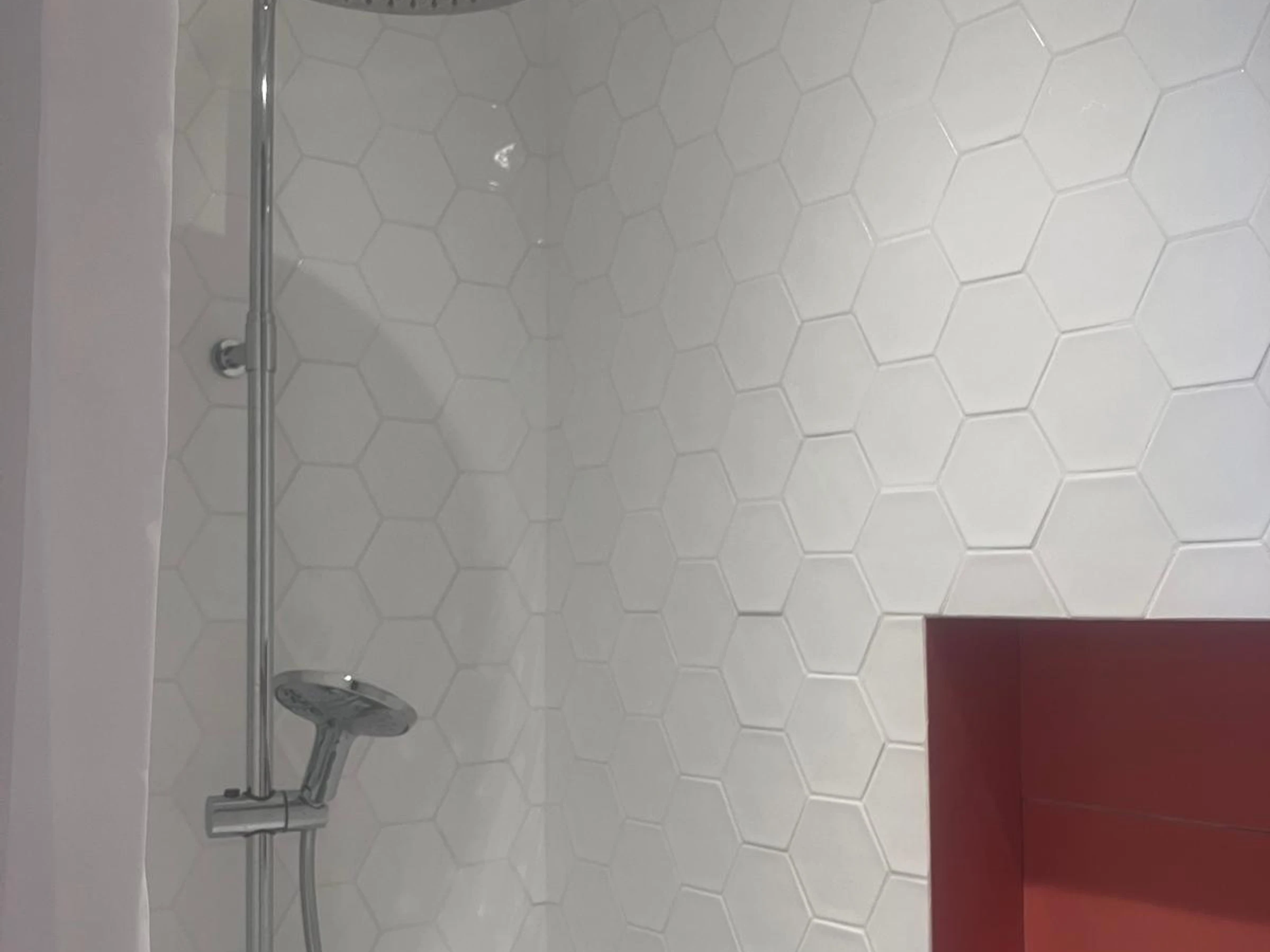- Ein Badezimmer mit Dusche und separatem WC.