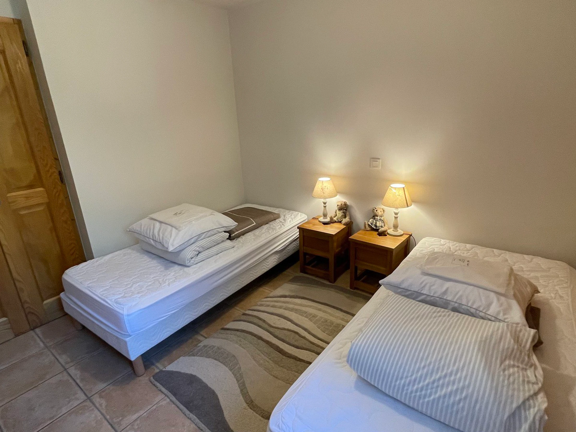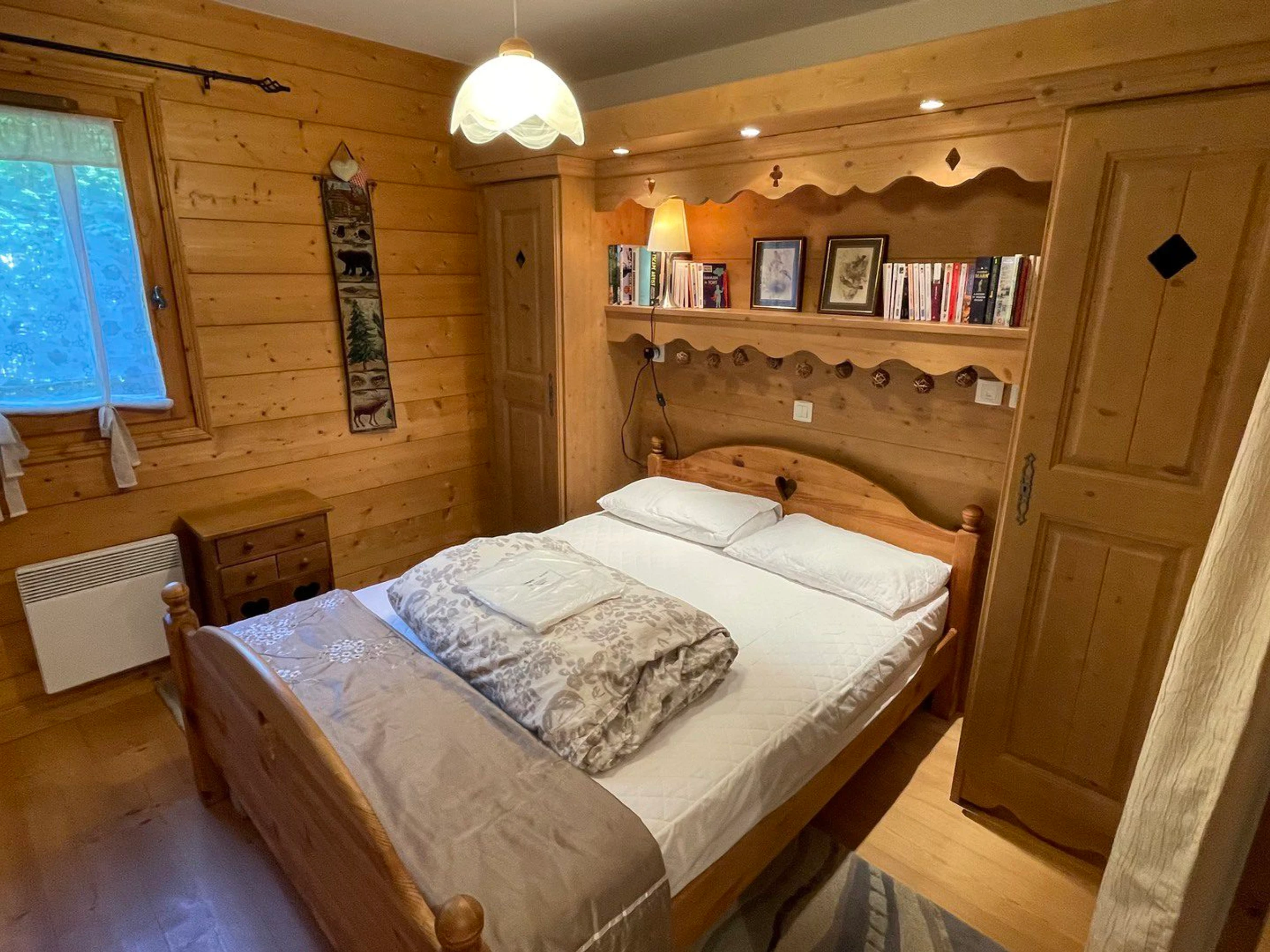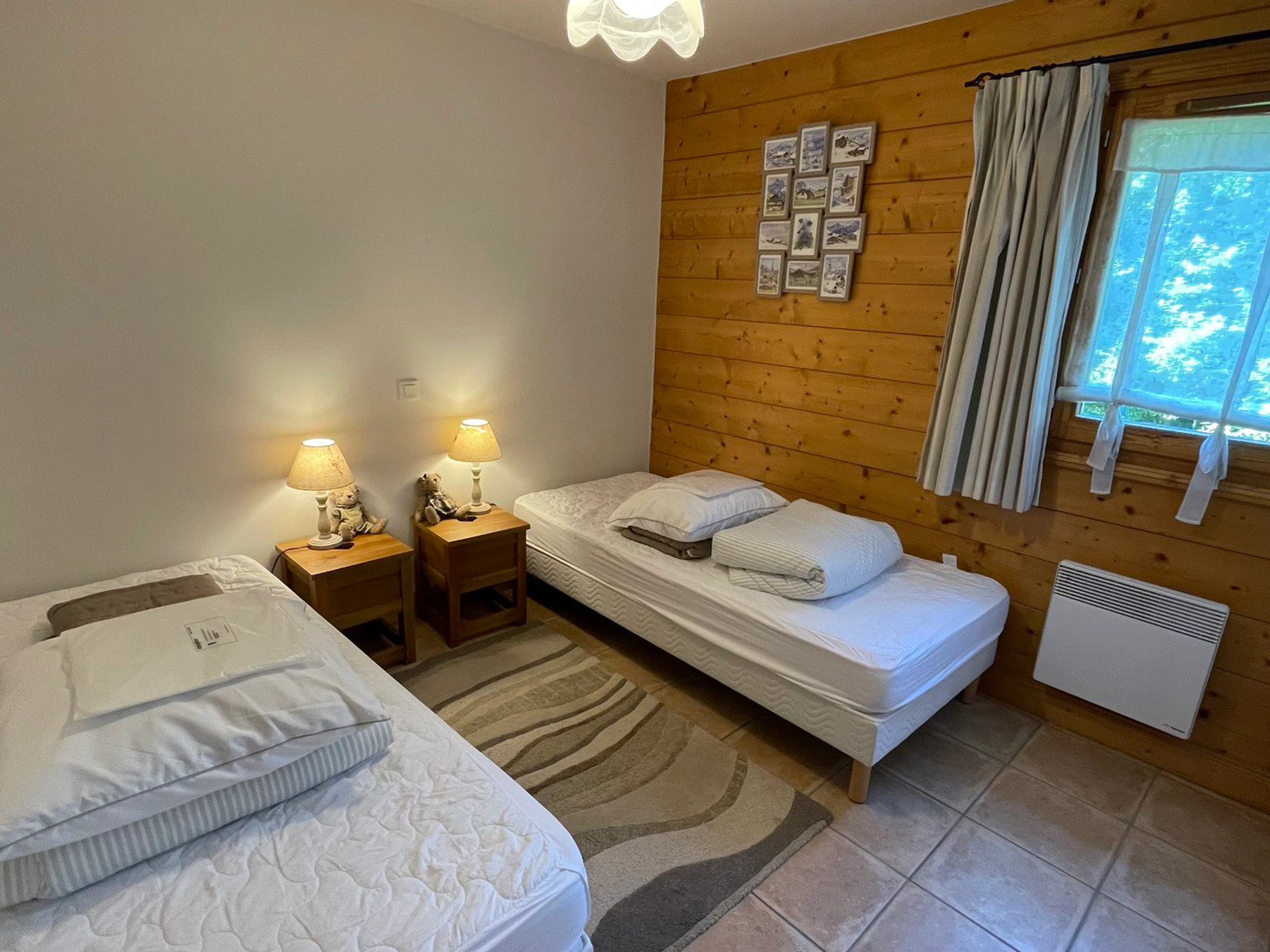 Ein Schlafzimmer 2 (8,20 m², 1 Fenster, Südseite, Bergblick): 2 Einzelbetten (90 cm x 2 – zusammengestellt zu einem Doppelbett möglich), Kleiderschrank