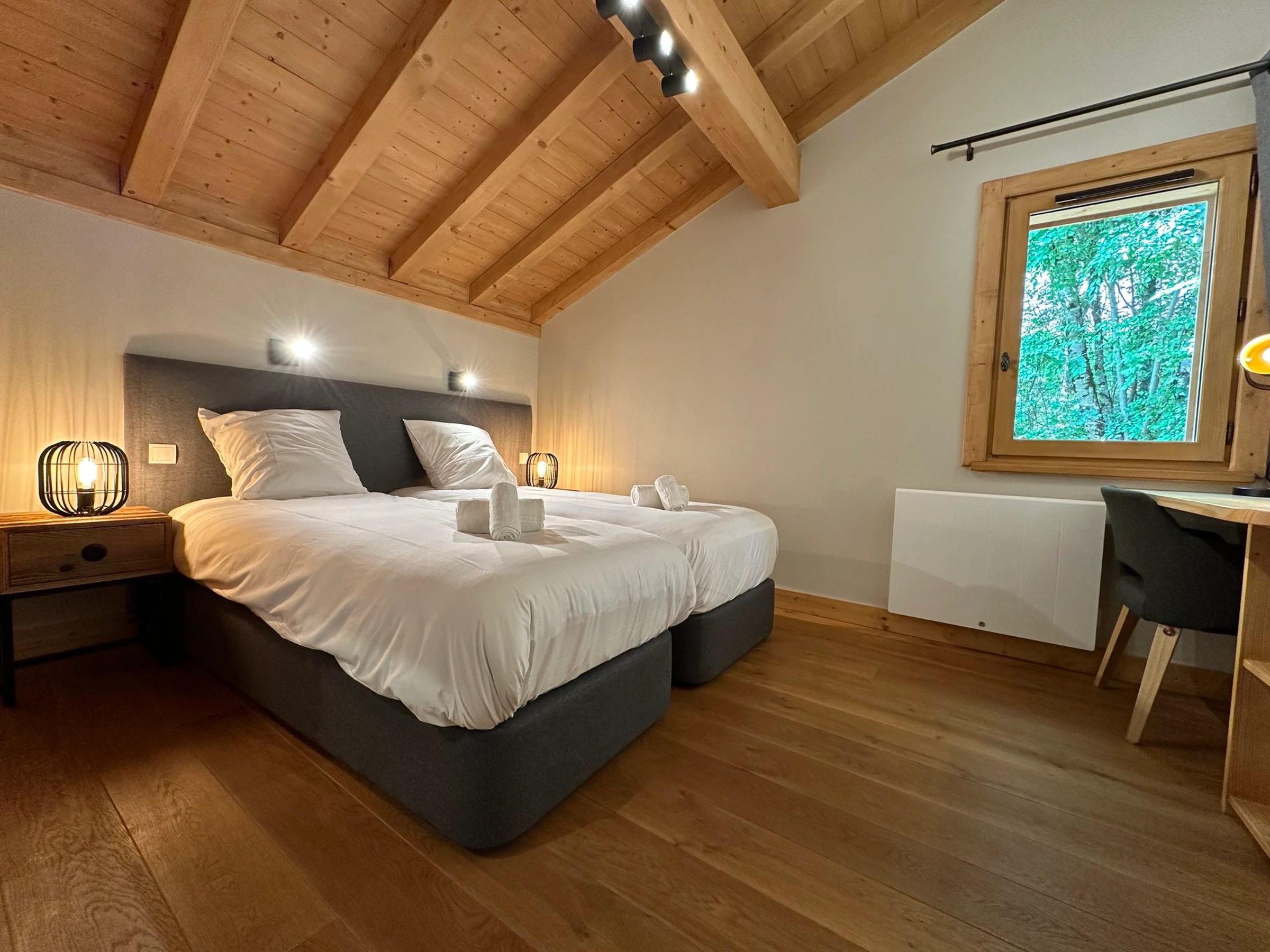 1 Schlafzimmer mit 2 Einzelbetten (90 cm), die zu einem Doppelbett zusammengestellt werden können, mit eigenem Bad und WC.