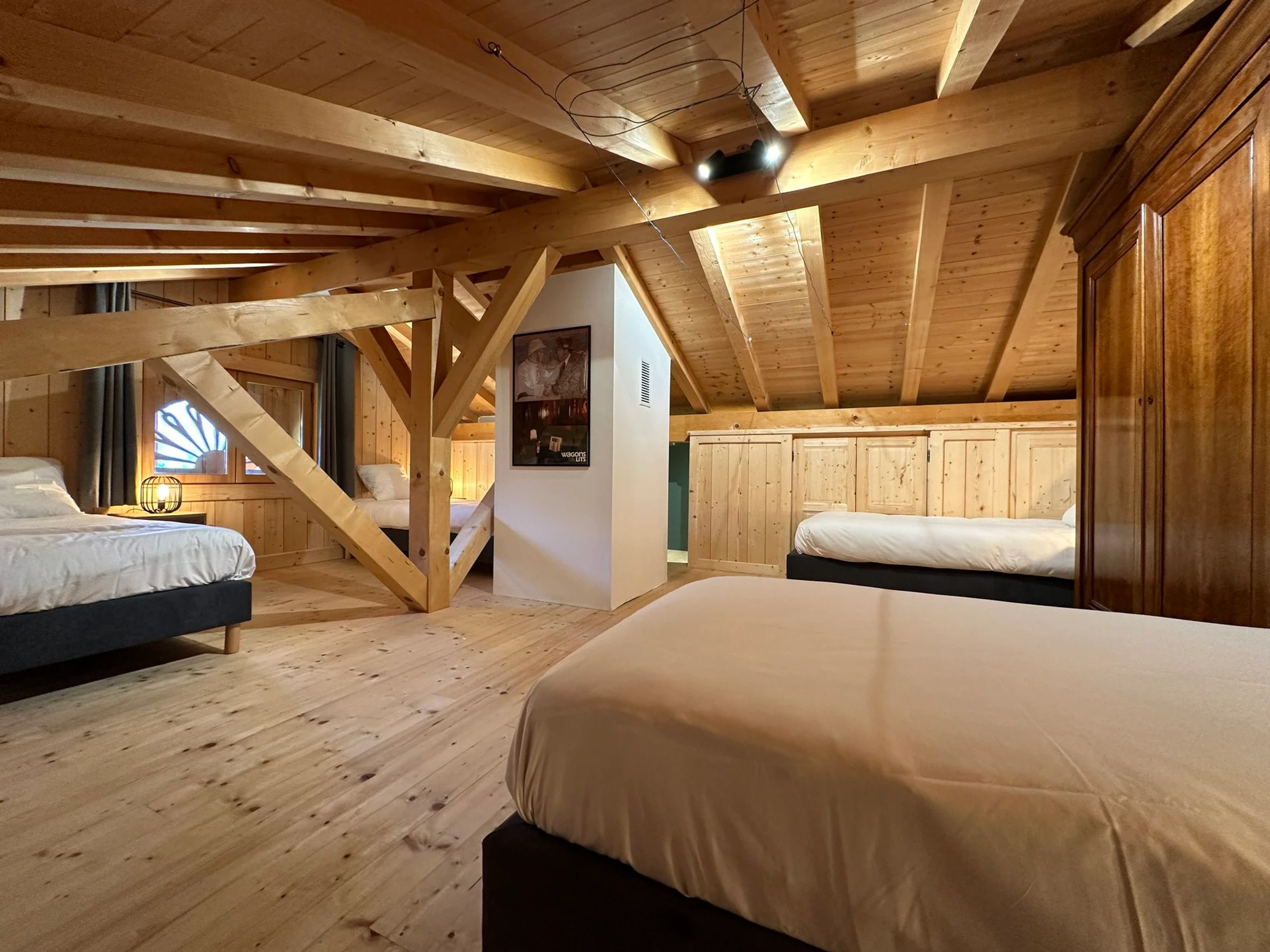 Ein Schlafsaal mit 4 Einzelbetten (80 cm), ideal für Kinder, die zu einem Doppelbett zusammengestellt werden können.