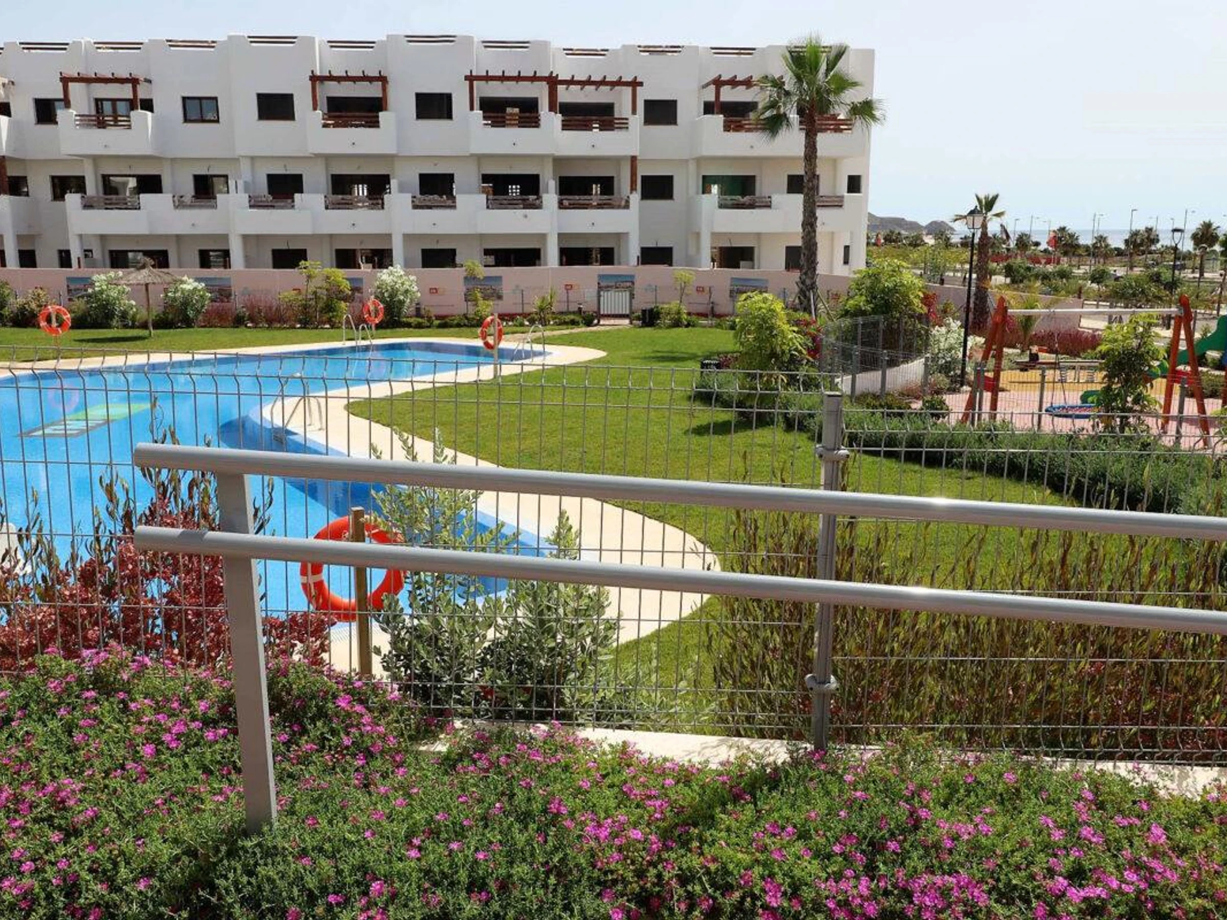 Modernes und fröhliches Apartment in San Juan de los Terreros, Andalusien, Spanien, mit einem Gemeinschaftspool für 4 Personen. Das Apartment befindet sich in einem Strandresort in einem Wohn- und gebirgigen Strandgebiet, in der Nähe von Supermärkten und 500 m vom Strand entfernt.