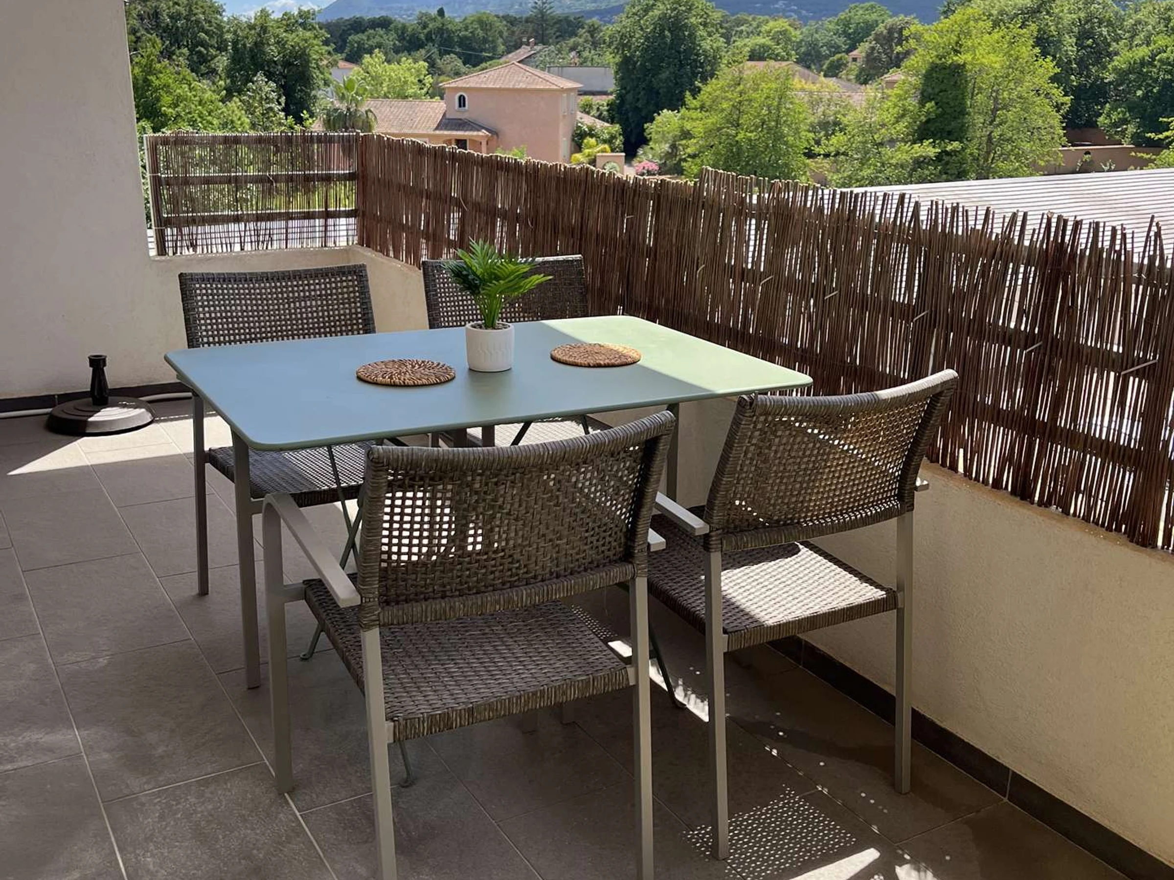 Eine große möblierte Terrasse mit Gartenmöbeln und Bergblick.