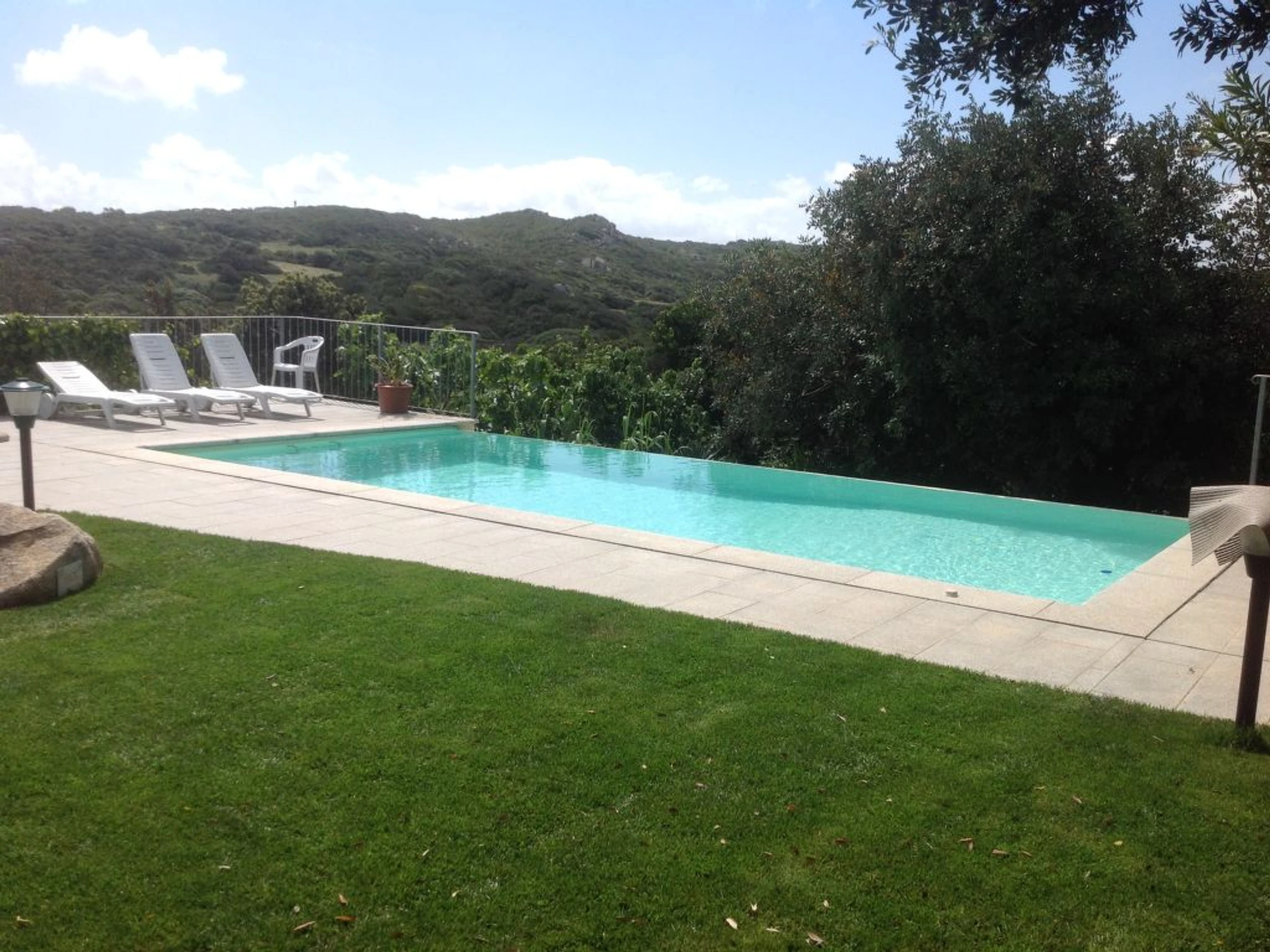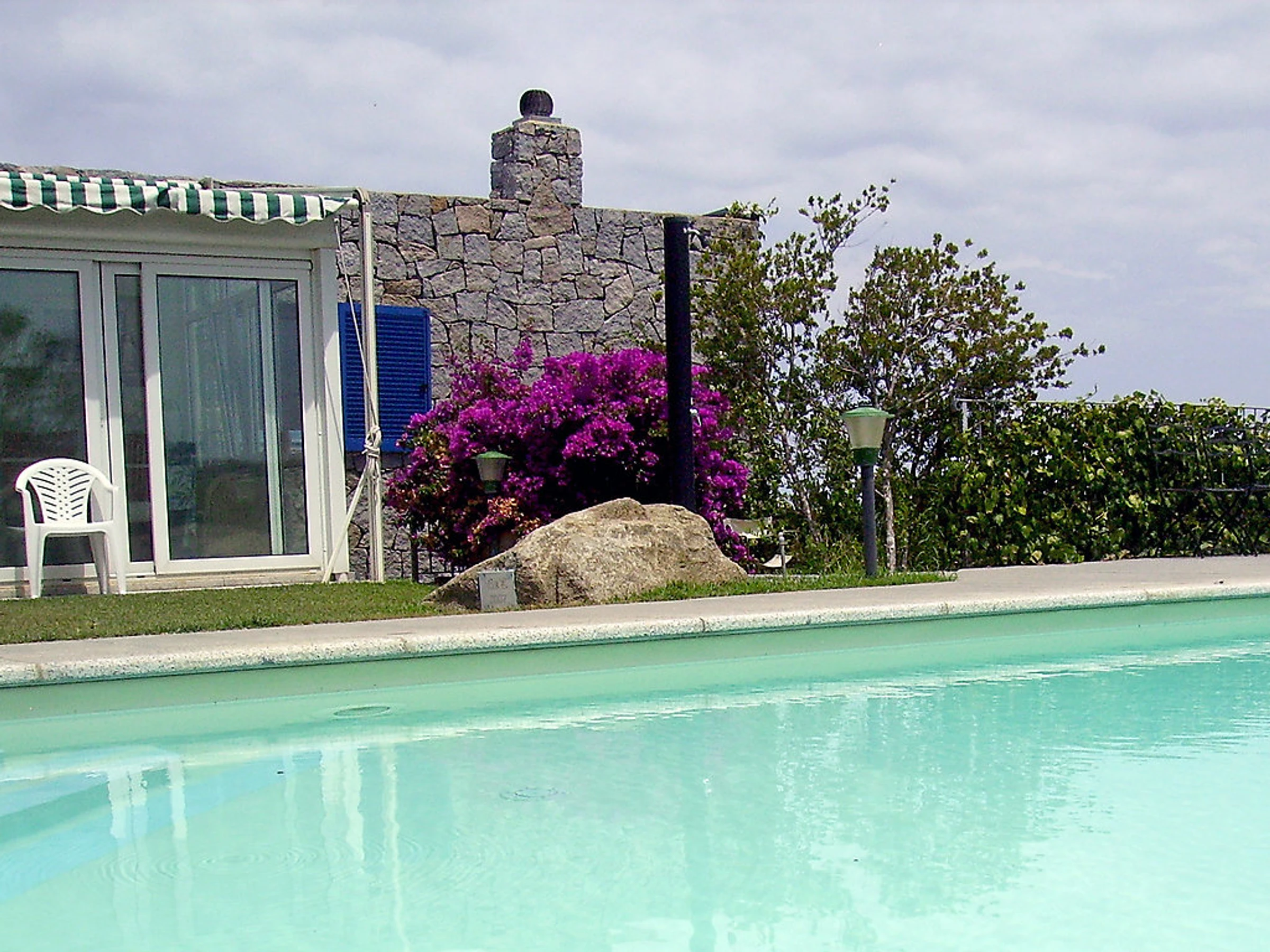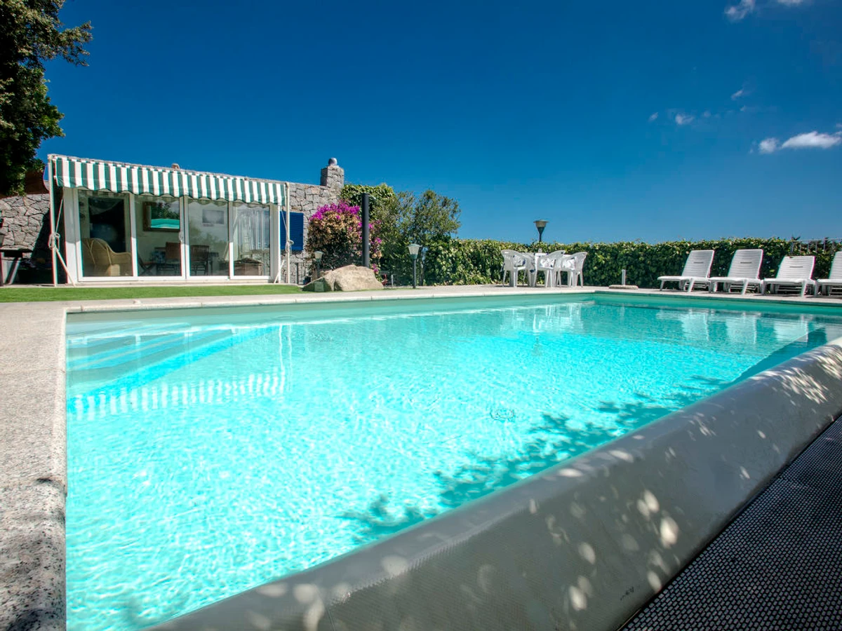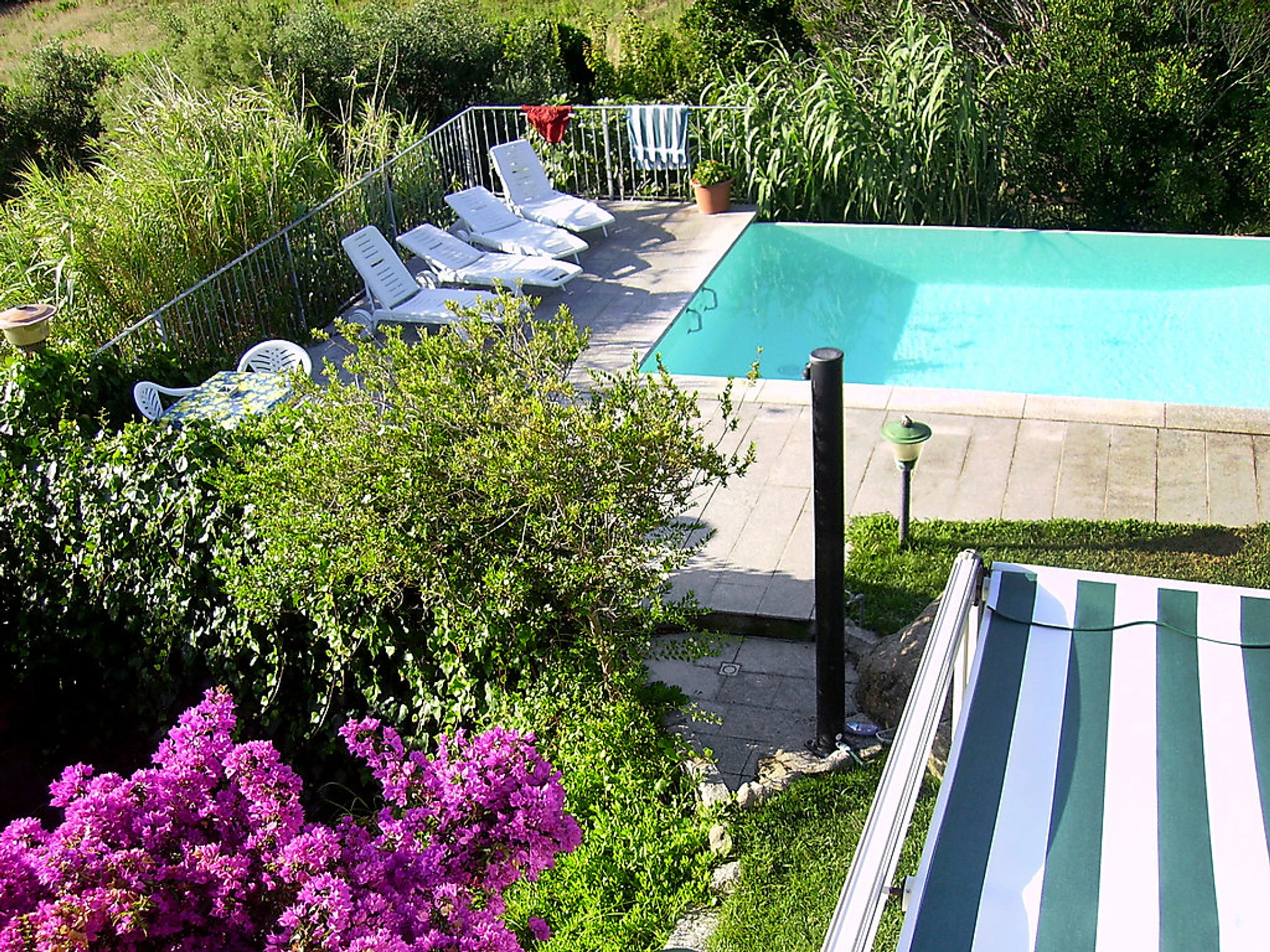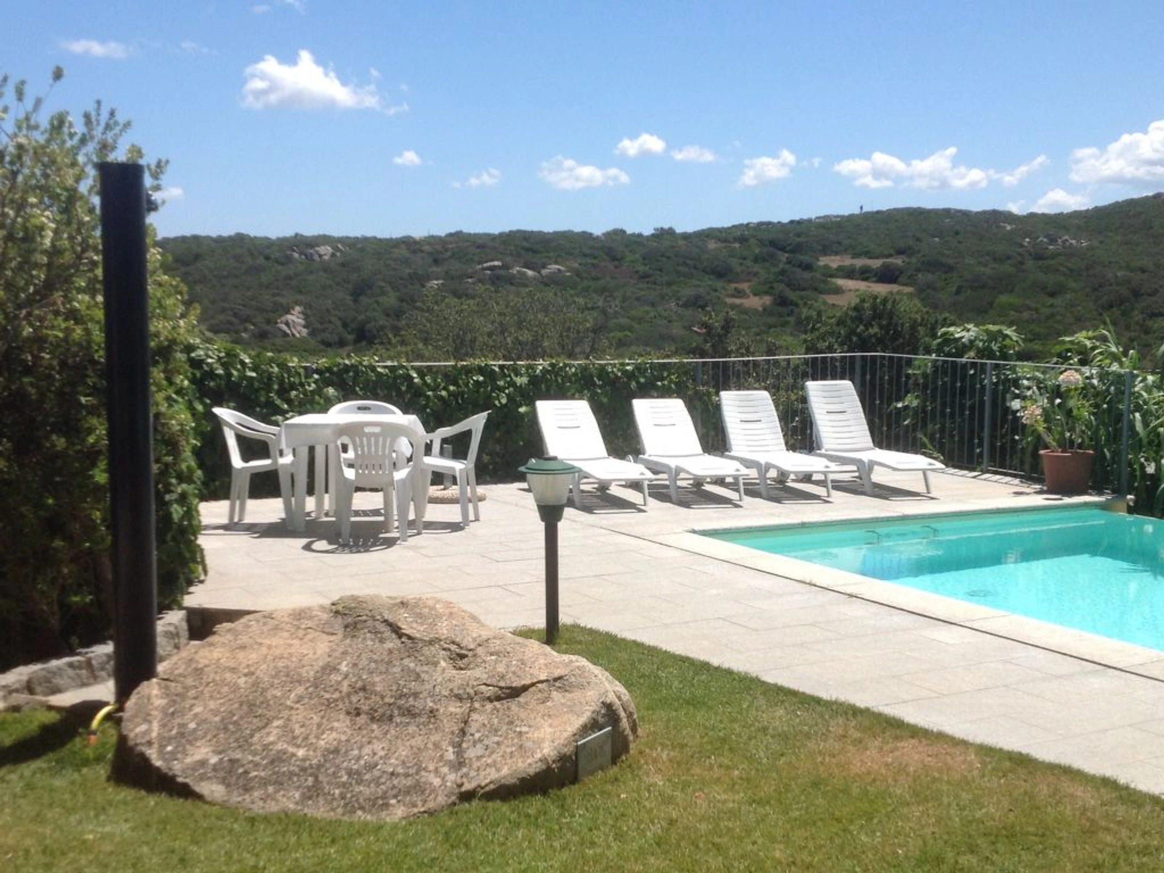 Porto Quadro 3 km von Santa Teresa Gallura: Gemütliche Villa "La Loggia", umgeben von Bäumen und Wiesen. 4 km vom Zentrum, ruhige, sonnige, erhöhte Lage im Villenviertel, 800 m vom Meer. Zur Alleinbenutzung: Garten 1'200 m2 (eingezäunt), Schwimmbad (4 x 8 m, 130 - 160 cm tief, 01.06.-30.09.). Aussendusche. Haushaltshilfe täglich möglich (extra). Parkplatz beim Haus. Einkaufsgeschäft 3 km, Lebensmittelgeschäft 3 km, Supermarkt 3 km, Restaurant 3 km, Sandstrand 800 m. Bitte beachten: Fahrzeug empfohlen.