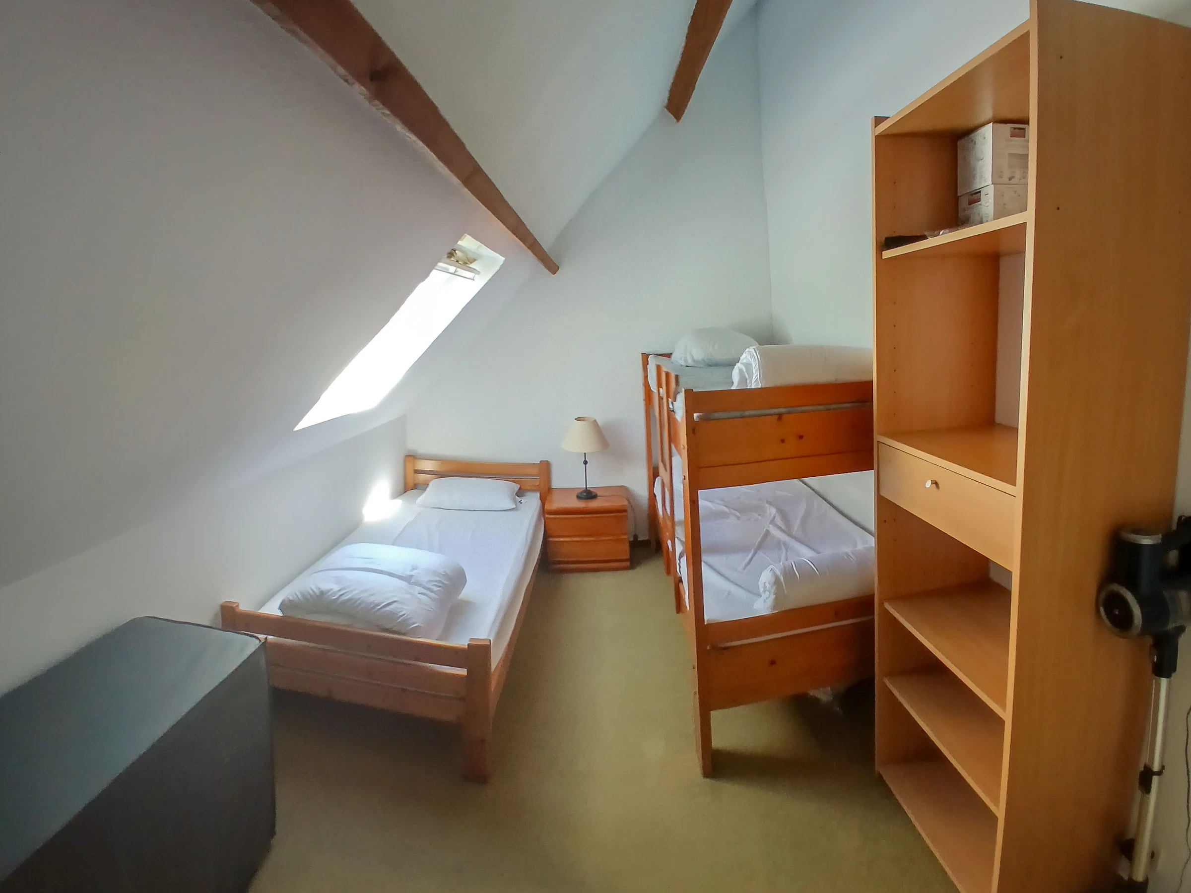 Im Erdgeschoss befindet sich ein Eingangsbereich mit Zugang zum Wohnzimmer mit Schlafsofa, einer offenen Einbauküche und einem Badezimmer mit WC. Im Obergeschoss befinden sich zwei Schlafzimmer, eines mit einem Doppelbett (140 x 190 cm), das andere mit einem Etagenbett (2 x 80 x 190 cm) und einem Einzelbett (80 x 190 cm).