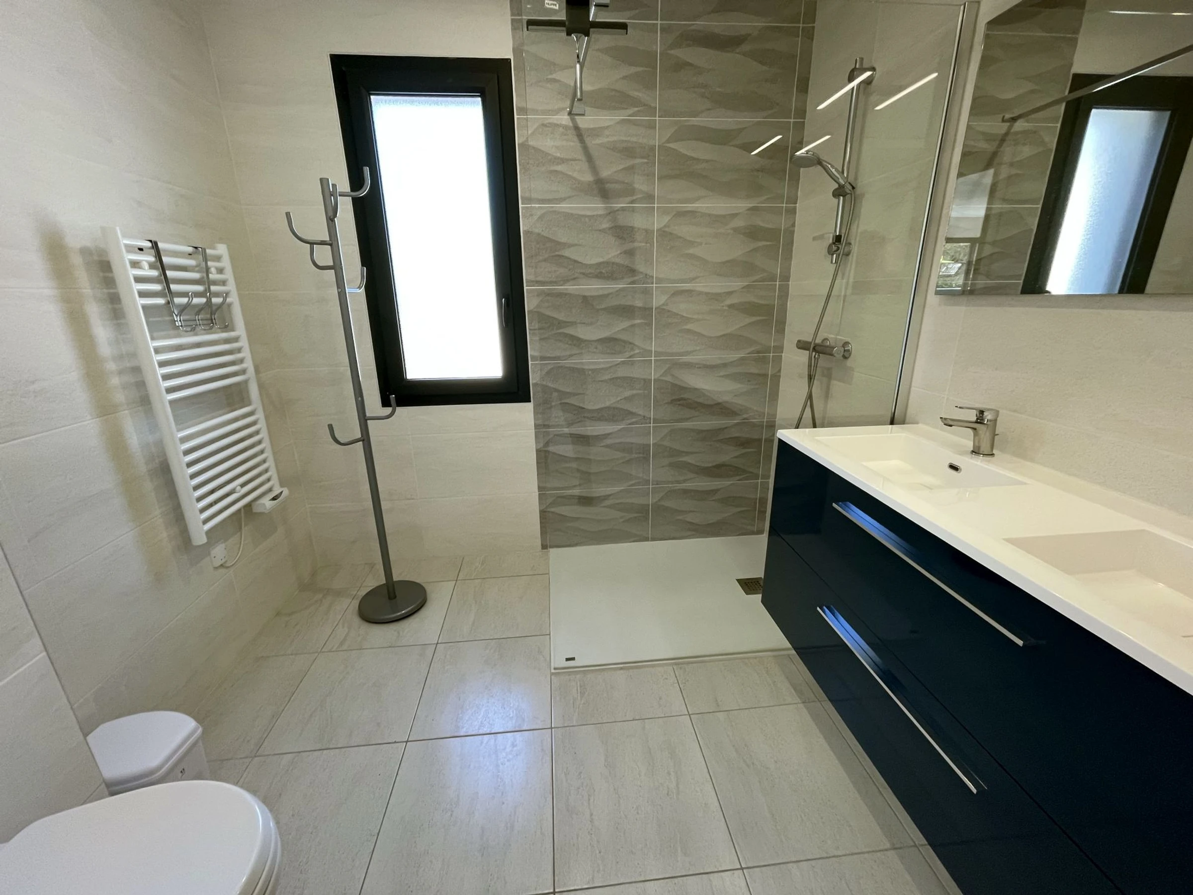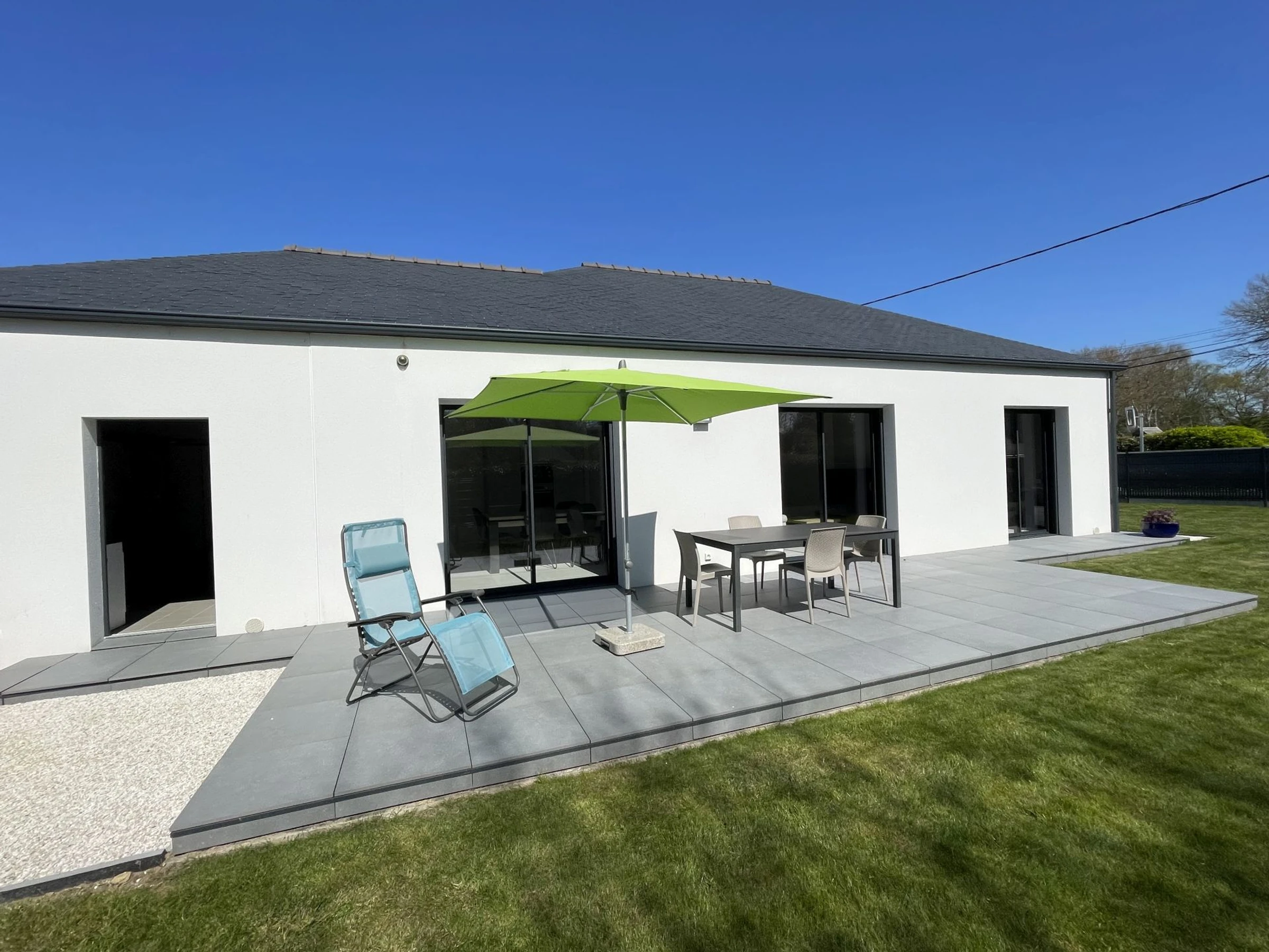 Schönes, funktionales und modernes, ebenerdiges Haus, Neubau und barrierefrei zugänglich, bestehend aus: Eingangsbereich mit Einbauschrank (Regale und Kleiderstange), Wohn-/Esszimmer mit TV und Zugang zu einer Südterrasse, voll ausgestattete Küche (Mikrowelle, Backofen, Kühlschrank mit Gefrierfach, 3-Platten-Induktionskochfeld, Geschirrspüler, elektrische Filterkaffeemaschine, Magimix Kapselkaffeemaschine), erstes Schlafzimmer (zwei 80-cm-Betten oder ein 160-cm-Bett) mit Einbauschrank (Regale und Kleiderstange), Duschbad mit WC, zweites Schlafzimmer (zwei 80-cm-Betten oder ein 160-cm-Bett) mit Einbauschrank (Regale und Kleiderstange) und kleinem Schreibtisch, WC, drittes Schlafzimmer (ein 160-cm-Bett) mit Einbauschrank (Regale und Kleiderstange) und kleinem Schreibtisch.