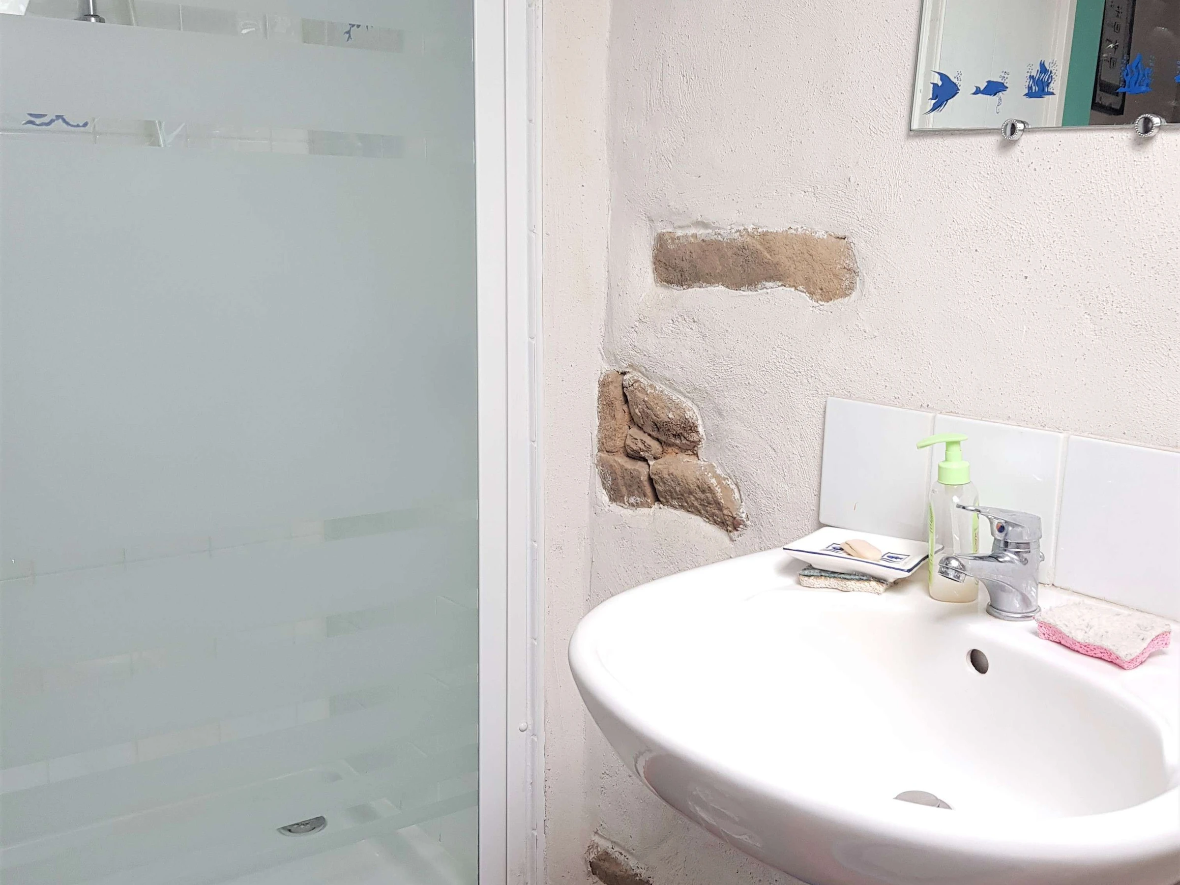 - Schlafzimmer mit 140 cm breitem Bett, abgetrennt durch einen Vorhang, mit kleinem Badezimmer mit Dusche