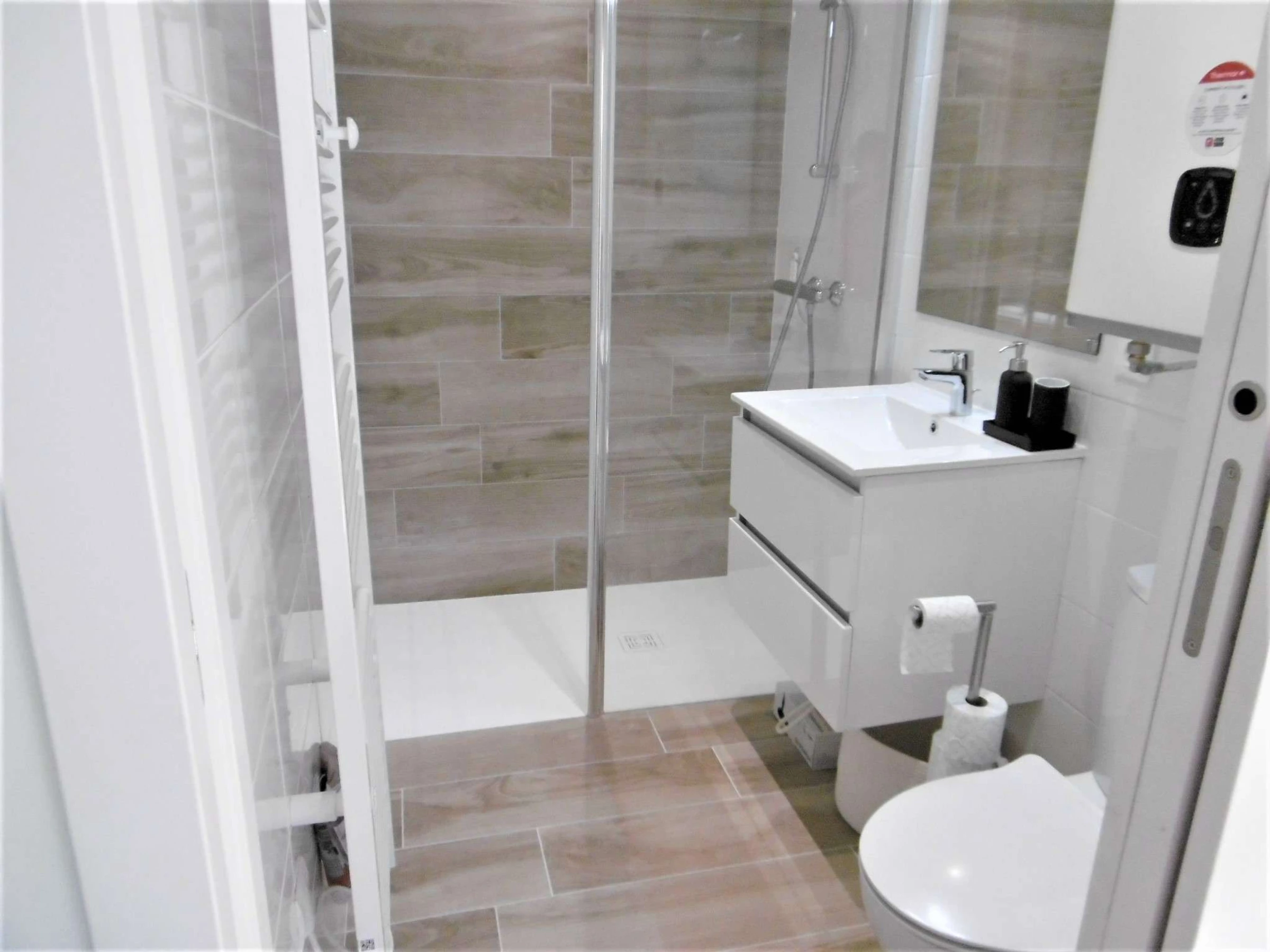 - Ein Badezimmer mit ebenerdiger Dusche / Toilette