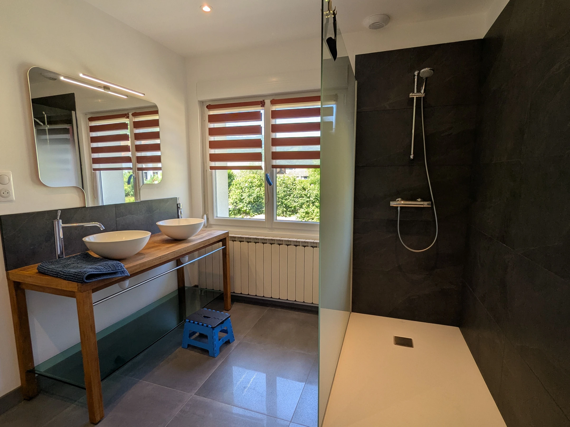 Obergeschoss -> Ein Schlafzimmer mit zwei 90x190cm Betten und ein weiteres Schlafzimmer mit einem 140x190cm niedrigen Bett - ein zweites Badezimmer mit Dusche und WC.