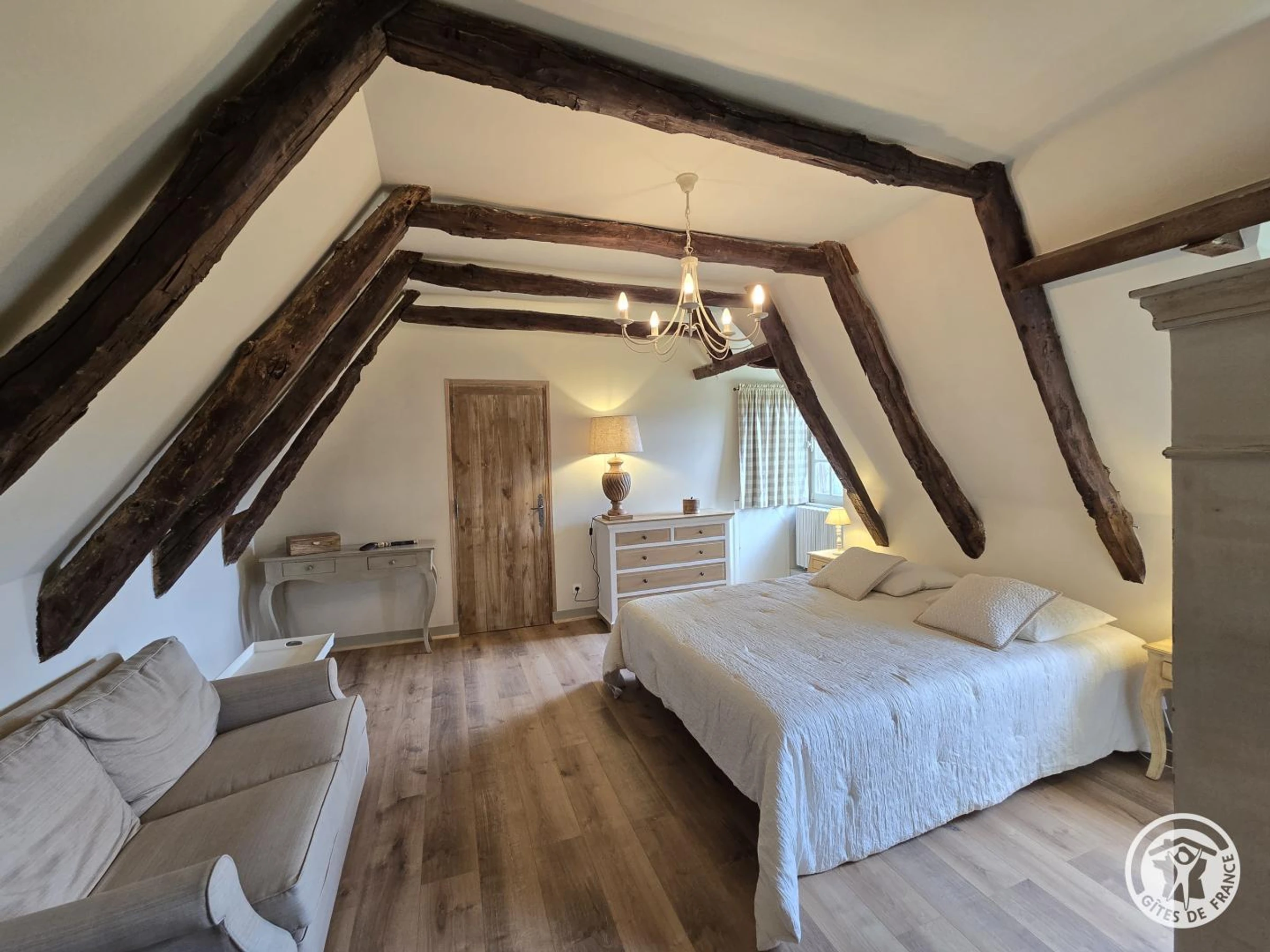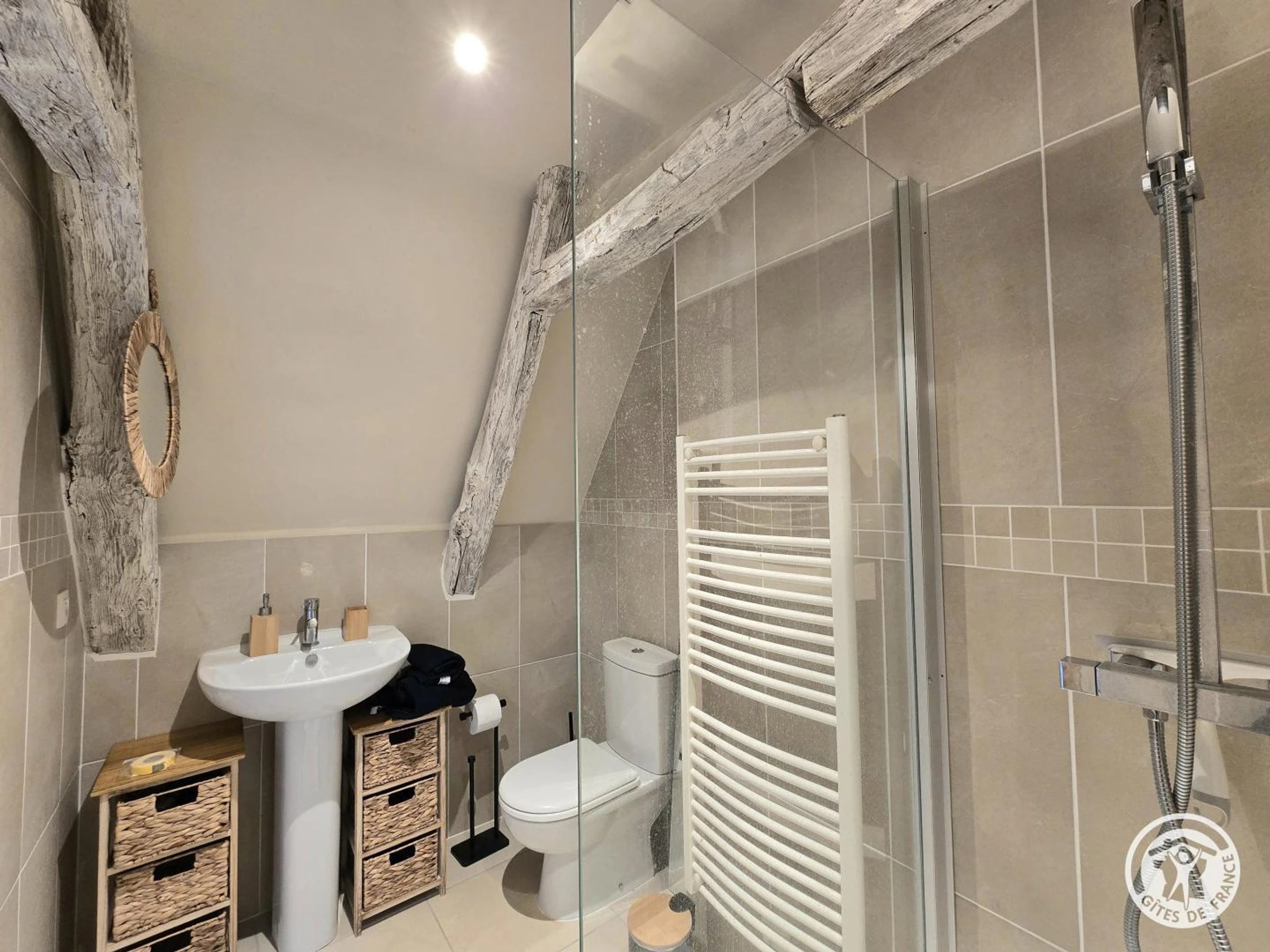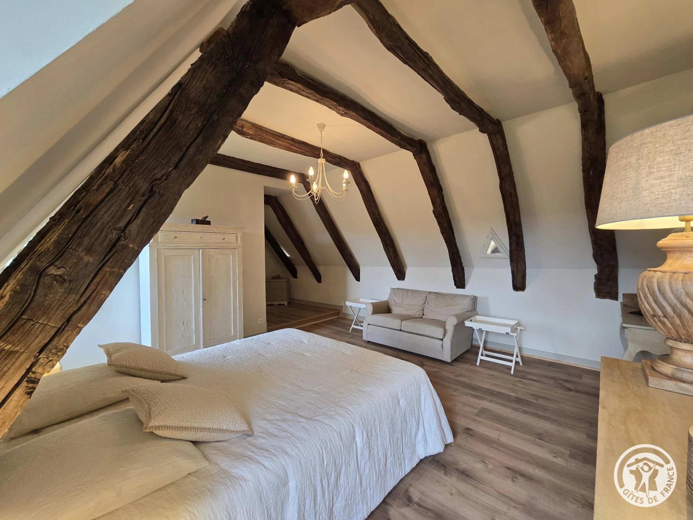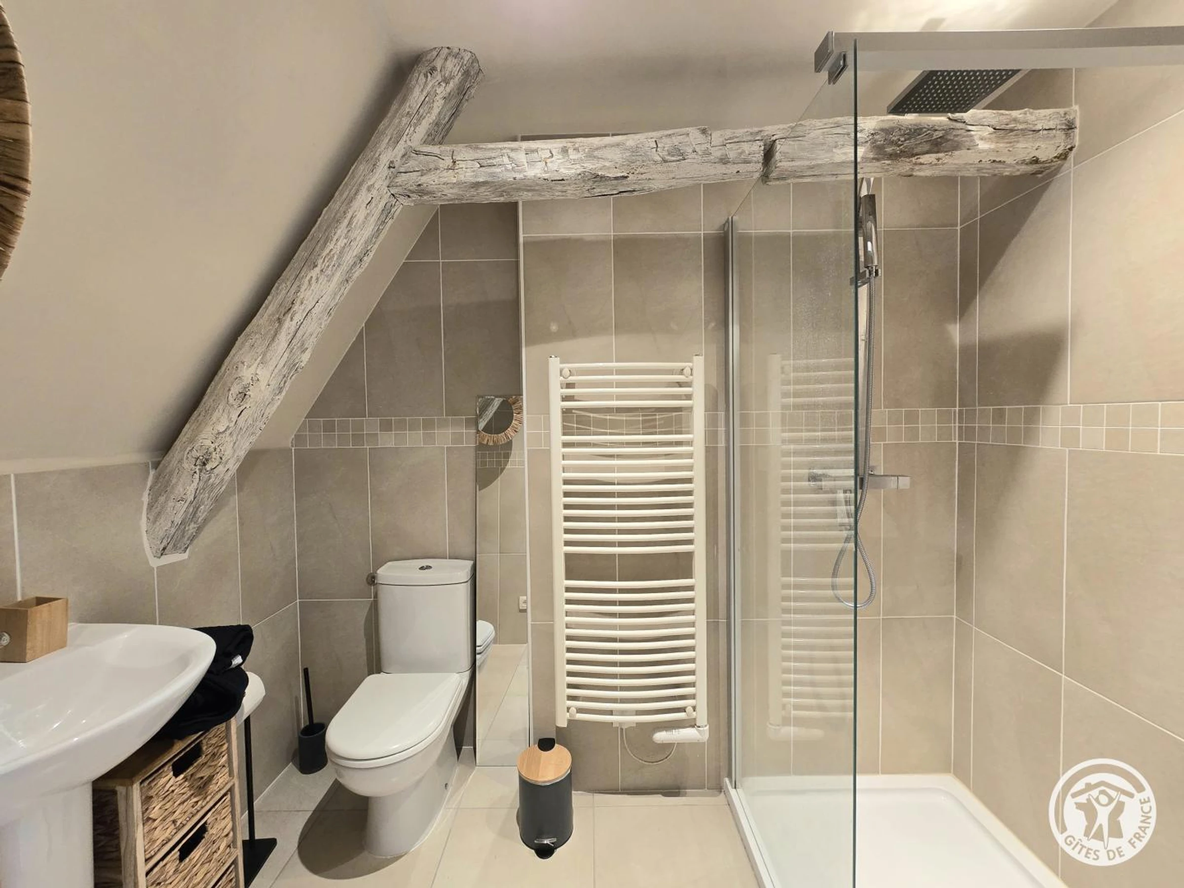 Obergeschoss: Erste Suite mit Queensize-Bett und eigenem Duschbad mit WC. Zweites Dachgeschoss-Schlafzimmer mit Kingsize-Bett und eigenem Duschbad (Dusche und WC). Drittes Schlafzimmer mit Queensize-Bett und eigenem Badezimmer mit Badewanne und WC.