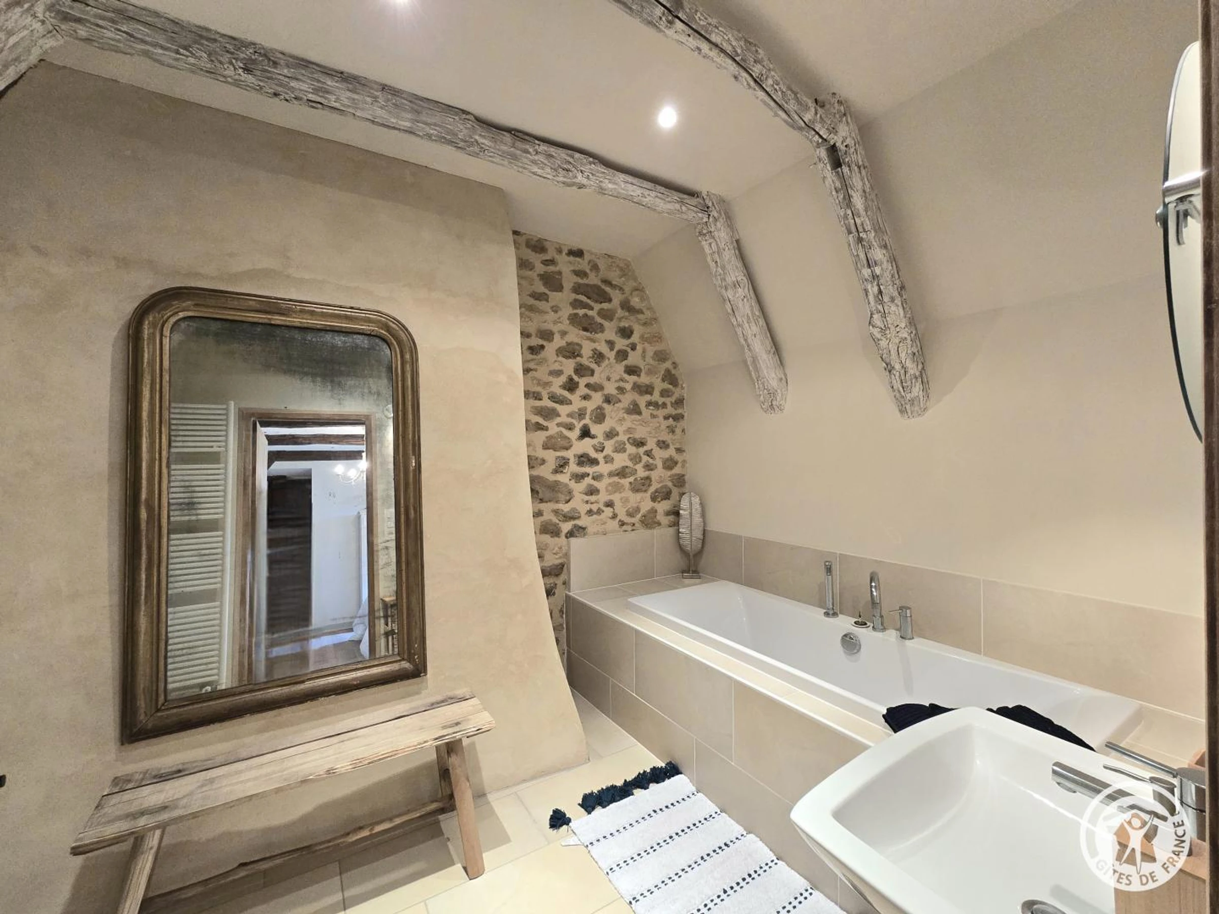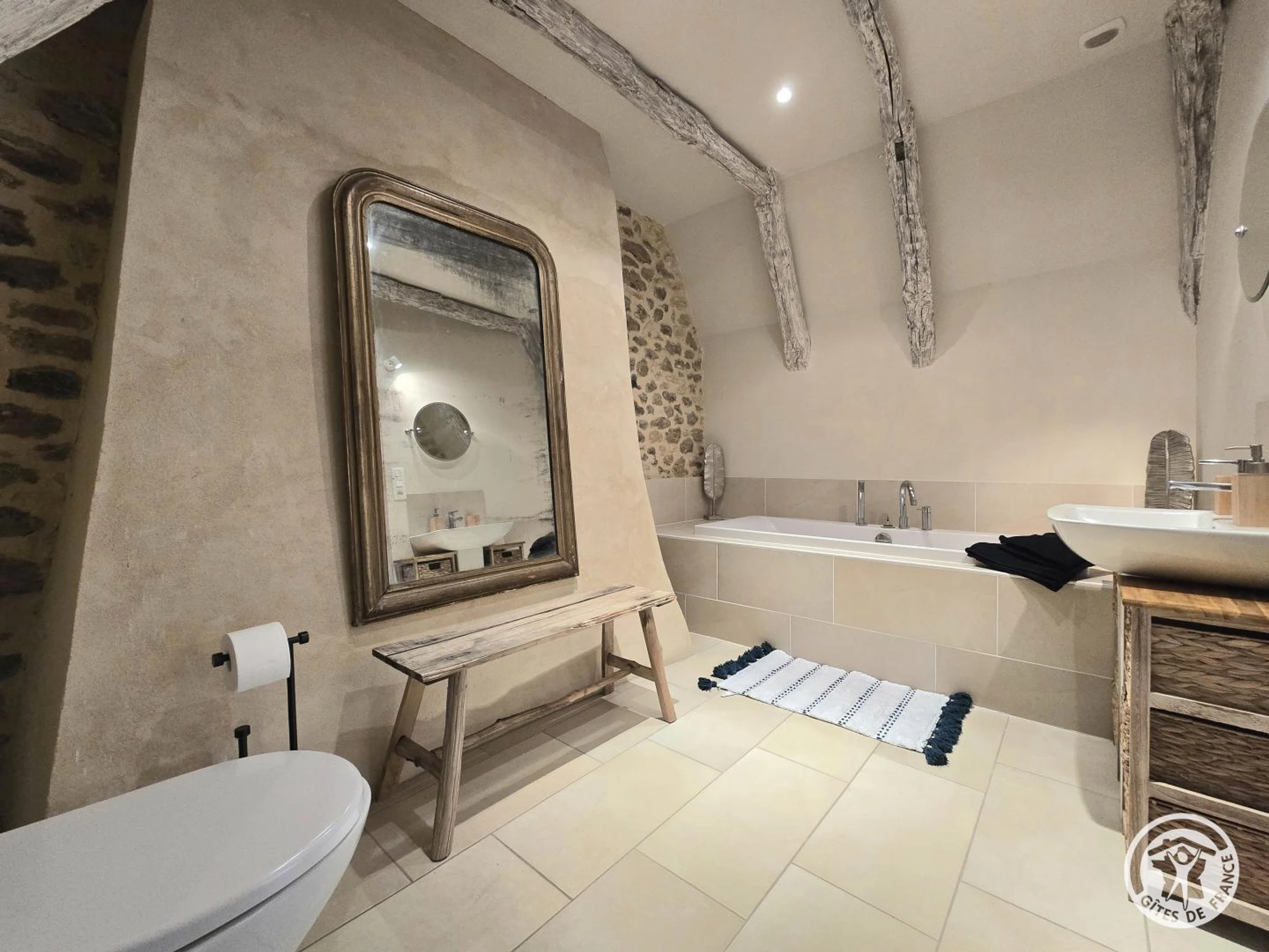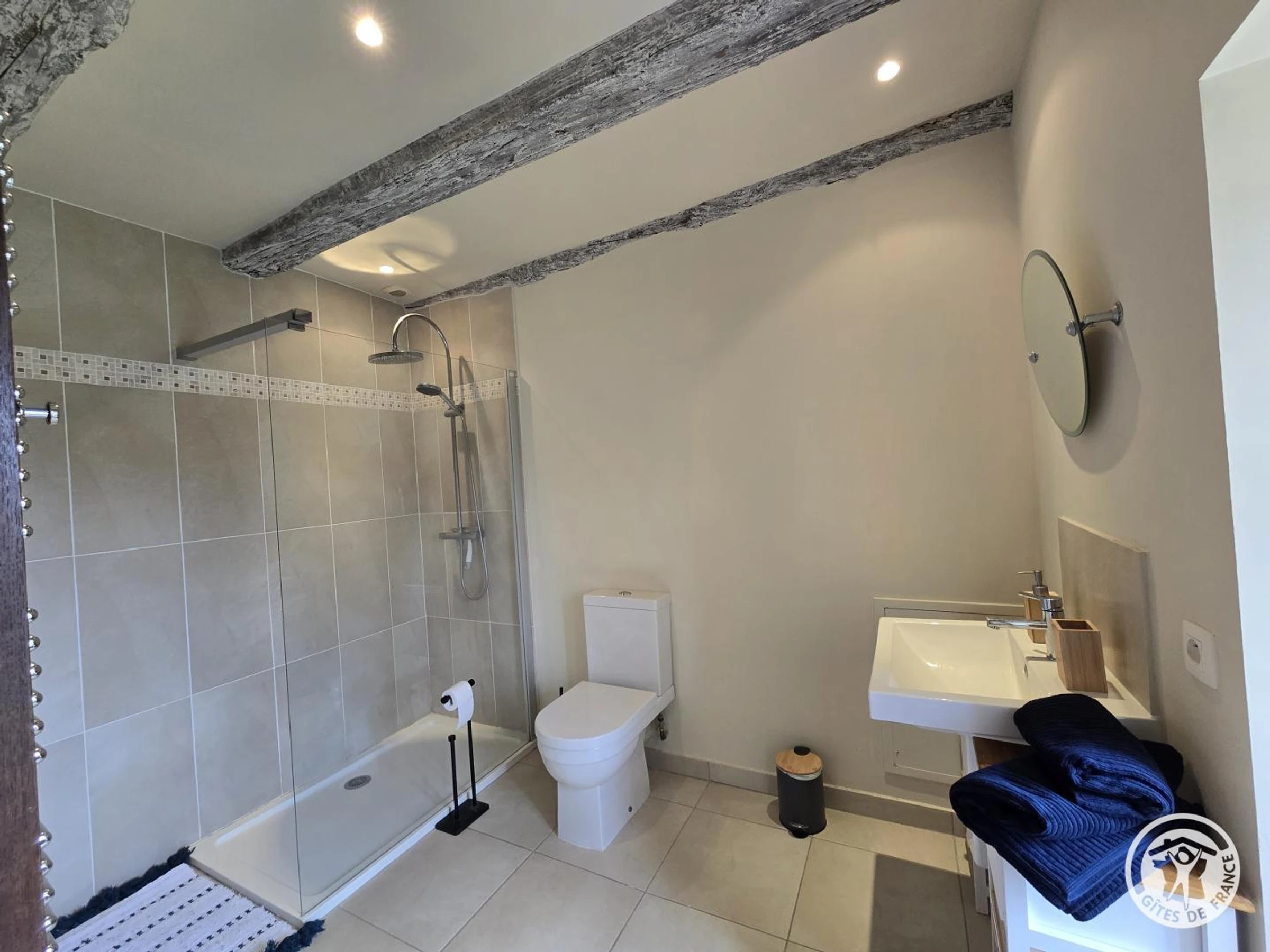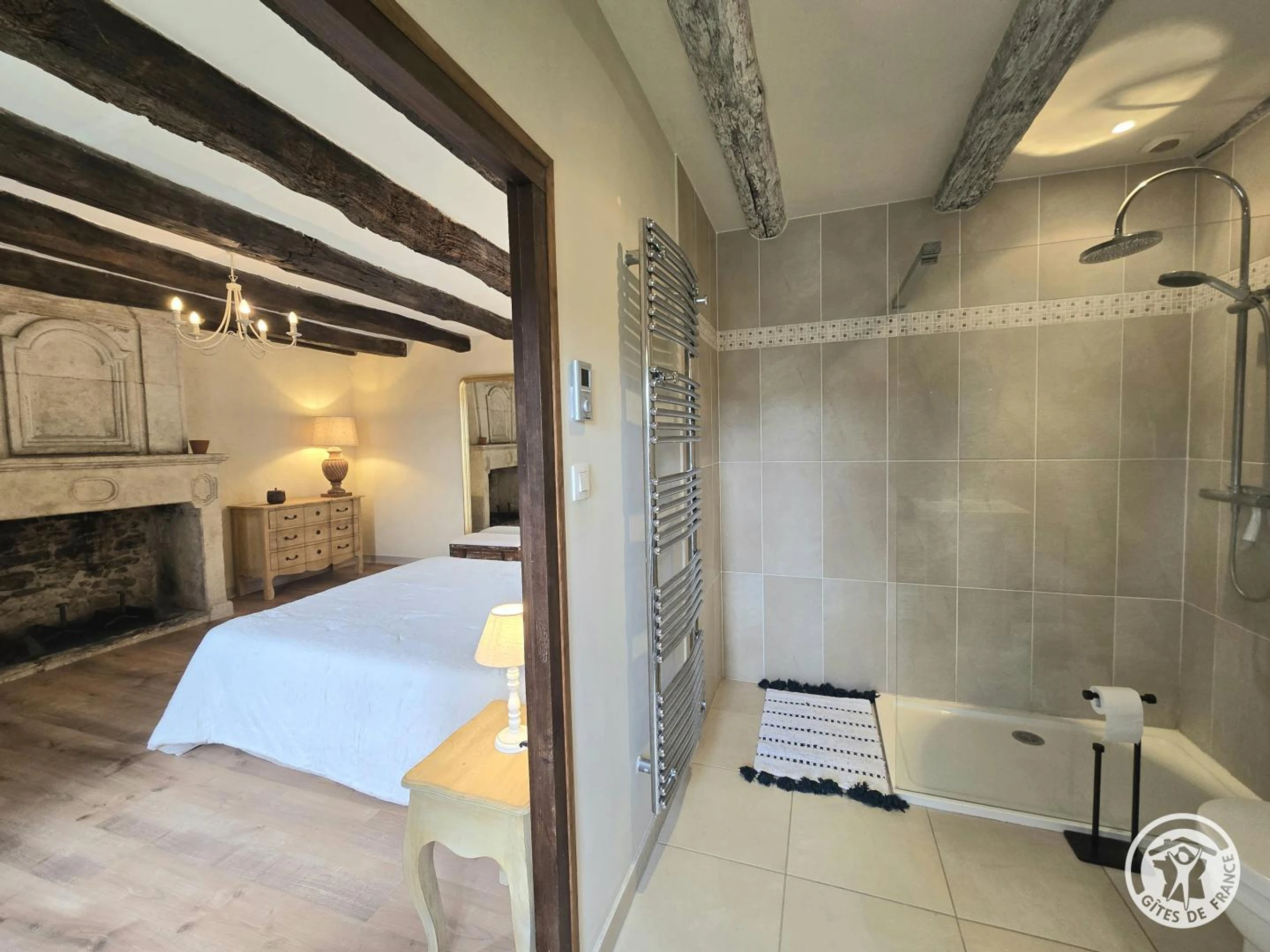 Obergeschoss: Erste Suite mit Queensize-Bett und eigenem Duschbad mit WC. Zweites Dachgeschoss-Schlafzimmer mit Kingsize-Bett und eigenem Duschbad (Dusche und WC). Drittes Schlafzimmer mit Queensize-Bett und eigenem Badezimmer mit Badewanne und WC.
