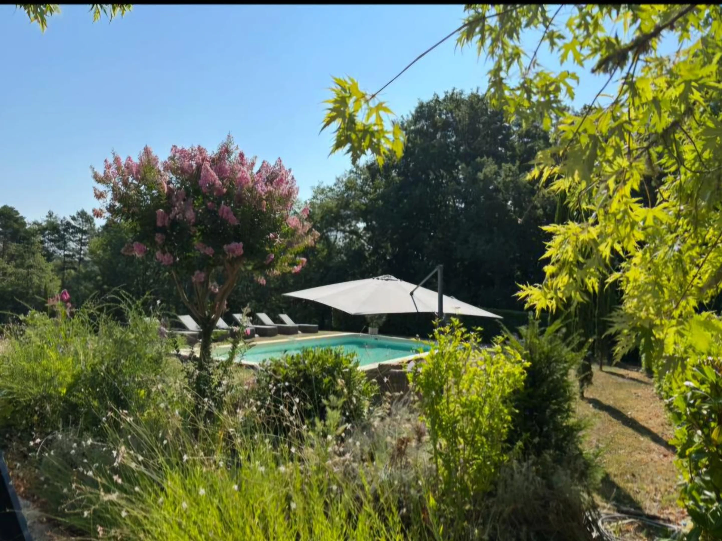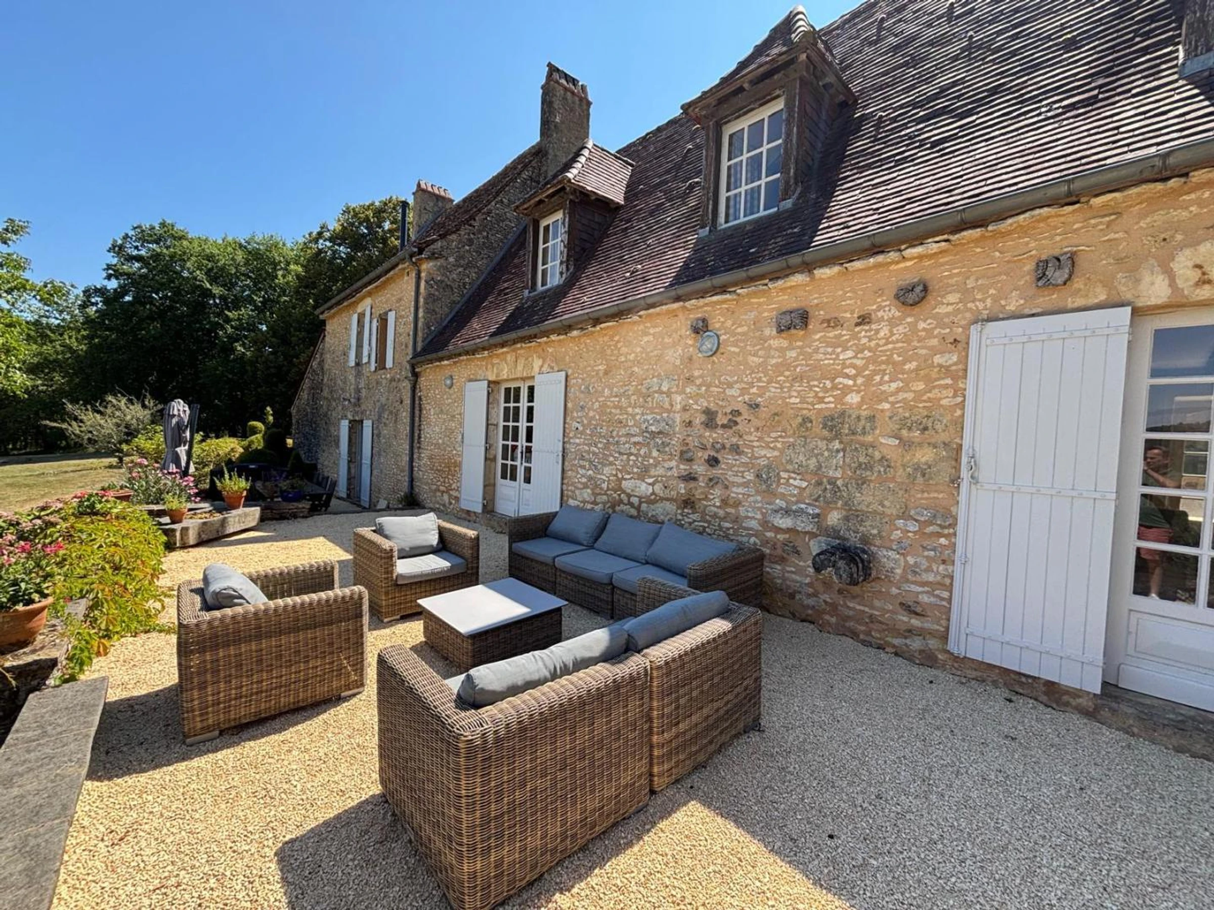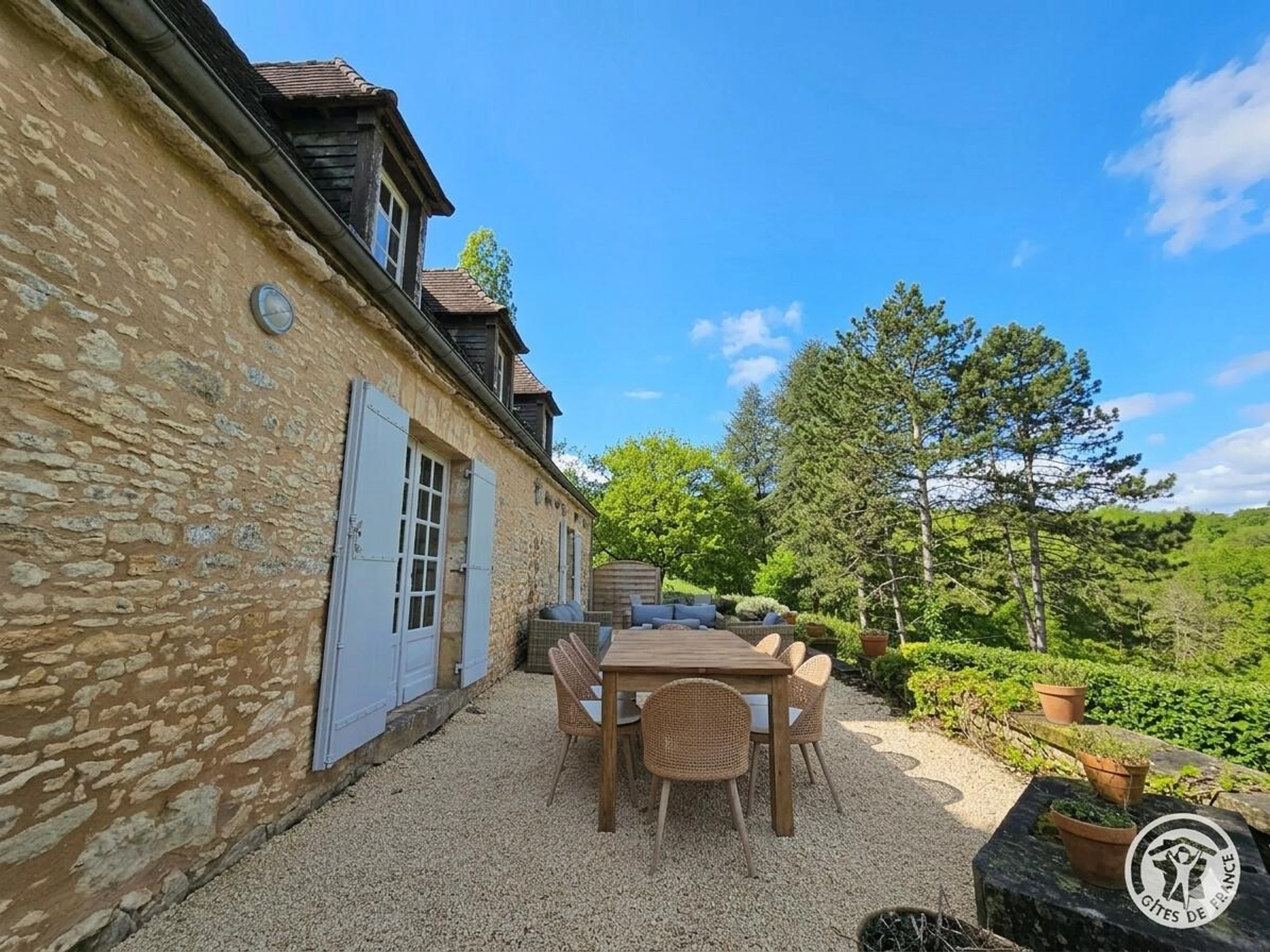 Letztes Schlafzimmer im Turm, nur von außen zugänglich, mit zwei Einzelbetten, die zusammengestellt werden können. Privater 11 x 5 m großer Salzwasserpool mit Alarmanlage, geöffnet vom 1. Mai und beheizt vom 1. Juni bis Ende September. Terrasse mit Gartenmöbeln und Essbereich um den Plancha-Grill (mit Flügeltüren von Küche und Wohnzimmer). Das 20 Hektar große Anwesen bietet eine weitläufige Landschaft mit Panoramablick auf das Périgord Noir. Die Wiesen und Wälder rund um das Anwesen bilden eine traumhafte Kulisse und laden zu Spaziergängen in unberührter Natur ein.