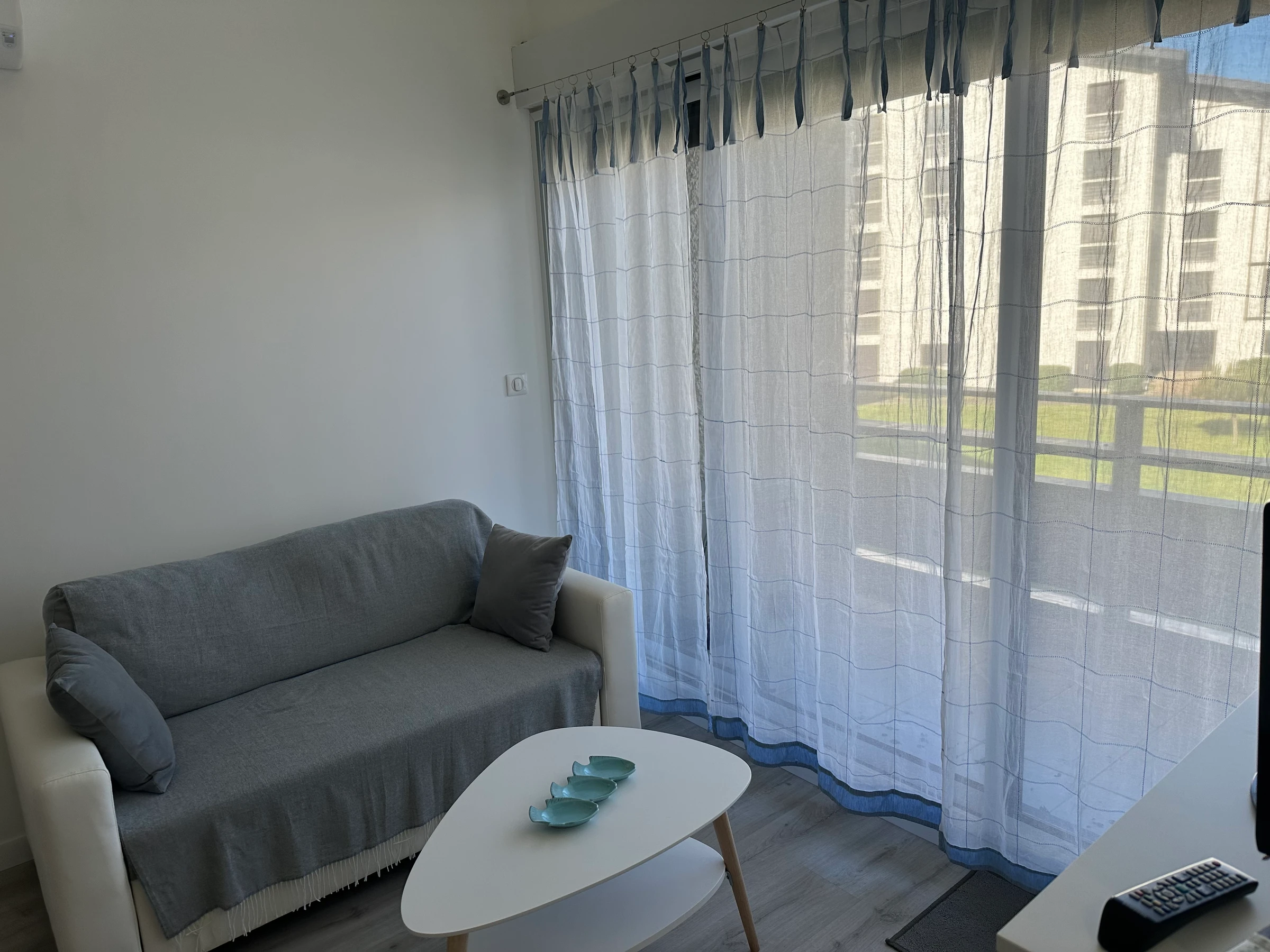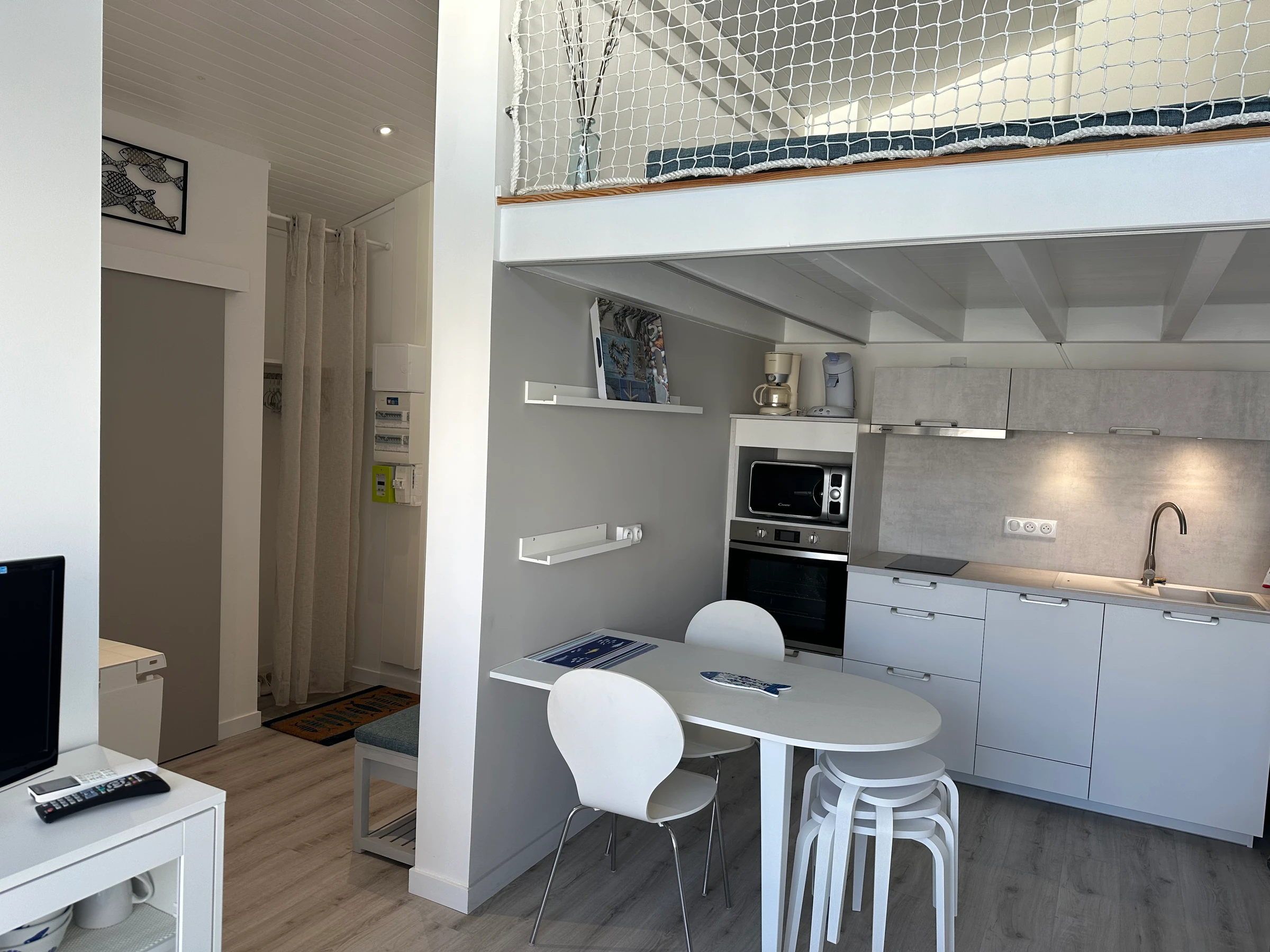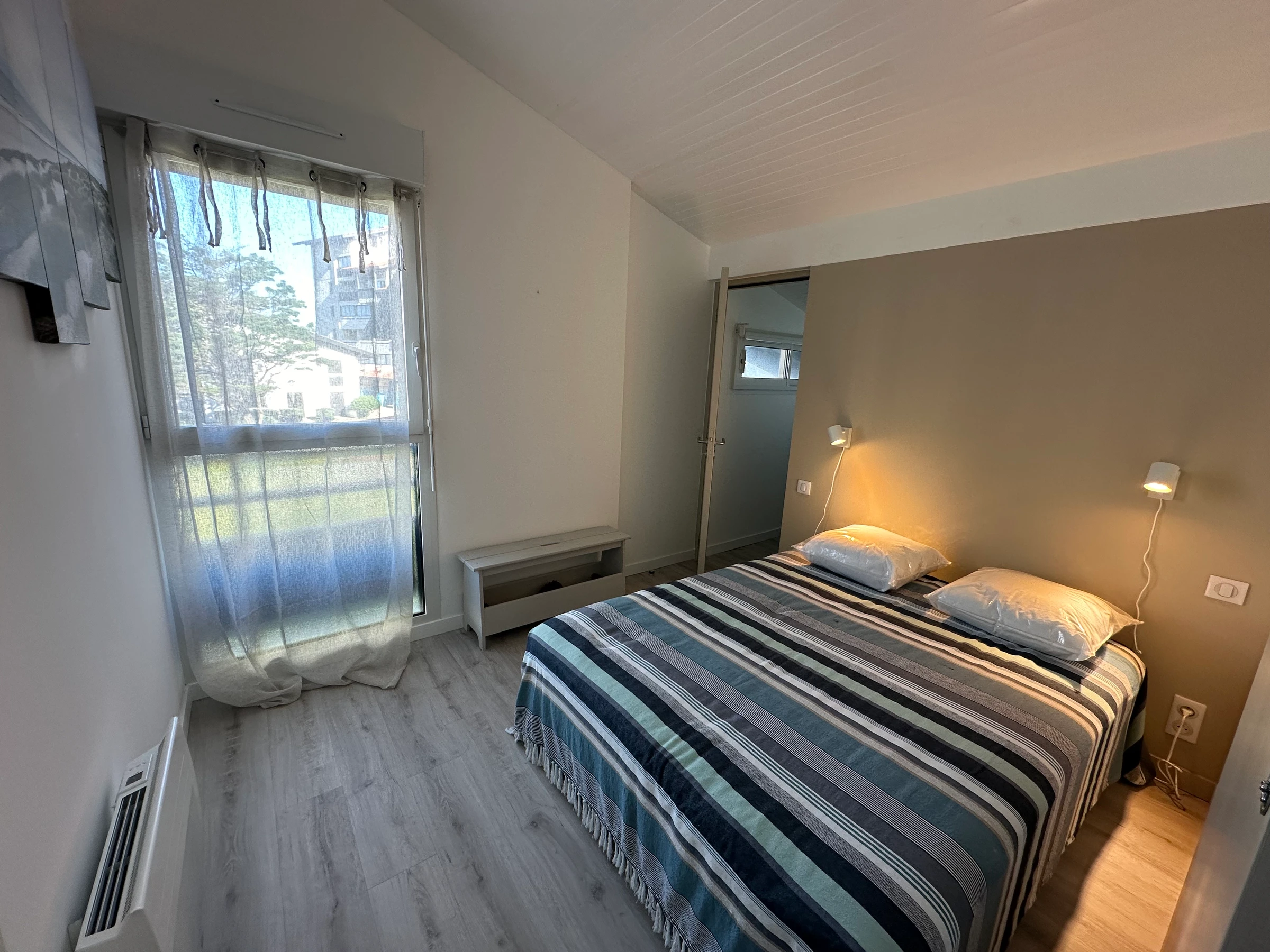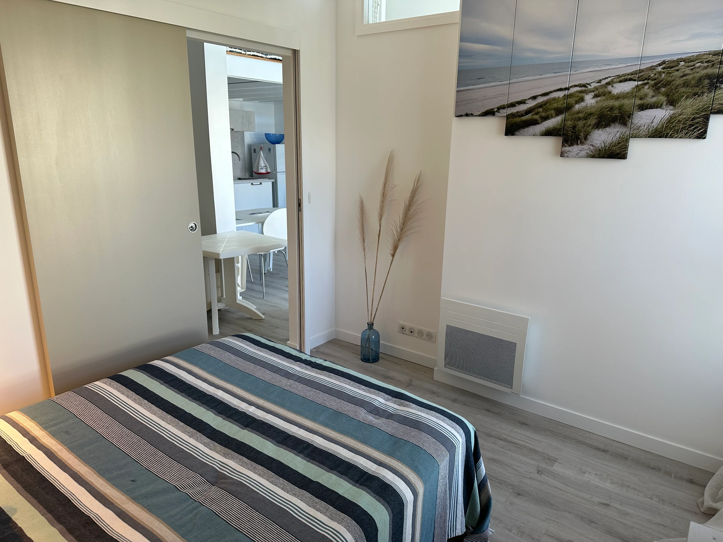 Wunderschönes, helles und geräumiges Apartment, geschmackvoll eingerichtet, ideal für einen gelungenen Strandurlaub. Es befindet sich in einer Residenz (ohne Aufzug) in der Nähe von Geschäften und dem Meer und verfügt über einen Eingangsbereich, ein gemütliches, geschmackvoll eingerichtetes Wohnzimmer mit Klimaanlage und Zugang zum Esszimmer, eine gut ausgestattete Küche, ein Badezimmer und ein Zwischengeschoss. Der Schlafbereich umfasst ein Schlafzimmer mit einem Doppelbett (140 cm) und ein kleines angrenzendes Schlafzimmer (4 m²) mit Etagenbetten (90 cm).
