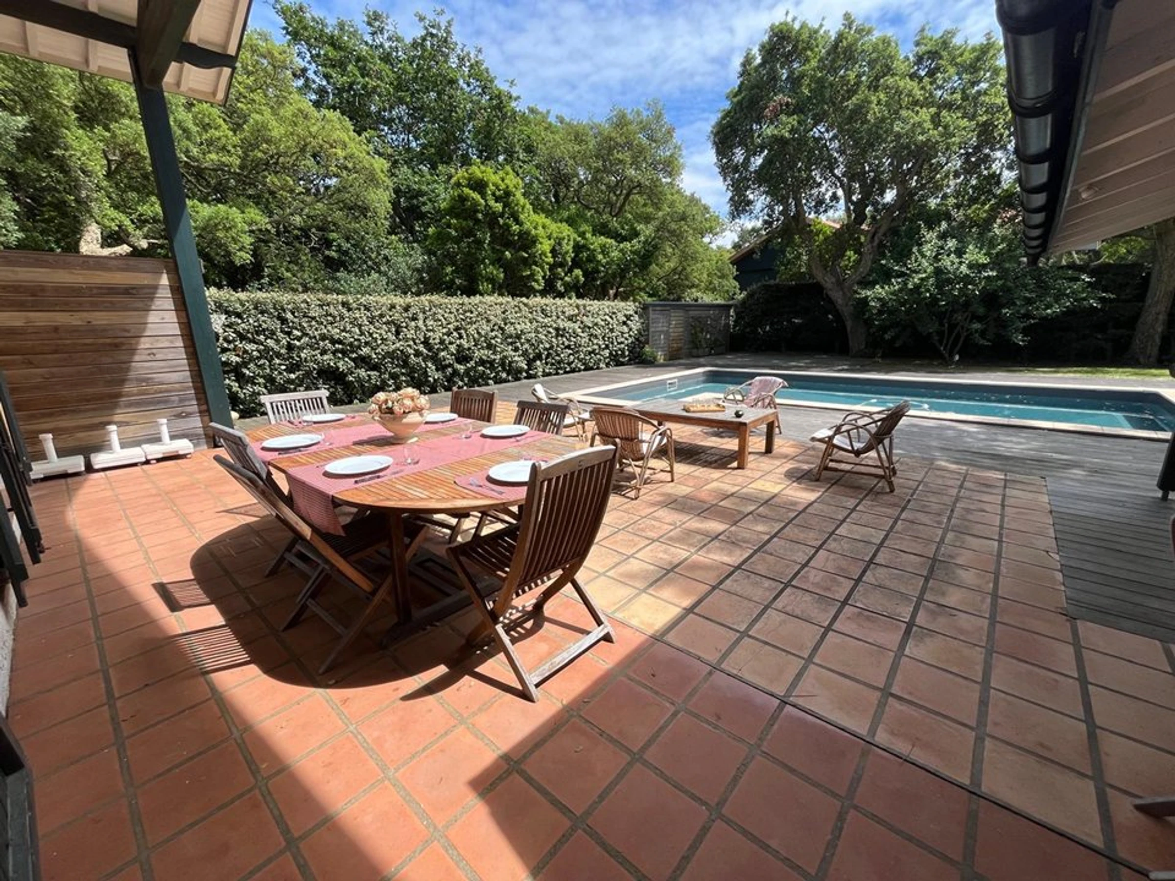 Terrasse mit Gartenmöbeln und Liegestühlen