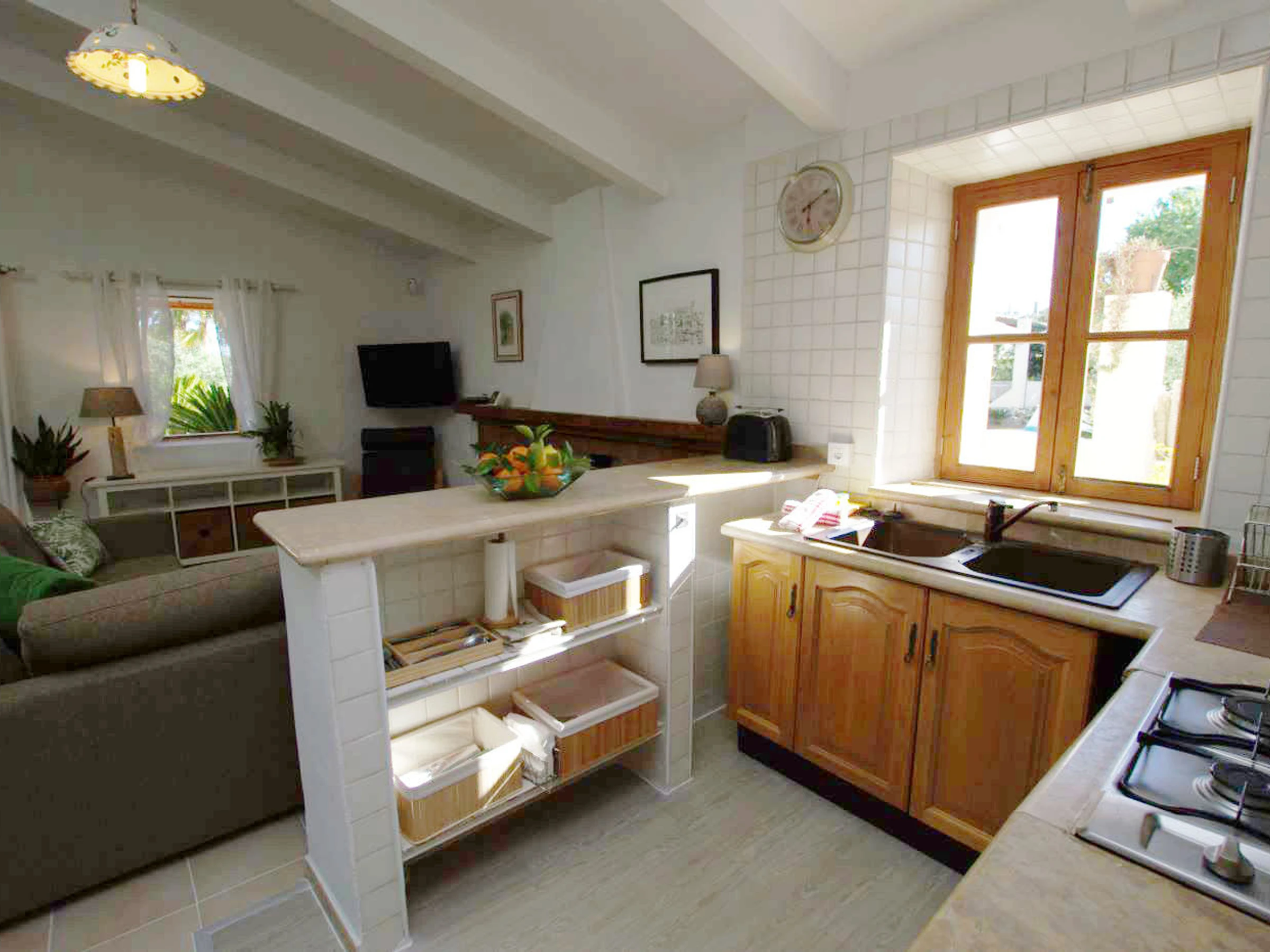 Es hat auch ein Haus mit zwei Schlafzimmern, zwei Badezimmern und einem großen Wohnzimmer, das mit der Küche verbunden ist.