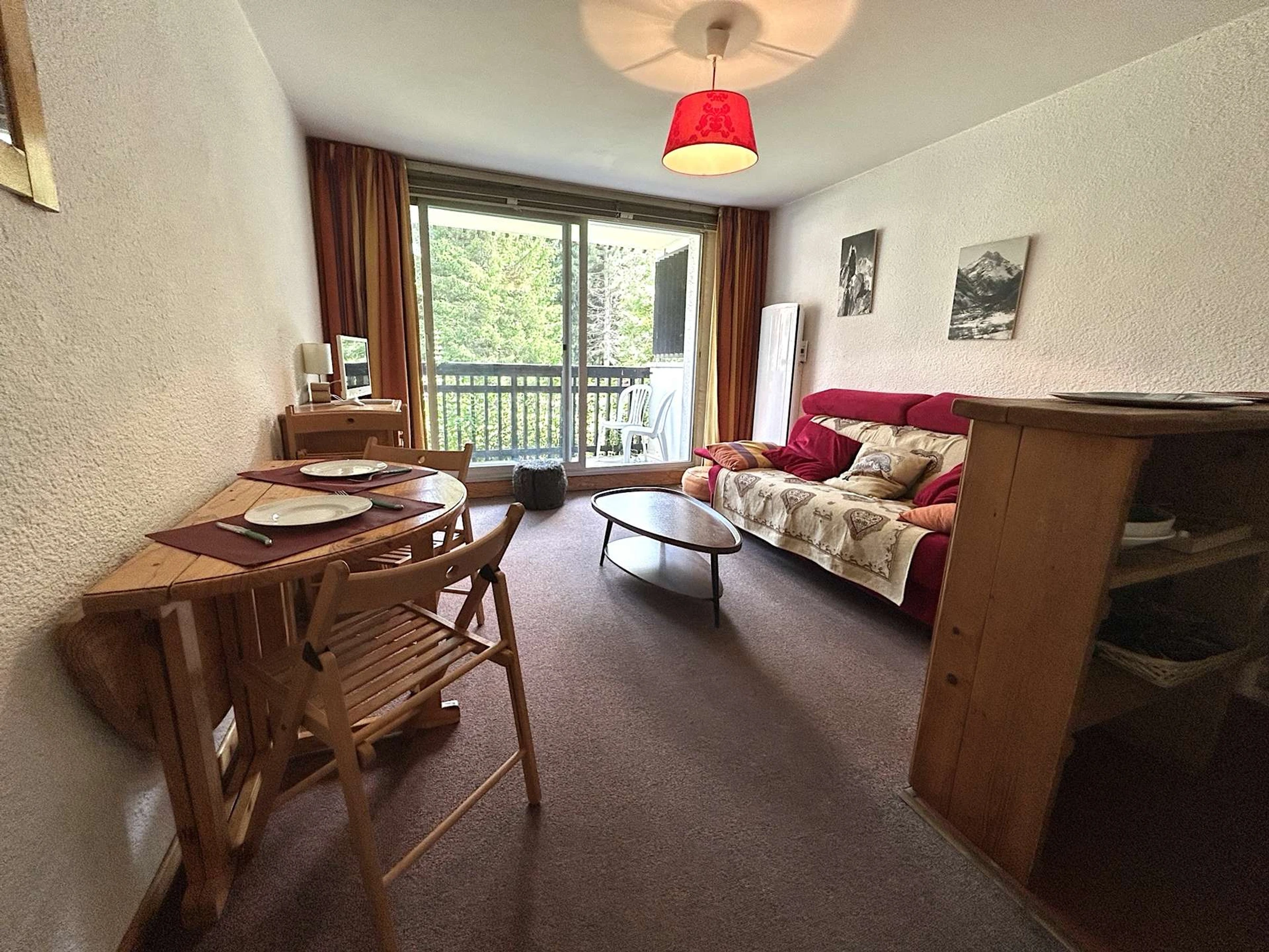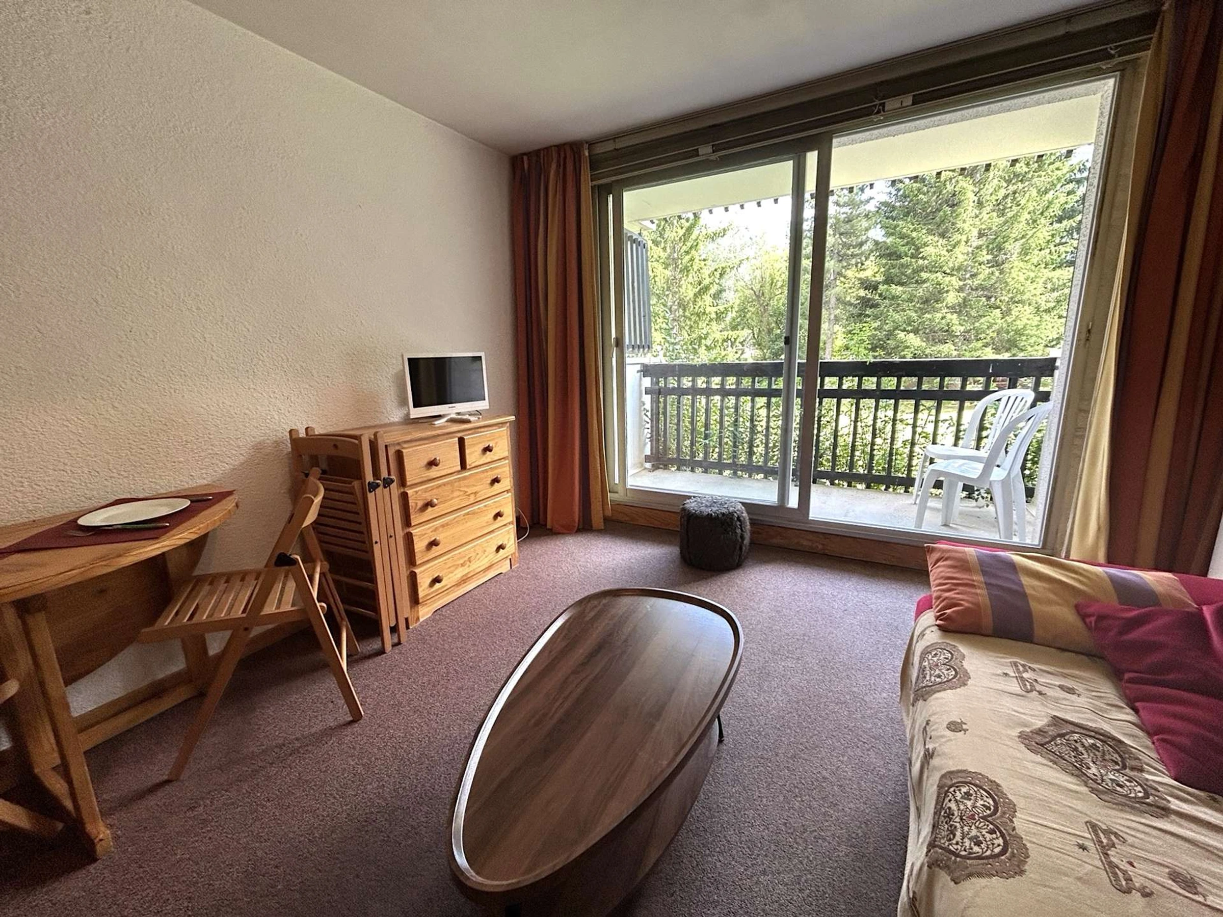 Unterkunft: Dieses Apartment in der Residenz Plaine Alpe 2 besteht aus einem Wohnzimmer mit einem Schlafsofa für zwei Personen und einem Fernseher. Es verfügt über einen Balkon und einen voll ausgestatteten Küchenbereich mit zwei Cerankochfeldern, einer Mikrowelle und mehr. In der Bergecke dieser Ski-Ferienwohnung sind Etagenbetten aufgestellt. Das Duschbad verfügt über eine Toilette.