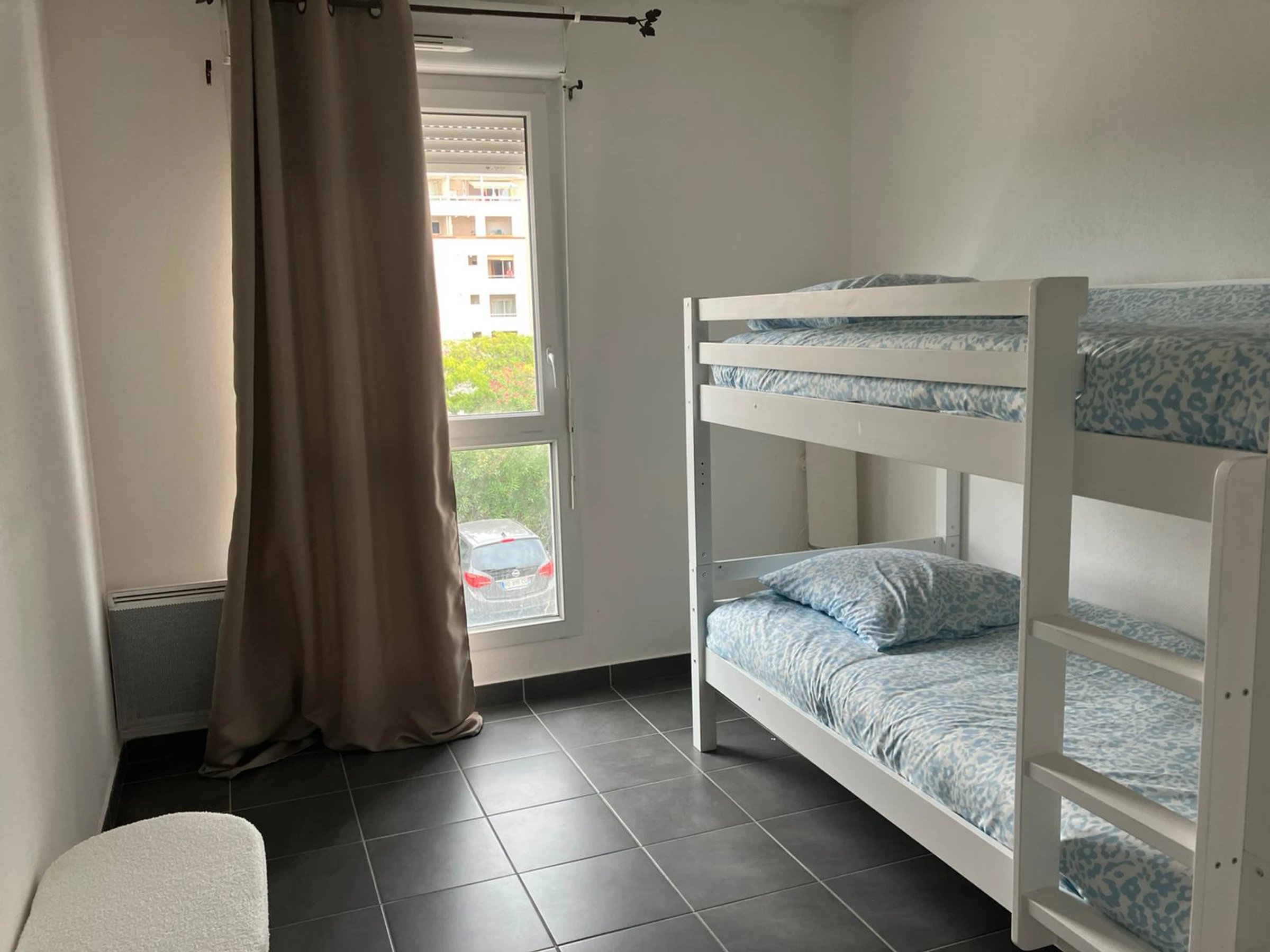 einem Eingangsbereich, der zum Schlafbereich führt. Dieser umfasst zwei große Schlafzimmer: eines mit einem Doppelbett (140 cm) und das andere mit zwei Etagenbetten (90 cm).