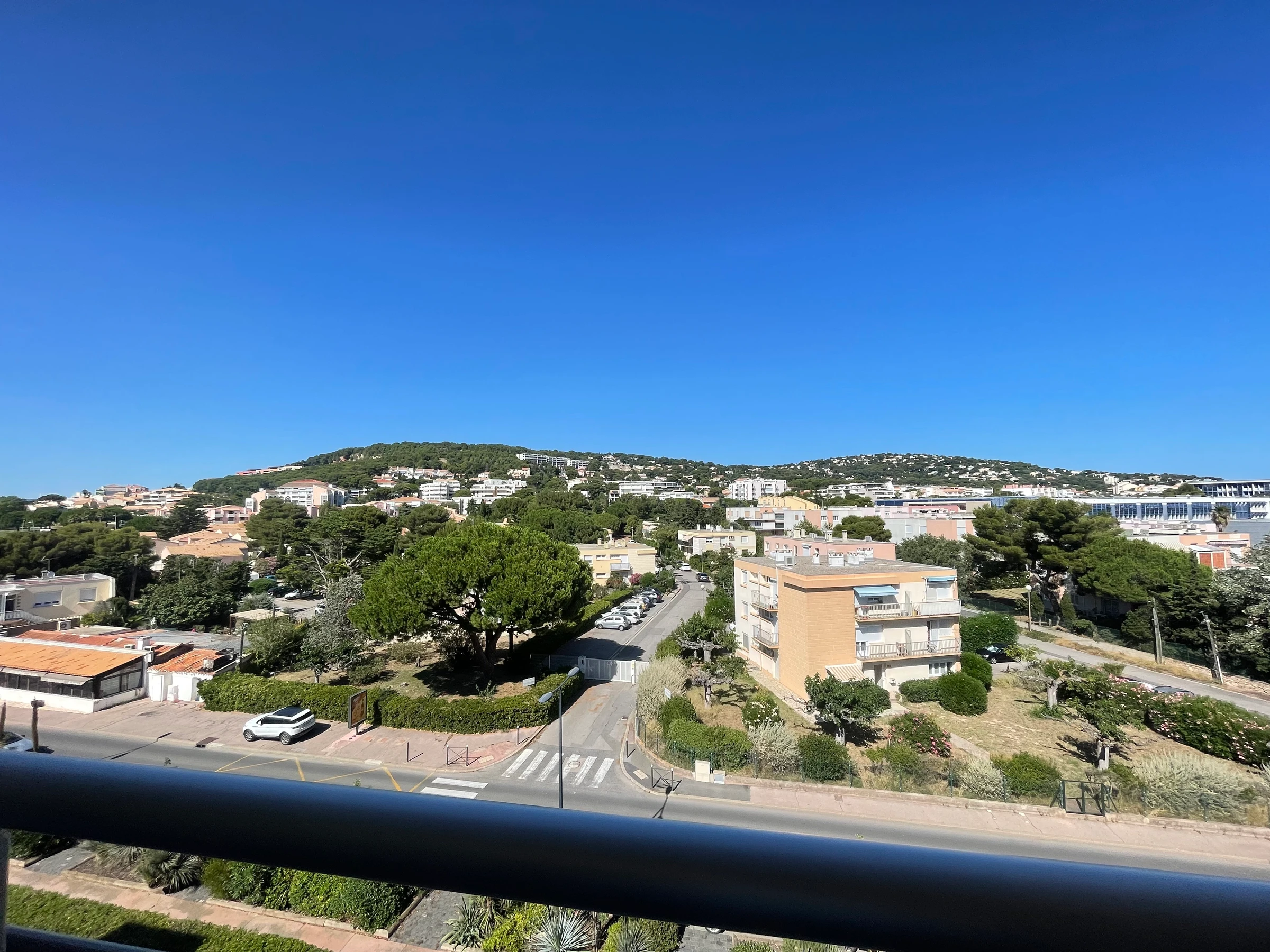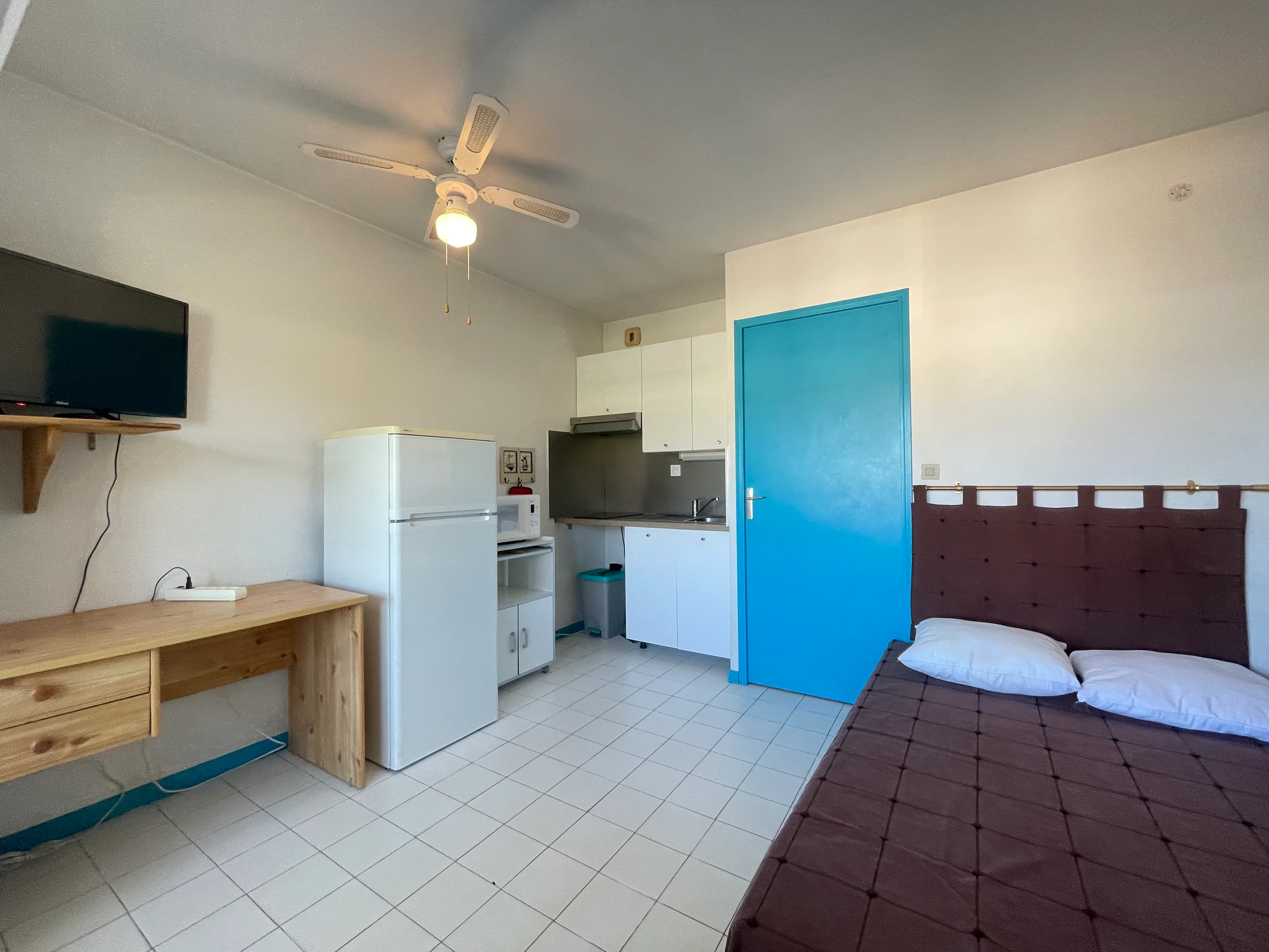 Ferienvermietung in Sète: Helle Studio-Hütte mit ca. 22 m² Wohnfläche und einer Veranda von 10 m². Es befindet sich im fünften und letzten Stock (mit Aufzug) und bietet einen Blick auf den Mont Saint-Clair. Seine Ausrichtung ist Osten. Die Strände sind 300 m und die Geschäfte 100 m entfernt. Das Wohnzimmer besteht aus einem Küchenbereich (mit 2 Kochplatten, Kühl-Gefrierkombination, Mikrowelle/Grill), einem Fernseher und einem Doppelbett. In der Kabine gibt es zwei Etagenbetten.