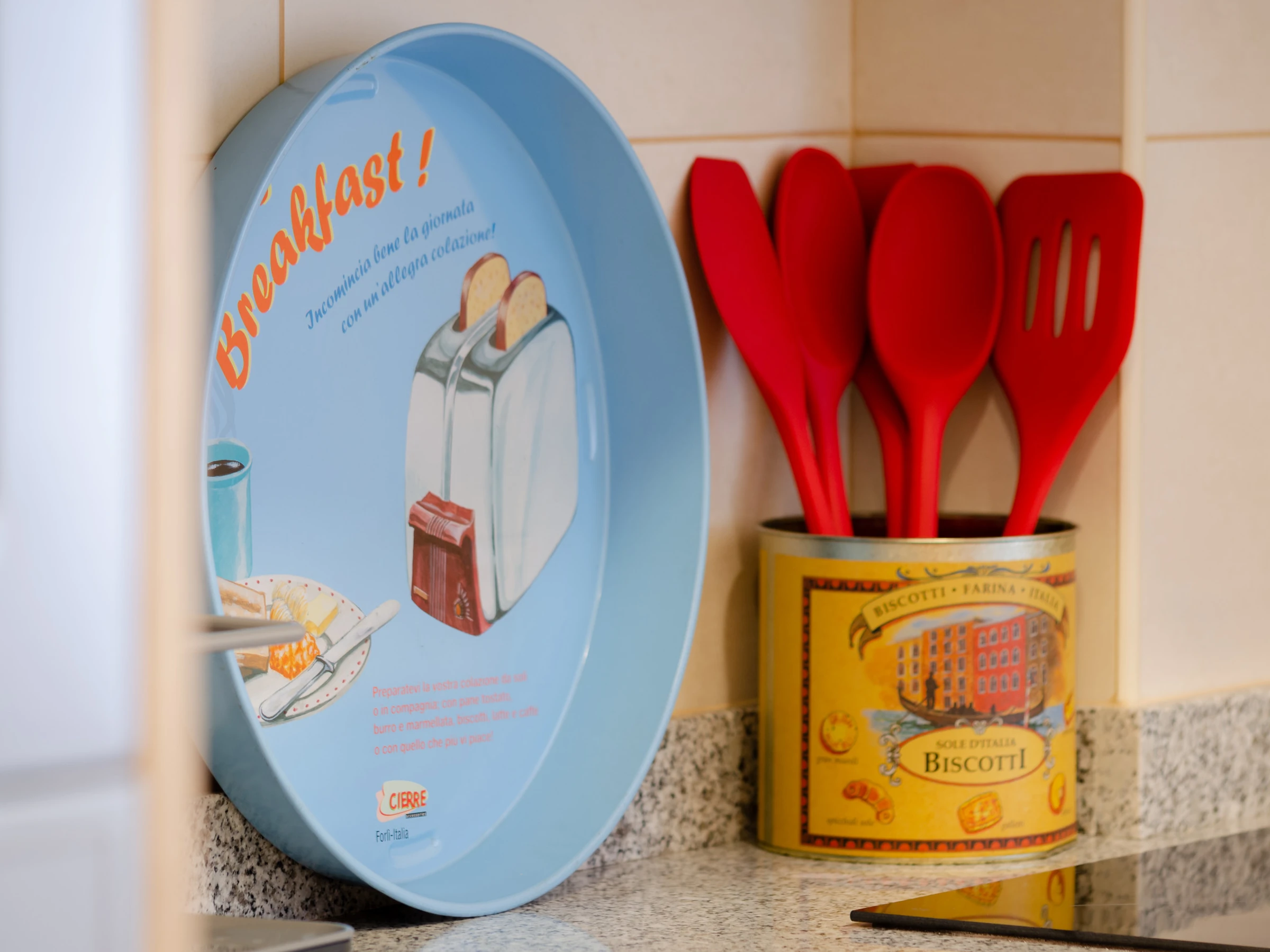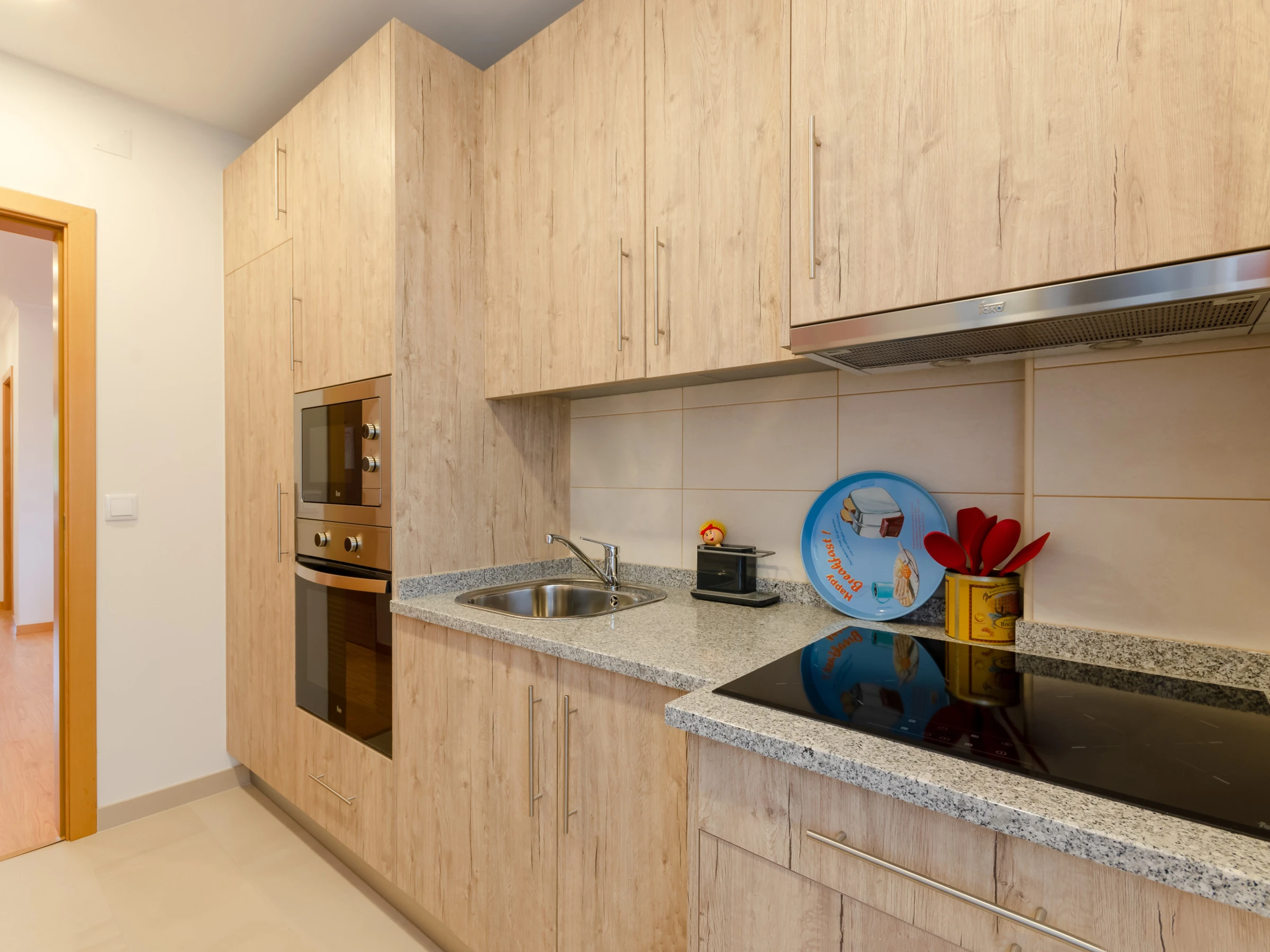 Dieses separate küche, mit induktions-kochfeld, ist ausgestattet in kühlschrank, mikrowelle, backofen, gefrierschrank, spülmaschine, geschirr/besteck, kochutensilien, kaffeemaschine, toaster und wasserkocher.