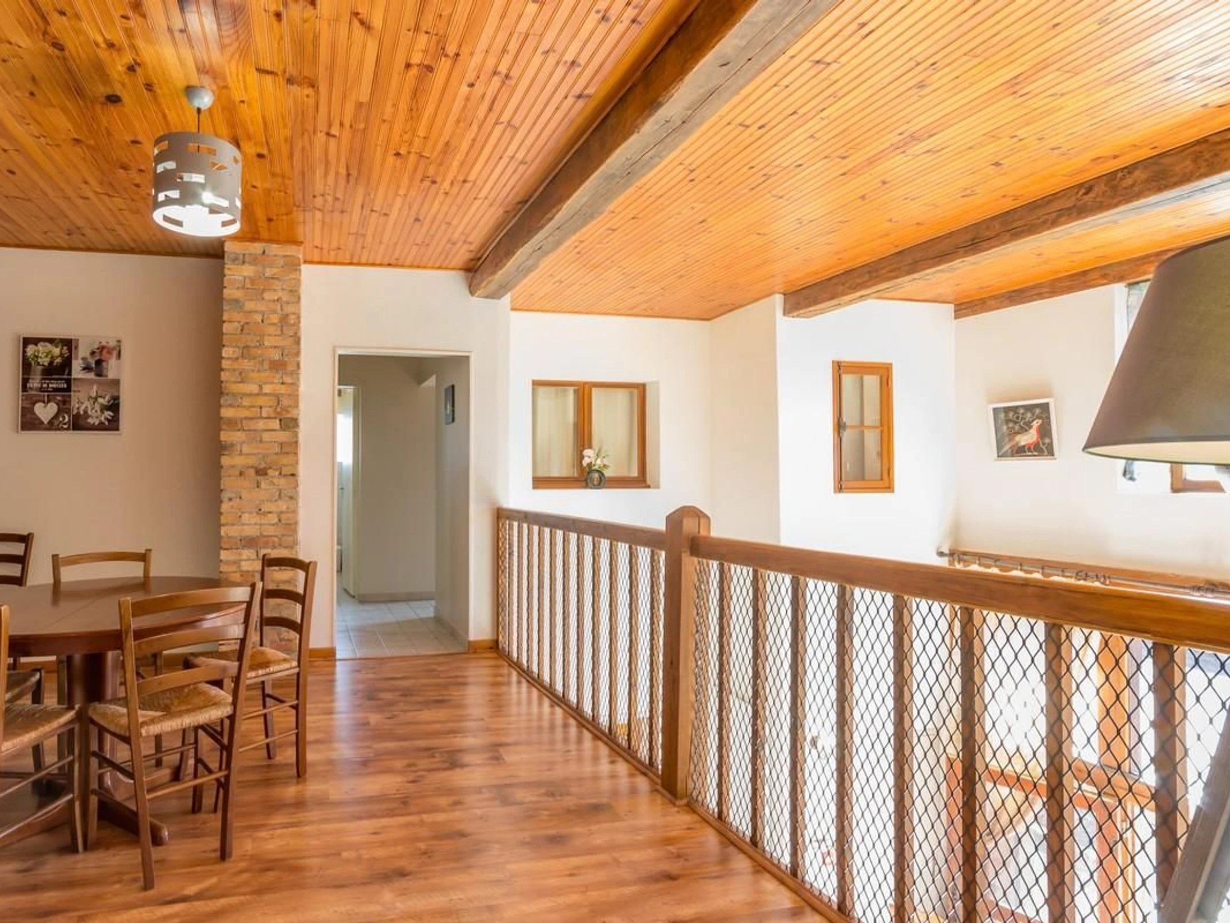 Im Obergeschoss befinden sich drei Schlafzimmer, zwei mit je zwei Einzelbetten (90 x 190 cm) und das letzte mit einem Doppelbett (140 x 190 cm). Ein Badezimmer befindet sich im Obergeschoss, zwei ebenerdige Duschen im Erdgeschoss. Zwei WCs sind ebenfalls vorhanden. Die Heizung wird elektrisch betrieben (nach Verbrauch). Zur Ausstattung gehören zwei Reisebetten, ein Hochstuhl, ein Kindersitz und eine Babybadewanne.
