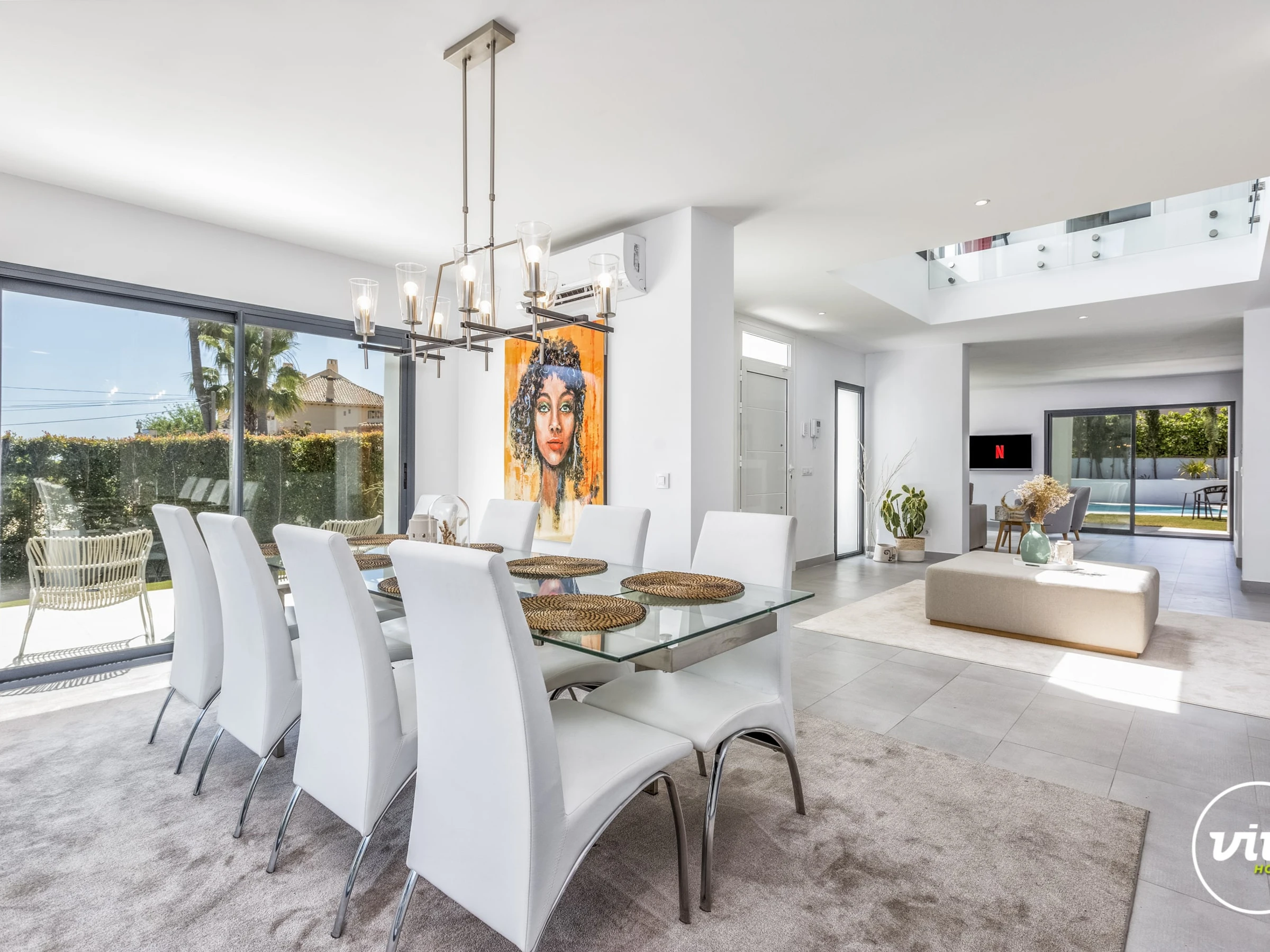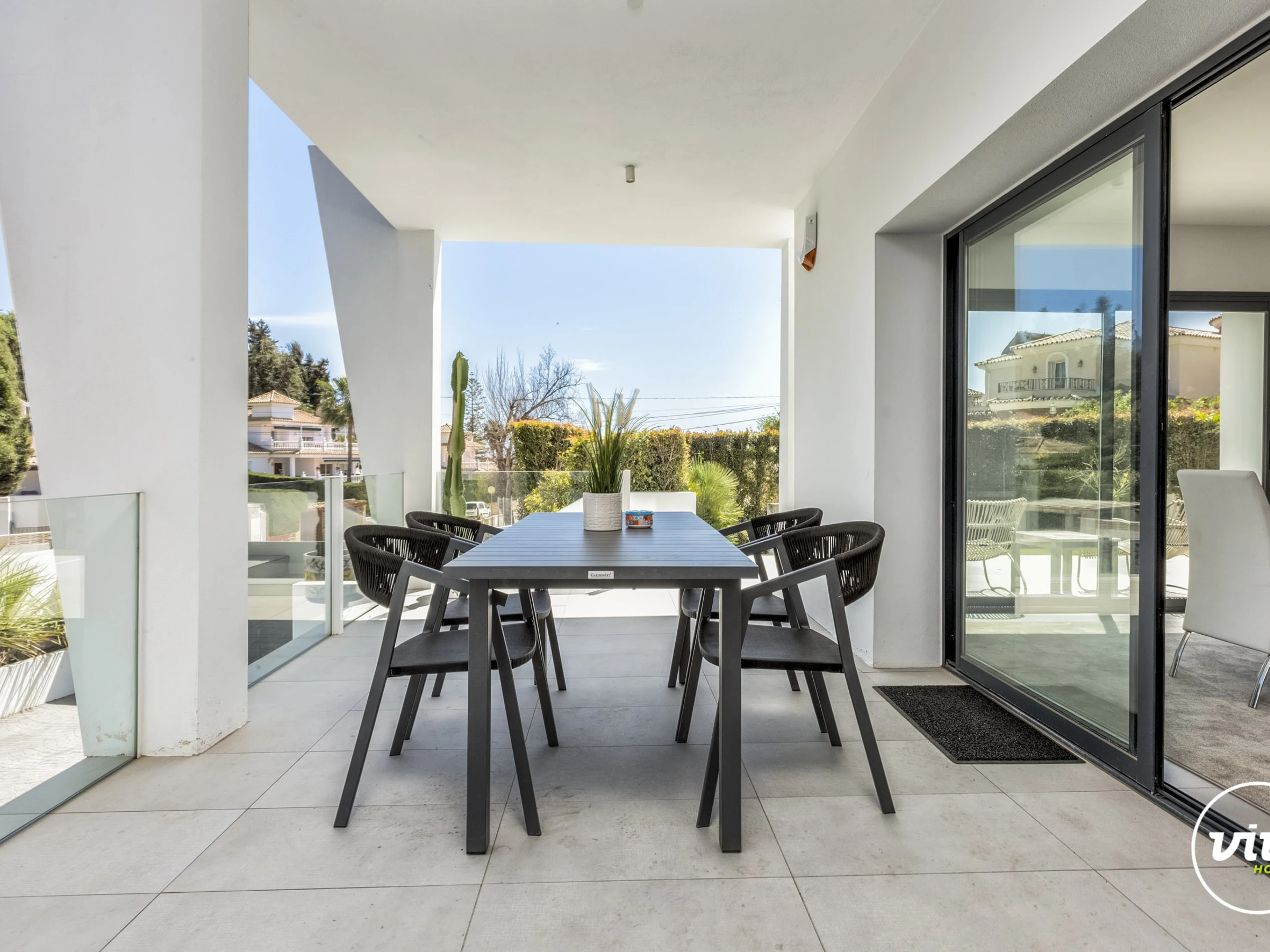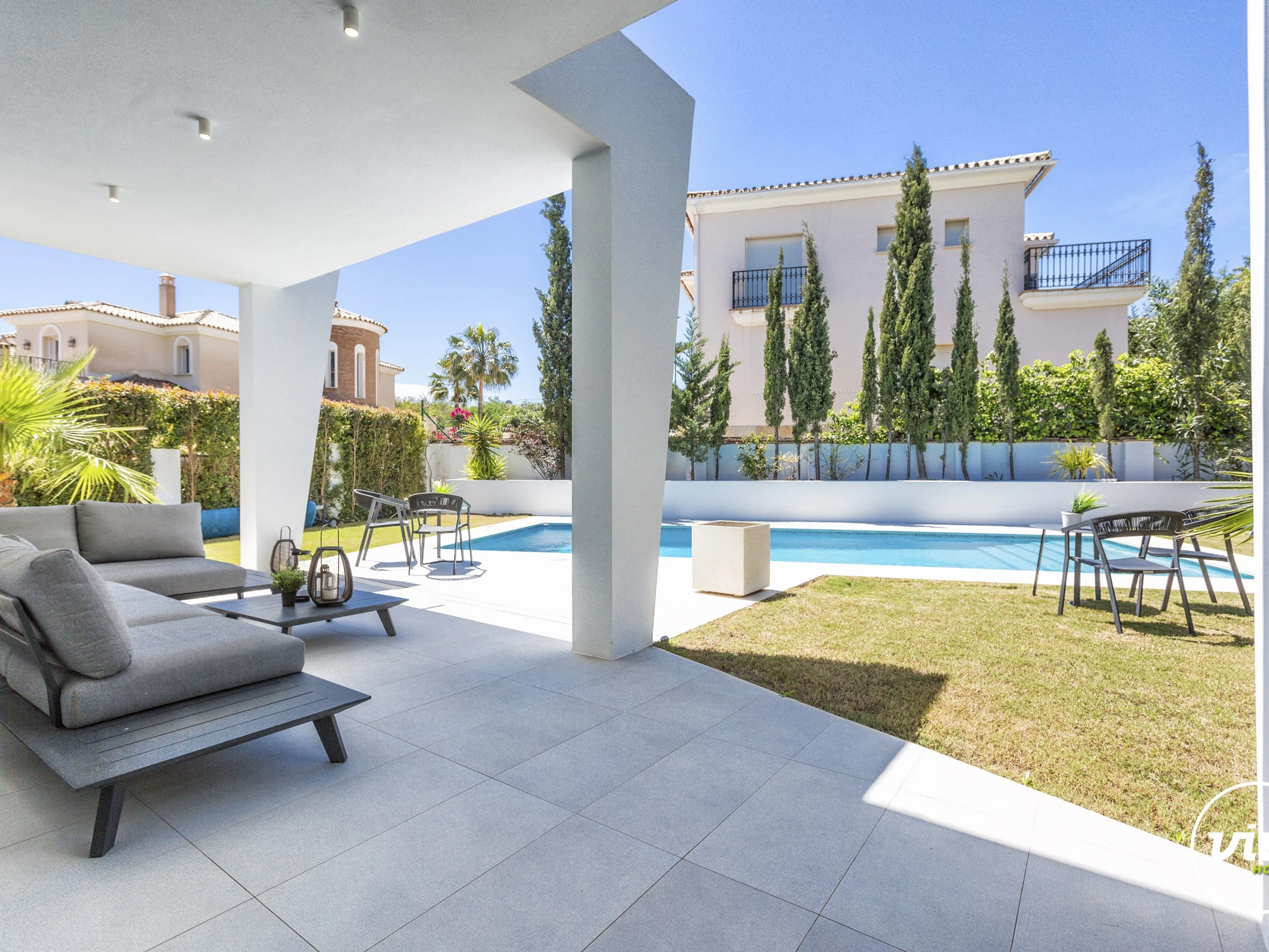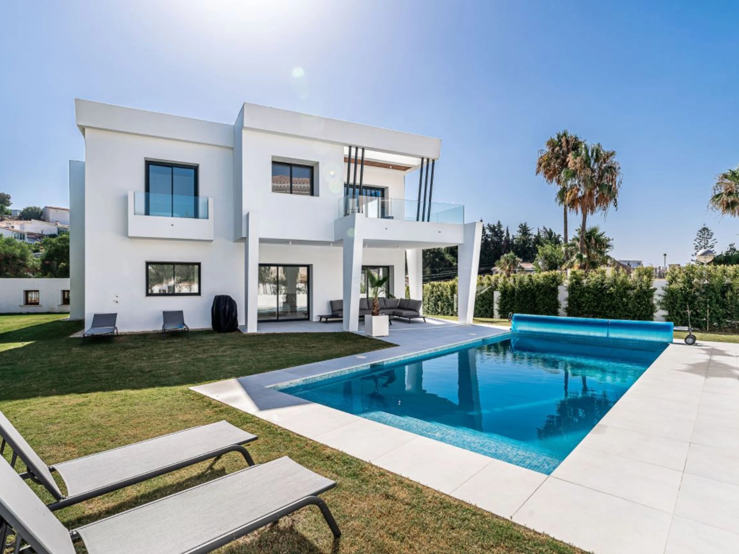 Die Unterkunft verfügt über garten, gartenmöbel, umzäuntes grundstück, 30 m² terrasse, waschmaschine, trockner, bügeleisen/-brett, safe, internet (WLAN), haartrockner, balkon, alarm, zentralheizung, klimaanlage, swimming-pool privater pool, klimatisierter pool privater pool, garage und parkplatz in auf dem grundstück, 1 Fernseher.