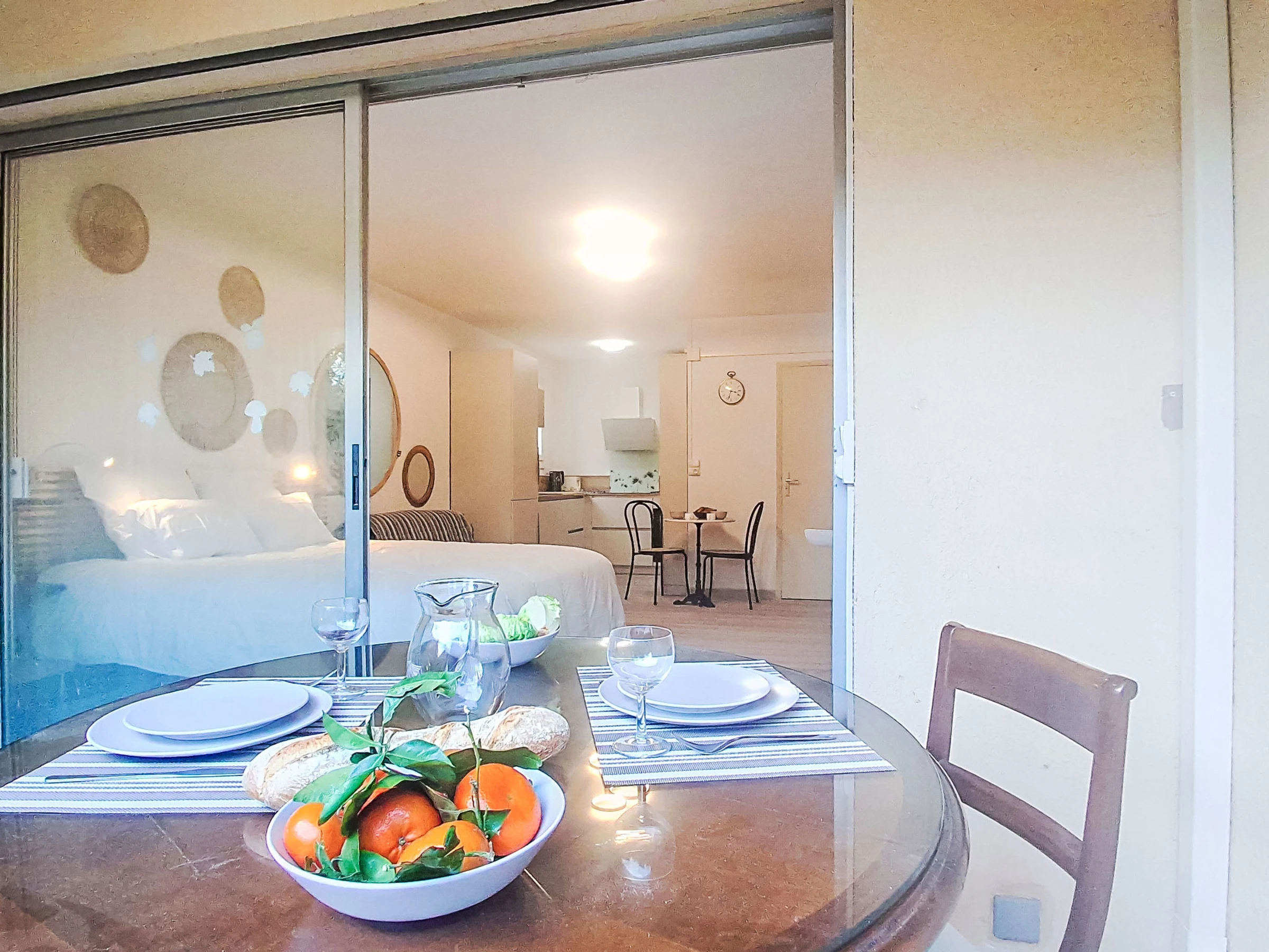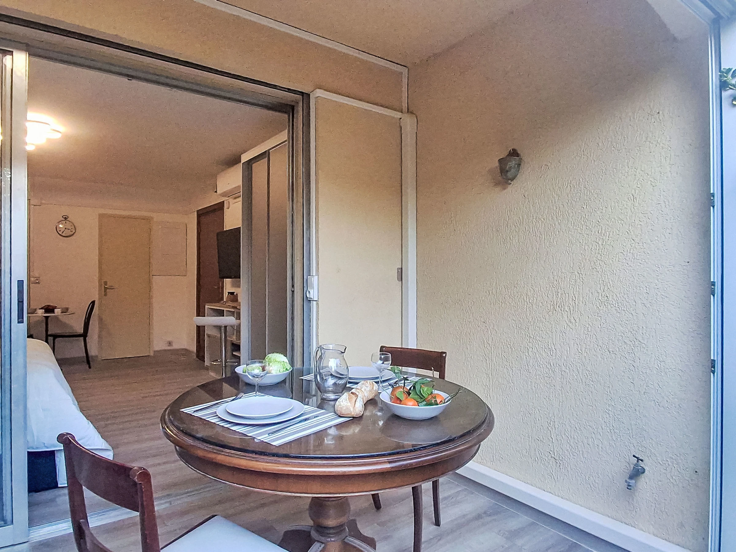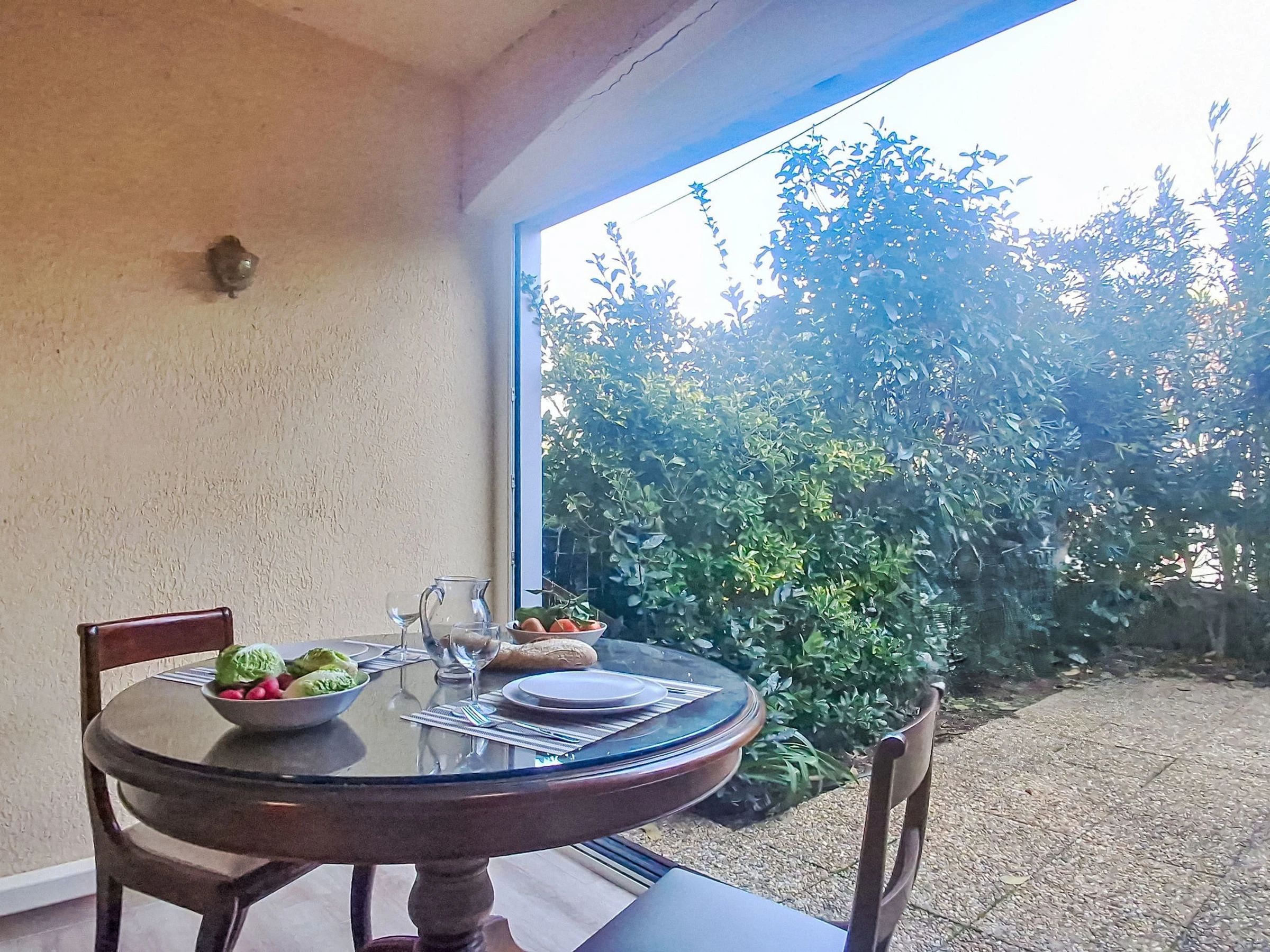 "Les trinquettes", 1-Zimmer-Wohnung 30 m2, im Erdgeschoss. Geräumig, renoviert im Jahre 2025: Wohn-/Esszimmer mit 1 franz. Bett (160 cm, Länge 200 cm), TV und Klimaanlage. Ausgang zur Terrasse, zum Gartensitzplatz. Offene Küche (3 Kochplatten, Backofen, Geschirrspüler, Toaster, Wasserkocher, Mikrowelle, Tiefkühler, elektrische Kaffeemaschine). Dusche/WC. Terrasse 10 m2, überdacht, Ostlage und Südlage. Terrassenmöbel. Zur Verfügung: Waschmaschine. Parkplatz Nr. 15 (überdacht), Höhe 200 cm, Breite 220 cm. Bitte beachten: TV nur FR. Rauchmelder, kein Fahrstuhl. Inserat einer Privatperson nach Artikel 155, IV, CGI.