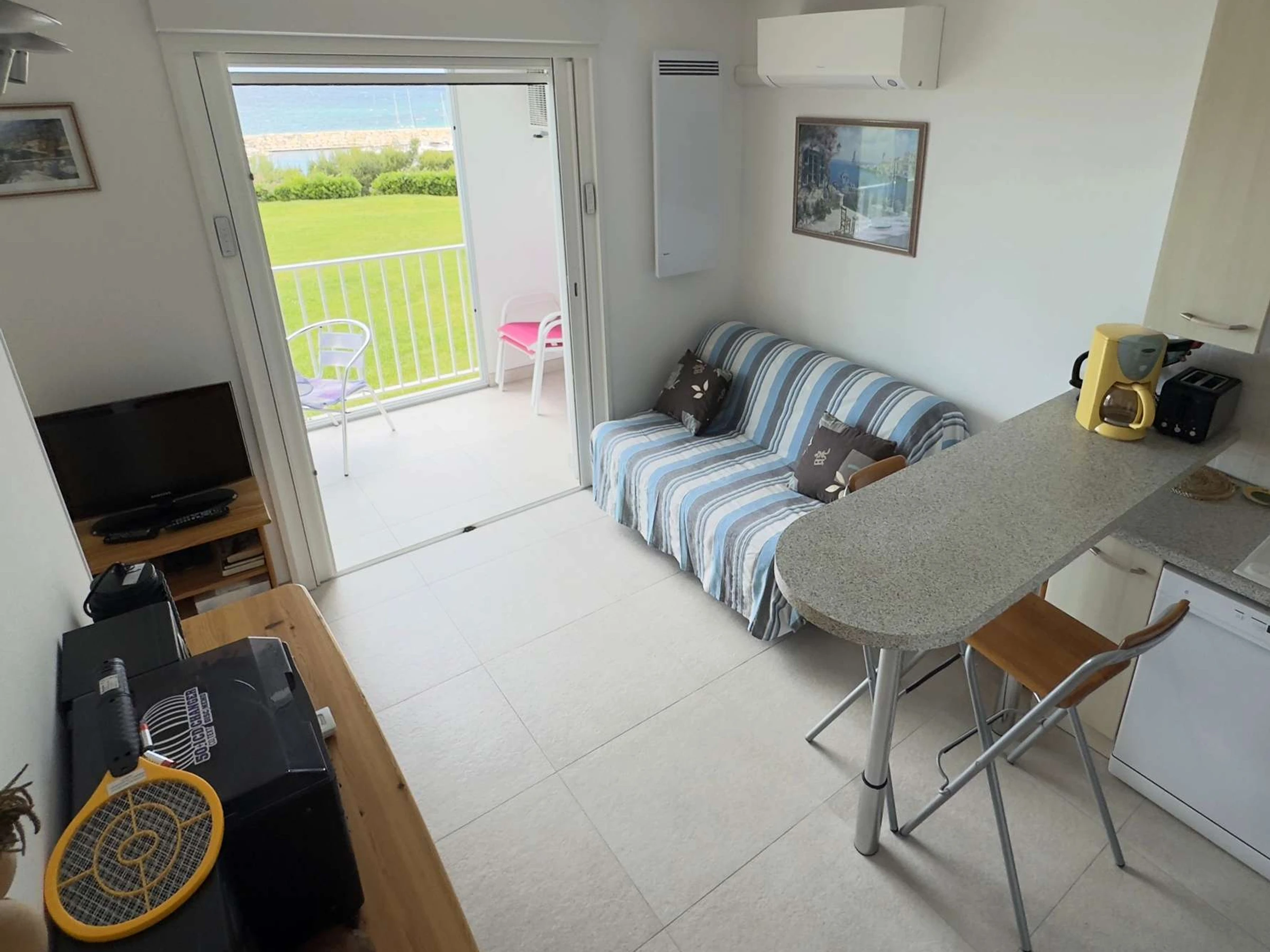 Terrasse mit Glasschiebetüren und herrlichem Panoramablick auf das Meer, ausgestattet mit 2 Relaxsesseln, Gartentisch und Stühlen – Kochnische (2-Flammen-Herd – Kühl-/Gefrierschrank – Geschirrspüler – Backofen – Mikrowelle – Filterkaffeemaschine – Wasserkocher) – Hauptraum mit Meerblick und festem Sofa, TV und Turmventilator – Schlafbereich mit Meerblick und offen zum Wohnzimmer mit 1 Doppelbett (140 cm) und Kleiderschrank – 1 Schlafzimmer mit 1 Einzel-Hochbett (90 cm), 1 Einzel-Schlafsofa (90 cm) und Kleiderschrank – Renoviertes Badezimmer mit ebenerdiger Dusche und Waschmaschine – Separates Wand-WC.