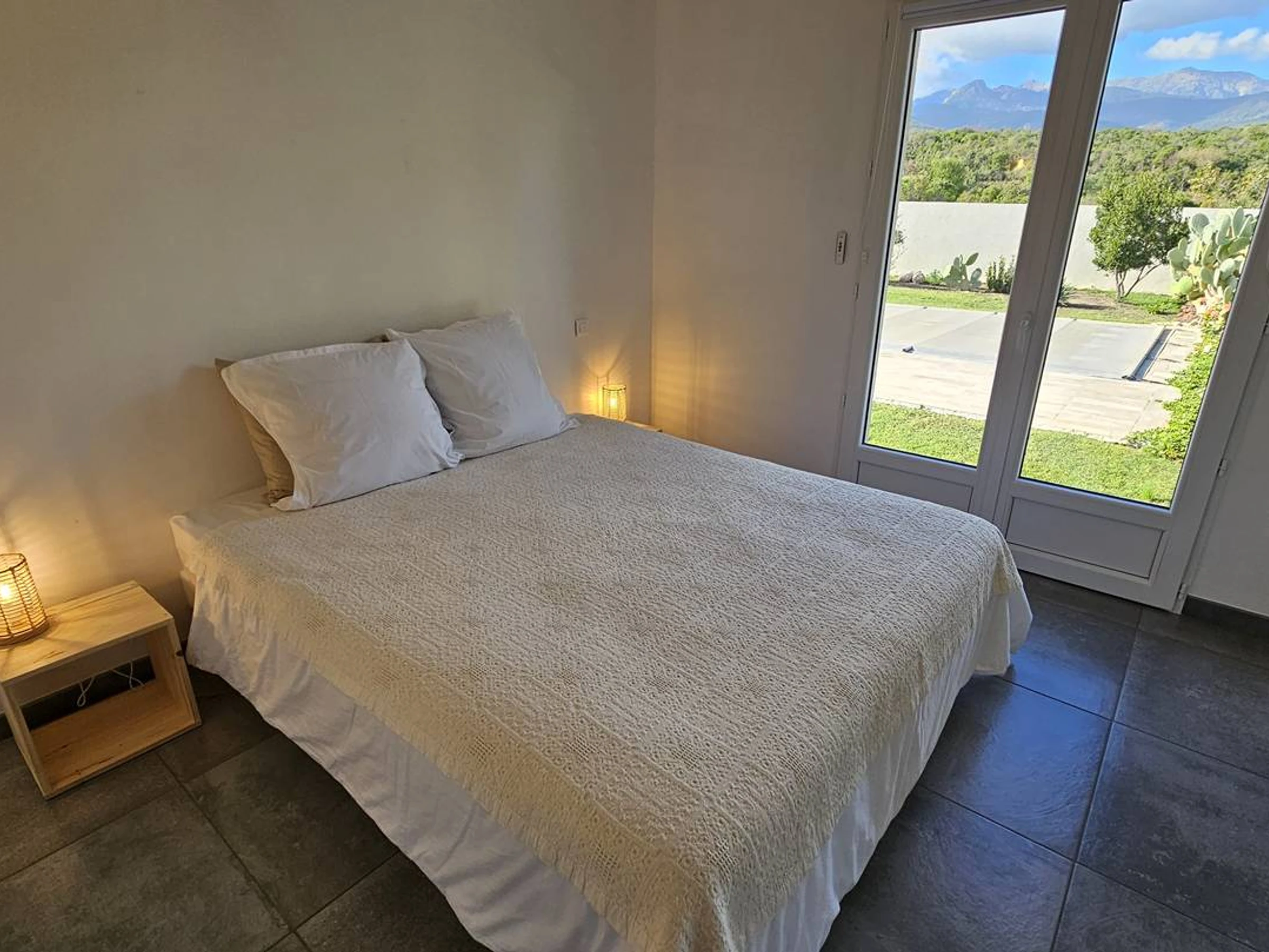 Schlafzimmer 2: Klimaanlage: 1 Bett 160/200, großer Kleiderschrank mit Kleiderstange, Blick auf den Pool und die Berge.