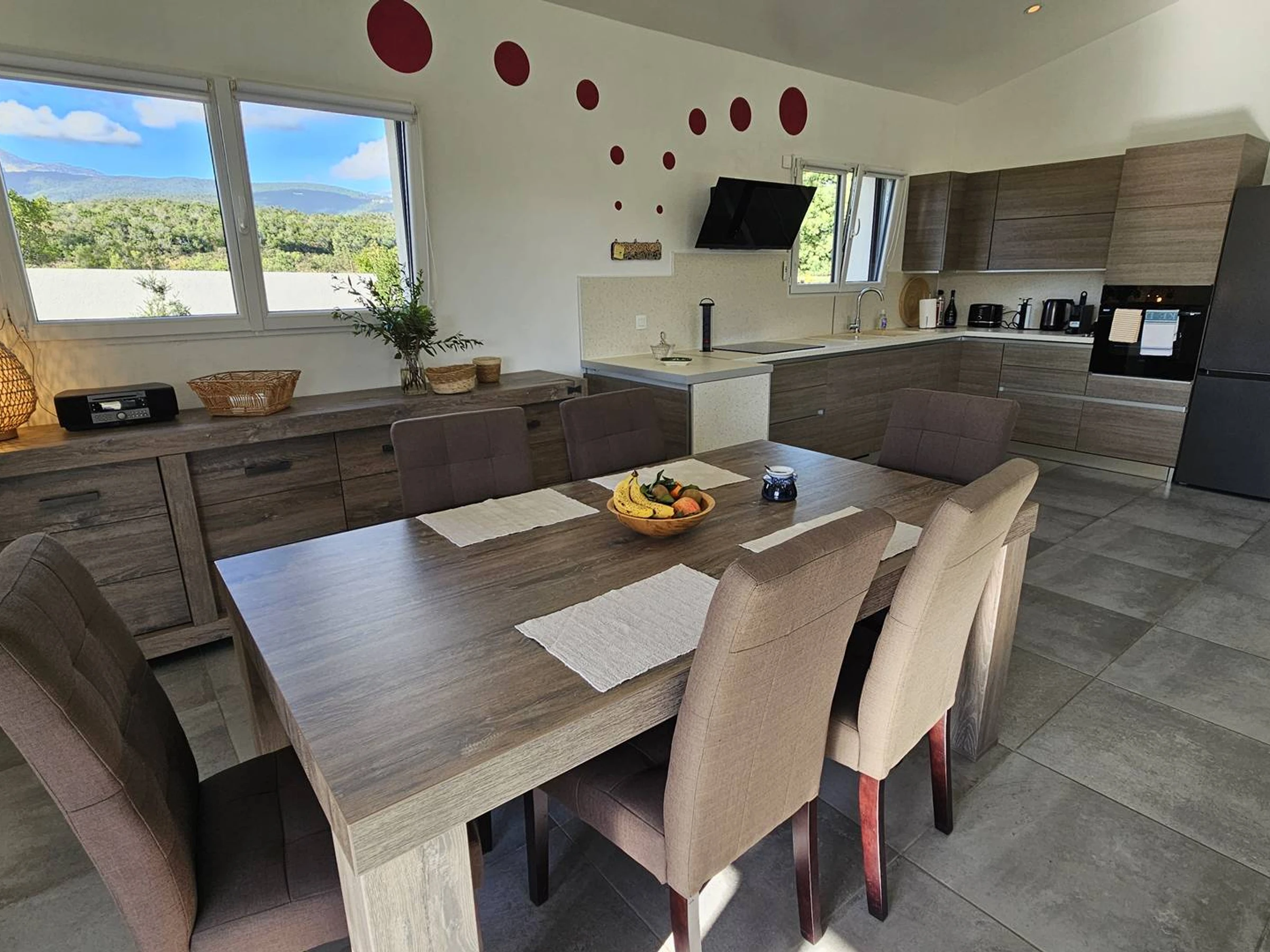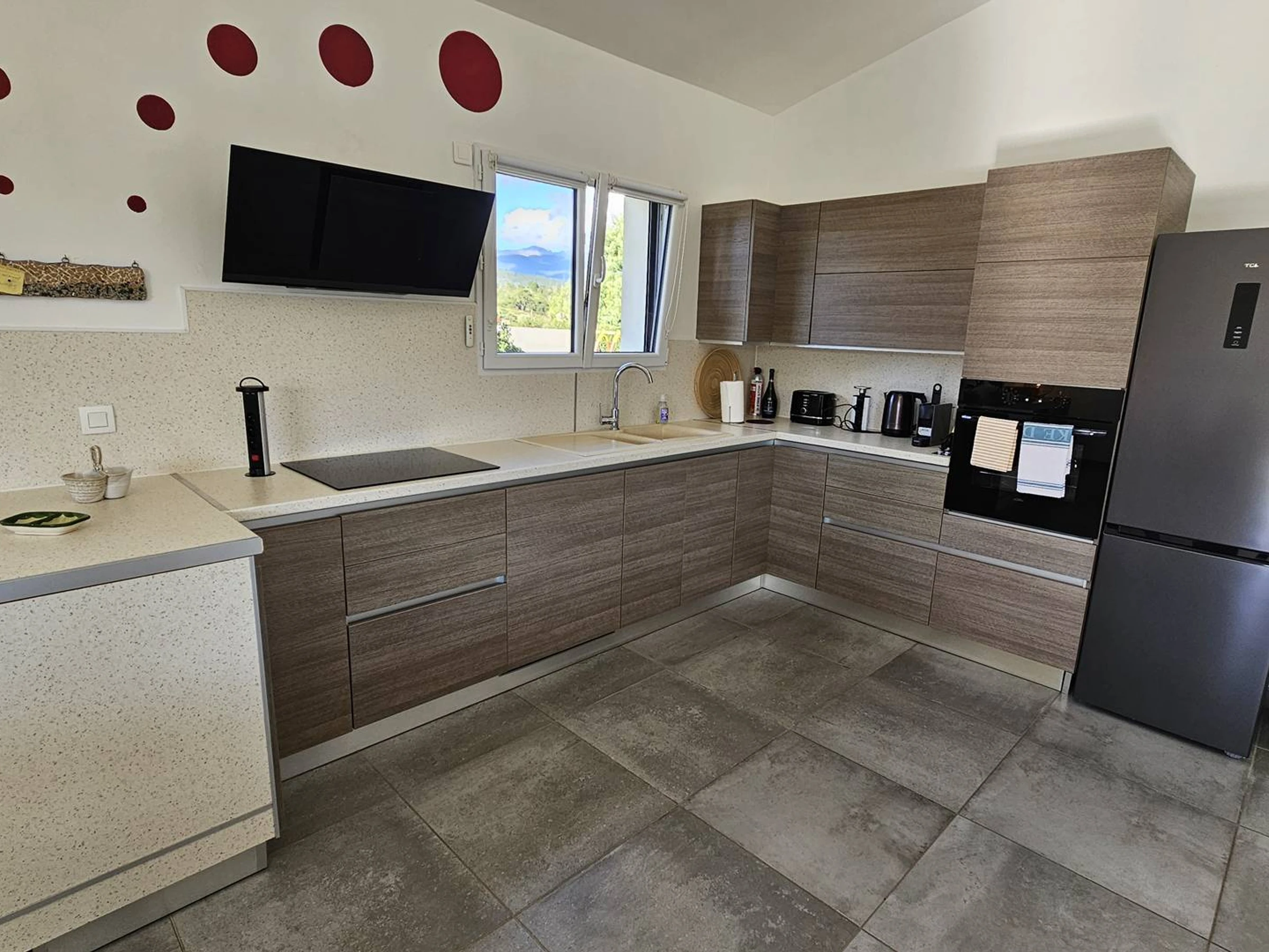 Zum Wohnzimmer hin offene Küche: Induktionskochfeld mit 3 Kochstellen, Dunstabzugshaube, Geschirrspüler, Elektroherd, Mikrowelle, Kühl-Gefrierkombination, Nespresso-Kaffeemaschine, Toaster, Wasserkocher, kleine Küchengeräte, Staubsauger ...